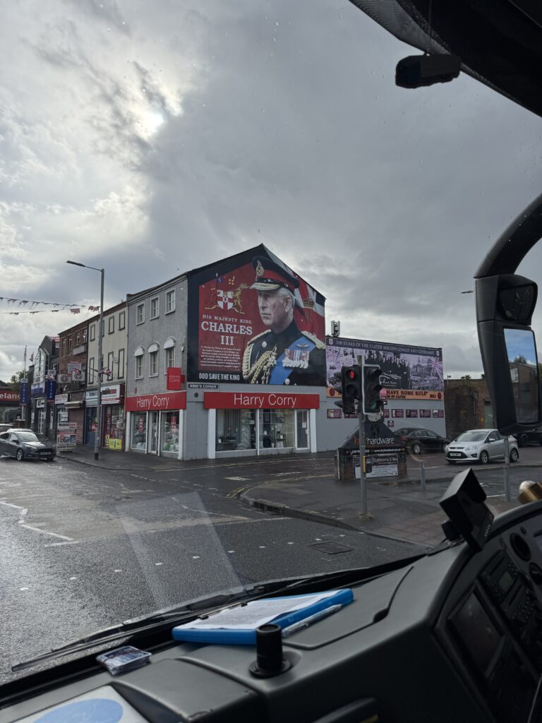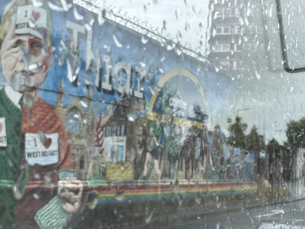 After City Hall, we were taken on a tour of the murals around Belfast. Our driver, Lindsay, gave us his personal recollections of the “troubles” in Ireland. Where before the troubles started, all the neighborhoods were integrated between the Catholics and the Protestants, once they started, people moved to one side or the other. He explained that the basic issue was not as much religion as politics. Protestant households were given one vote per individual in the household, while Catholic families received one vote per household. I’m not going to go into a lot of what he told us, if you want to know more about the troubles, check it out on Google.