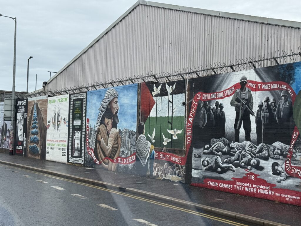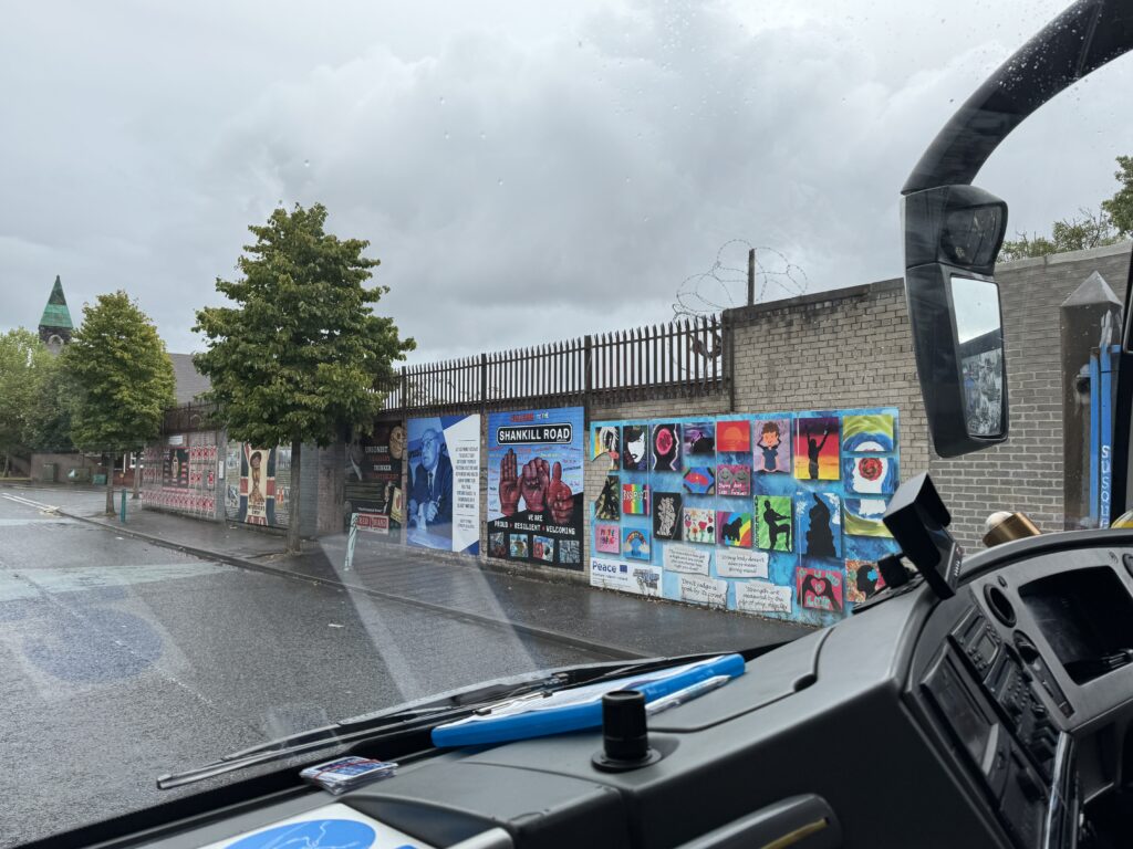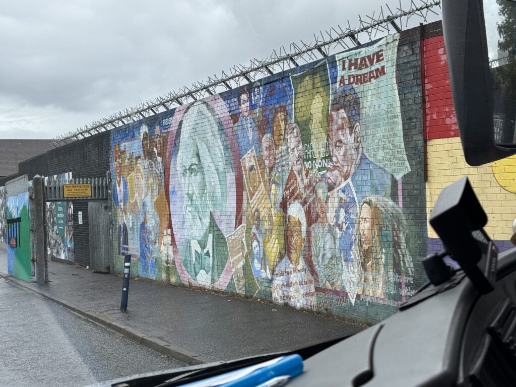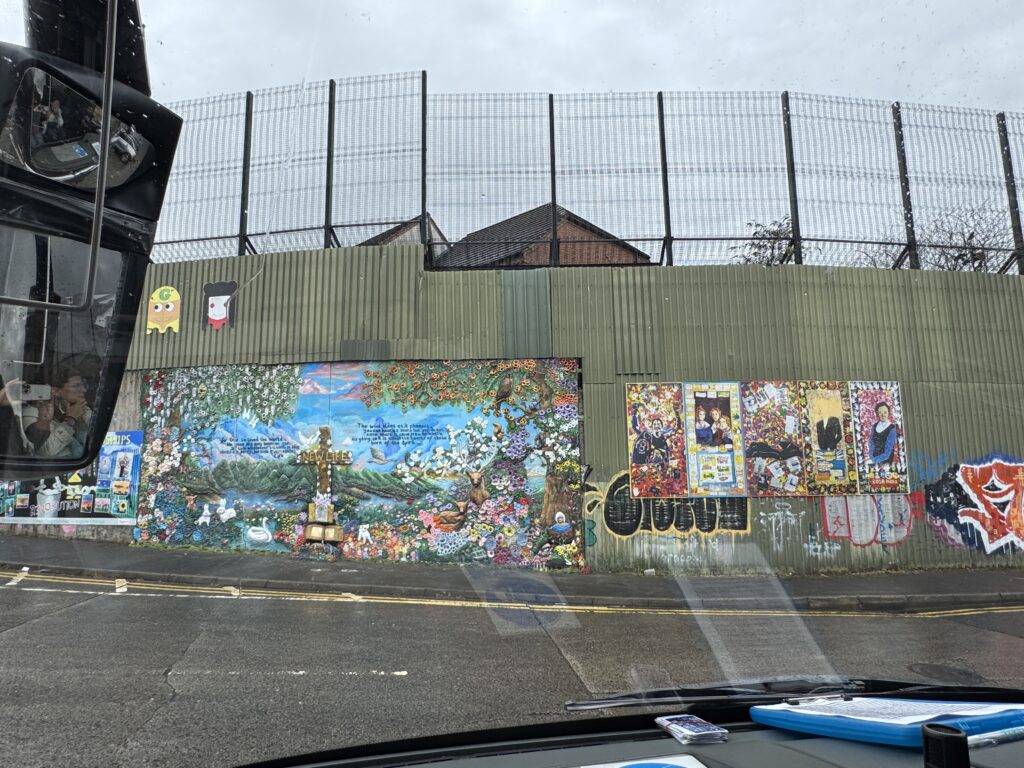 The murals around Belfast were wide and varied in subject matter as well as style. Lindsay drove us through the Peace Gates which were separated the two sides of Belfast. The Peace Wall, he explained, was built in stages as each time the wall needed to be taller to keep items from being thrown over the top. We stopped at the Peace Wall and we were all given an opportunity to add our names to the wall in the name of peace.
