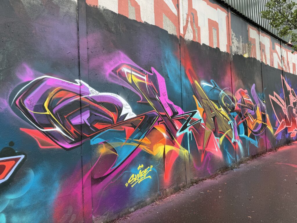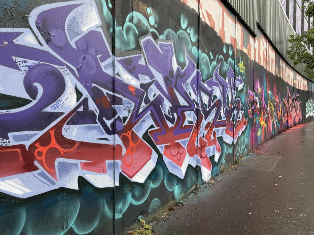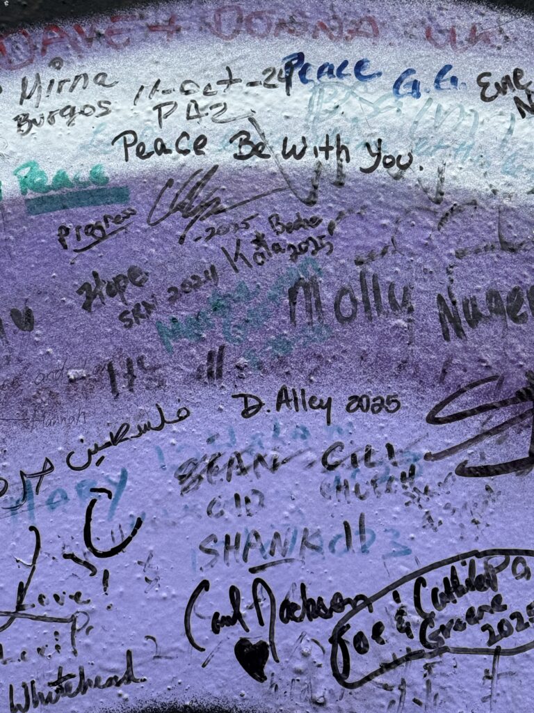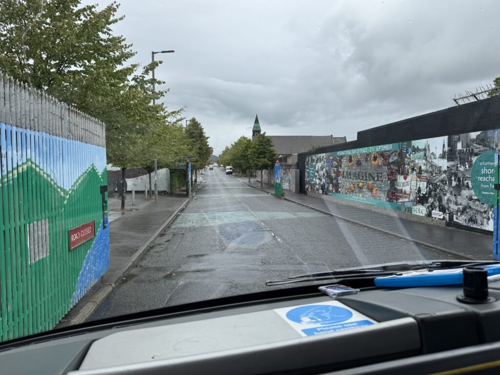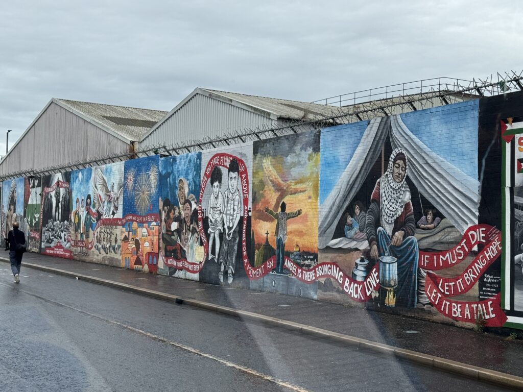 The murals around Belfast were wide and varied in subject matter as well as style. Lindsay drove us through the Peace Gates which were separated the two sides of Belfast. The Peace Wall, he explained, was built in stages as each time the wall needed to be taller to keep items from being thrown over the top. We stopped at the Peace Wall and we were all given an opportunity to add our names to the wall in the name of peace.