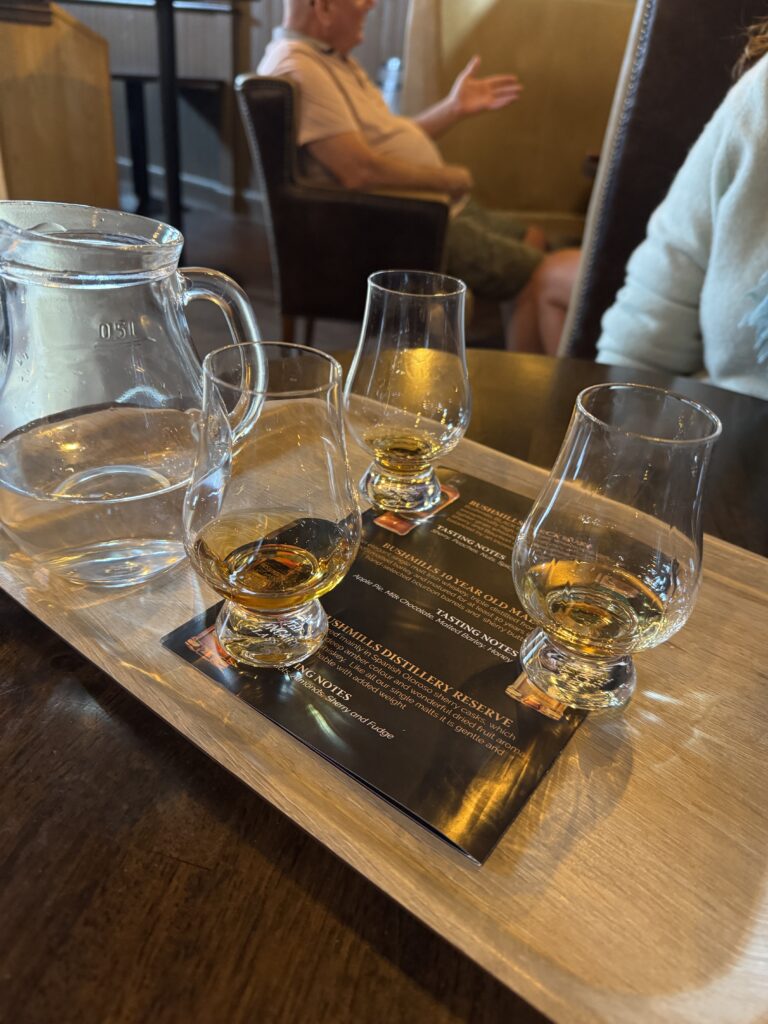 After all that exercise, it was time for some refreshment at the Bushmills Distillery. We were only given thirty minutes, so we shared a quick flight (remember we get off the bus first, so we also got to the bar first!) and then back on the bus.