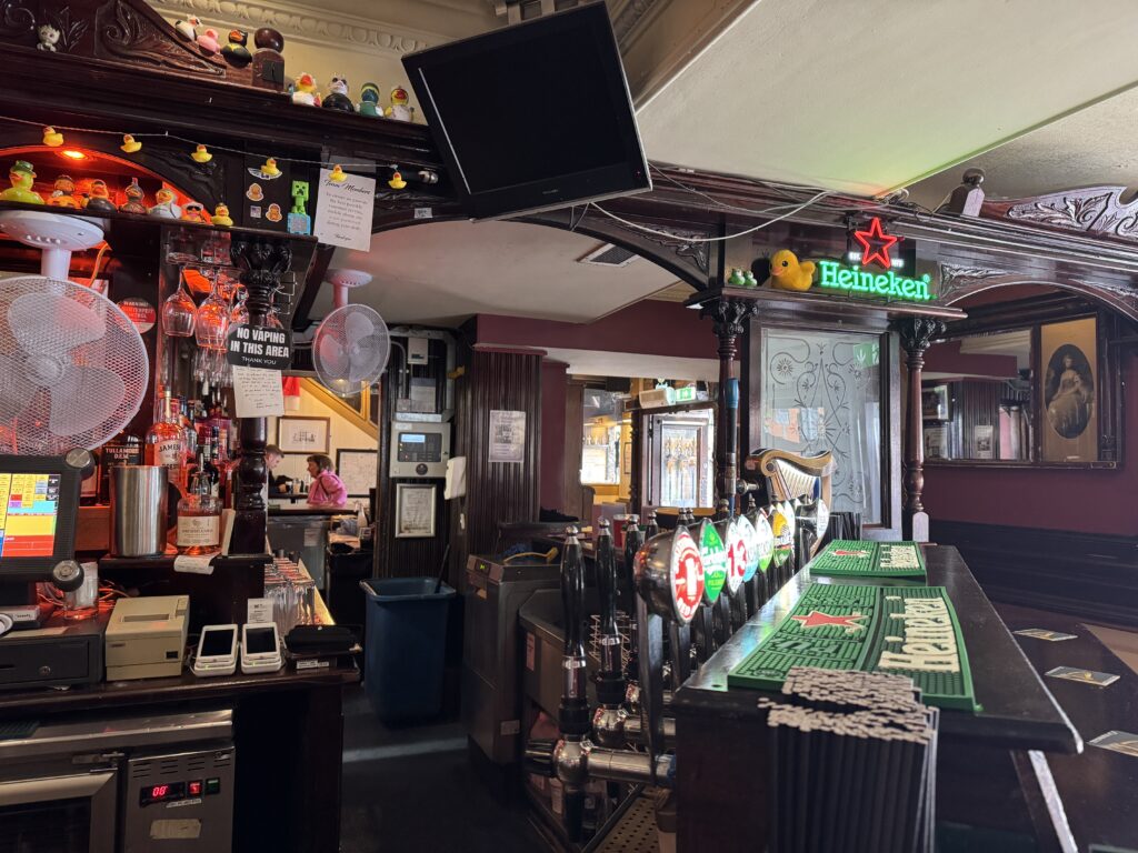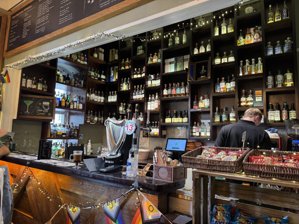 Today, we had no tour. We had to sign up for a slot to tender to the shore from the ship and then we had to take a train about twenty minutes into Dublin. From there, we walked around at our leisure and explored. We found Trinity College, but as it was raining pretty hard, we found a place out of the rain and met a very nice Irish man from Galway. After talking with John for about twenty minutes, the rain let up and we moved on to the Irish Whiskey Museum across the street. Unfortunately, they were not very quick with service and we gave up and went to the Temple Bar District instead. We found a nice little market and had our first fish and chips in Ireland. Disappointingly, Leo Burdock’s Famous Fish and Chips were terrible! The fish was so overcooked that it tasted like straw. Maybe we just got there at a bad time? After Leo’s we went to the Quays bar and I had a Guinness while Diana had a Bailey’s coffee.
