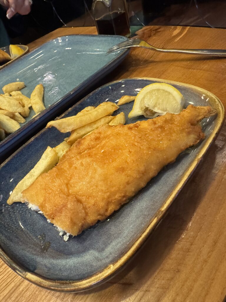With nothing specific on the itinerary this afternoon, we decided to get our bearing and walk down to Buckingham Palace. I was here about 47 years ago, and you’ll never guess, things haven’t changed much at all. Since Charles was apparently not in town, we headed back towards our hotel with one task in mind – find some good fish and chips to erase the memory of the fish we had in Dublin. With much relief, we found some traditional fish and chips and a couple of drinks. Retiring back to our hotel at the very “late” hour of 8 pm, we put on our jammies and I am finally caught up with this blog. Tomorrow we are going to see Hadestown at the Lyric Theater so I will call it a very early night and look forward to sleeping in tomorrow.