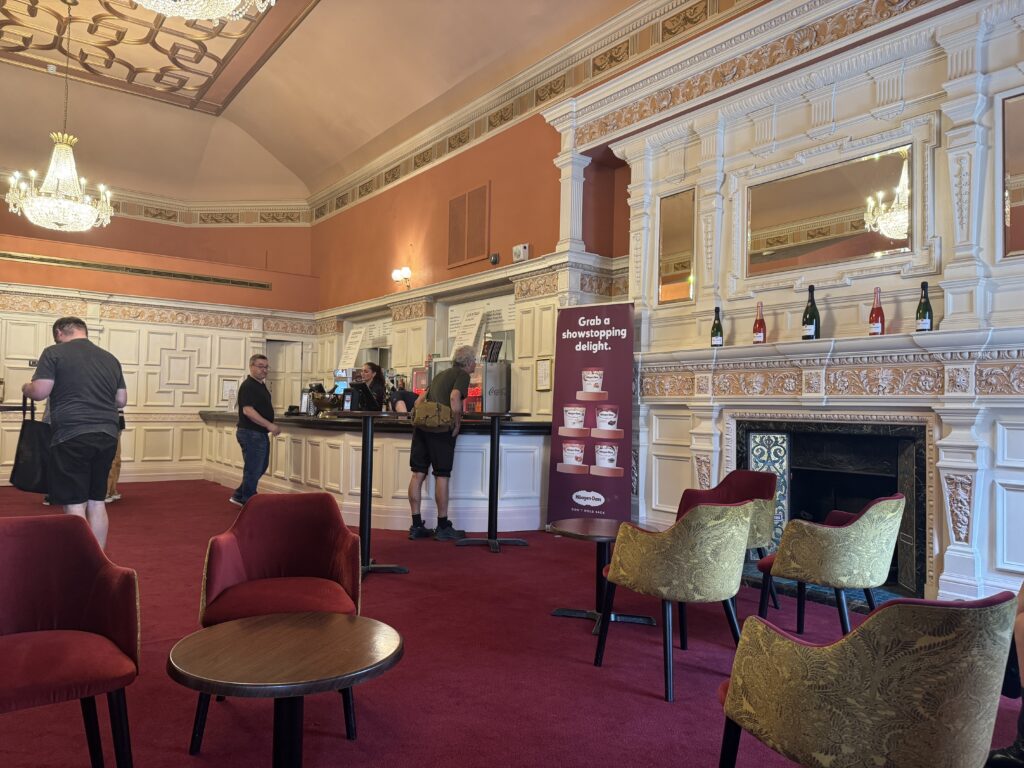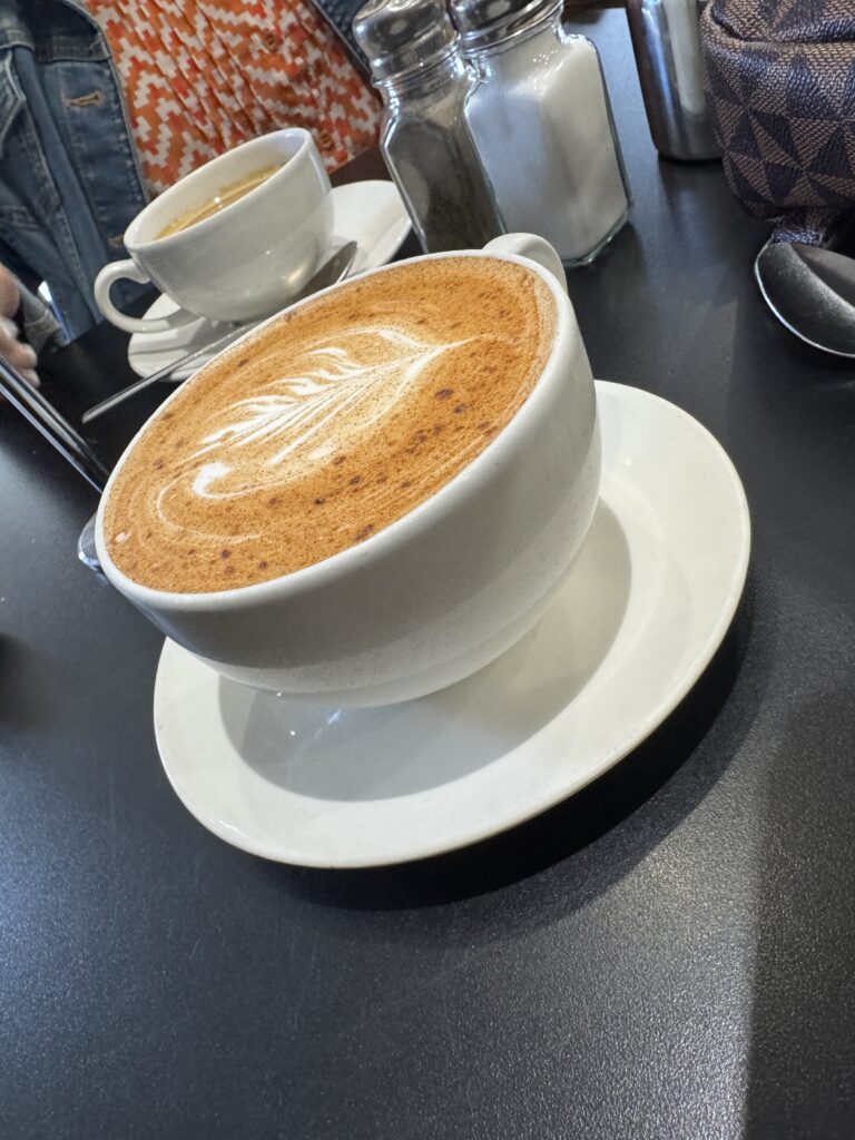 The Dockyards were an interesting place to wander and we quickly found the cafe which turned out to be pretty much a case of pastries and coffee. Diana was wanting a bit more breakfast than pastry and coffee so we decided to check out the restaurant. The restaurant was in Dockhouse 4 which was hosting an exhibition of women and the sea. We walked upstairs to the restaurant and were escorted to a table by the windows with a gorgeous view of the water. We ordered a Bacon Bap (a breakfast sandwich) with a fried egg and an order of scones. The waiter asked if we wanted the scones afterward, which seemed by his tone of voice to be the obvious choice, so we agreed. We also ordered a couple of flat whites which were very artfully decorated. The baps contained a very generous portion of bacon and a beautifully cooked egg. By the time we finished our baps, we were stuffed and had to pass on the scones. 🥲