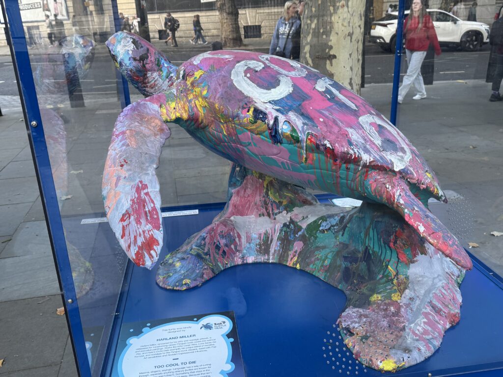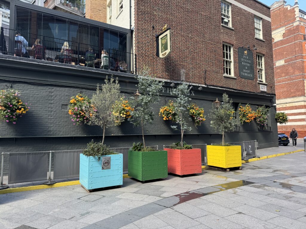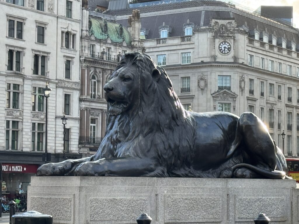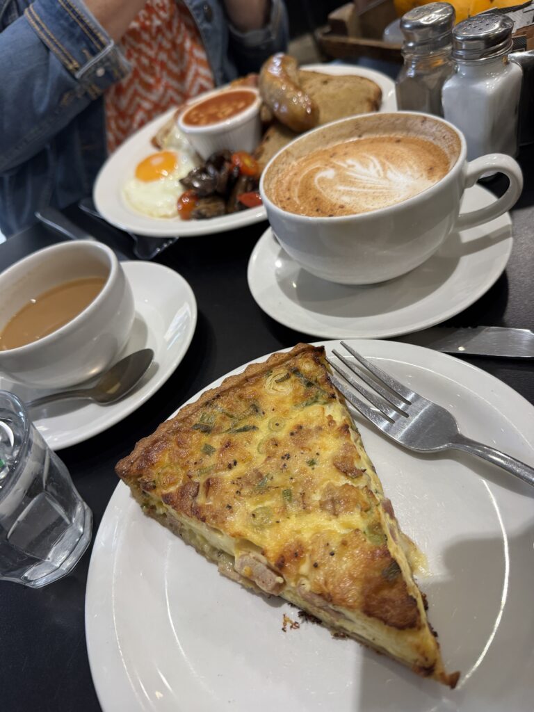 Today we are headed to the West End to see a show. It’s only about a mile and a half, so we decided to stroll and take in the sights. First, breakfast at Pimlico Fresh. The owner/manager was a very friendly Brit who welcomed us in and gave us the scoop. The menu was on the wall – I ordered a slice of quiche Lorraine and Diana got a full English breakfast. The chai latte was one of the best I’ve had over here!