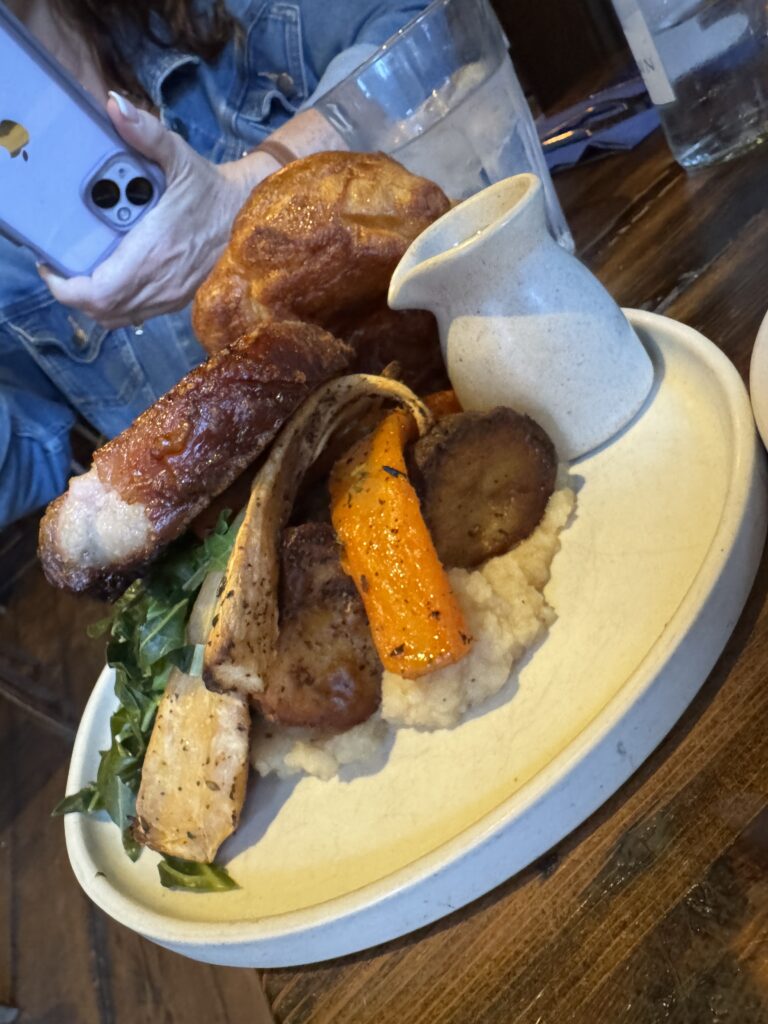 We ended up in Trafalgar Square and then decided we needed to find some dinner. We checked Maps and found The Clarence (literally right next to us) and decided to give it a try. We shared a pork belly roast with more trimmings than I think I’ve ever seen outside of Thanksgiving – potatoes, roasted in duck fat, braised red cabbage, Yorkshire pudding (turns out it is really more of a roll than a pudding), roasted carrots and parsnips, and a celeriac puree that was delicious! We finished our meal off with a traditional sticky pudding and headed back toward the hotel. At one point Maps took us on a shortcut which we followed with a bit of trepidation, but it actually turned out to be a very good shortcut. Tomorrow we have an eleven hour tour of Windsor Castle, Bath, and Stonehenge, so we hit the hay early to get our beauty sleep.