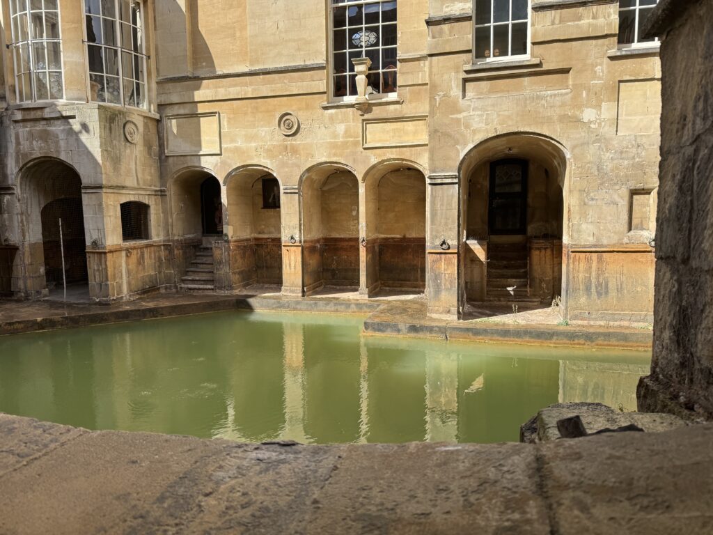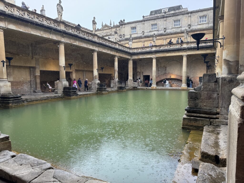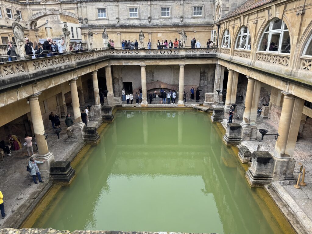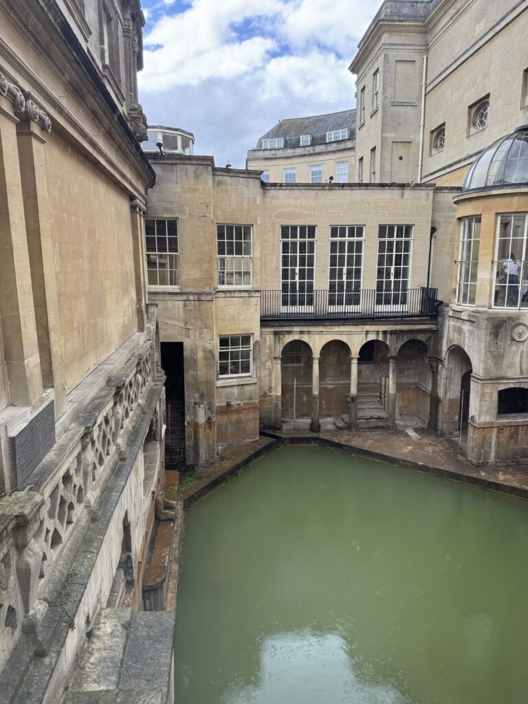 From Windsor, we drove to Bath, the site of the only still working Roman Baths. If you have never seen a natural, hot, mineral bath, you might think this looks disgusting, but it is not dirty, it is the minerals in the water that make it green. This bath is still filled from natural hot springs. At the end of the tour, we even got to taste the water. It wasn’t my favorite, but it was potable and apparently good for you, too.
