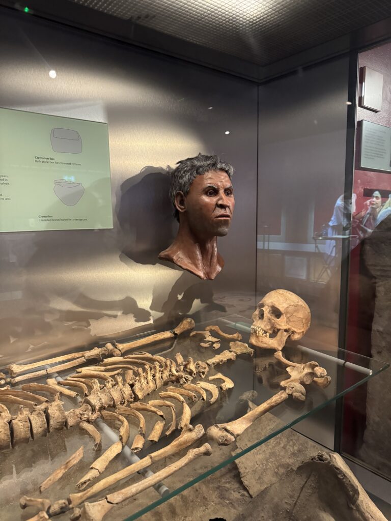 We proceeded on to Skara Brae, a Neolithic community that was discovered in 1850 when a storm blew the sand off of the ruins that had been hidden under a sand dune. The community was active around 3100 BC to 2500 BC. There are nine houses that are all very similar in set up. Each house has a “dresser”, a set of shelves, beds built into the walls that would have been warmed by straw, furs, and the fire in the hearth in the middle of the house. The houses were connected by covered pathways between them. There is also a drainage system suggesting that the community was relatively advanced. One other structure seems to be a communal building and tools were found there suggesting a workshop. First we toured a replica of House 7 and then we proceeded back in time to see the ruins themselves.