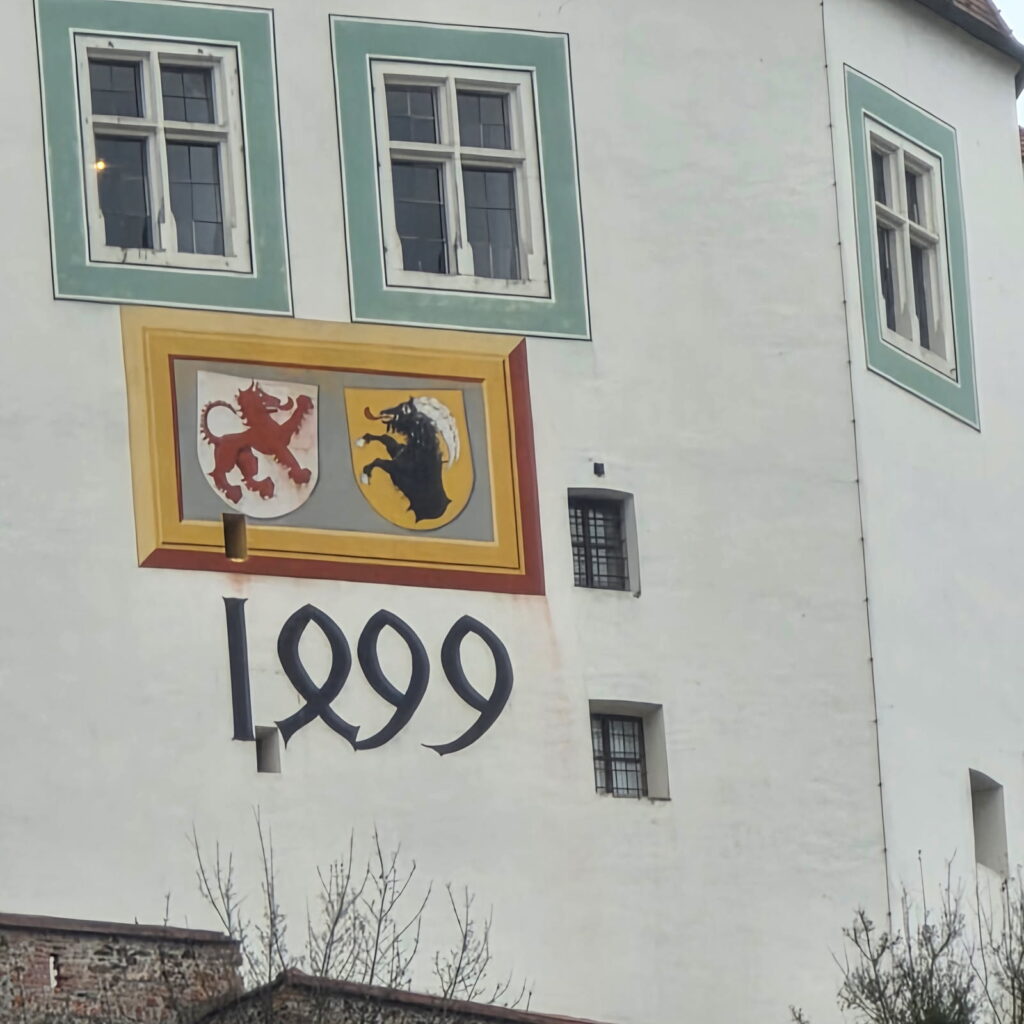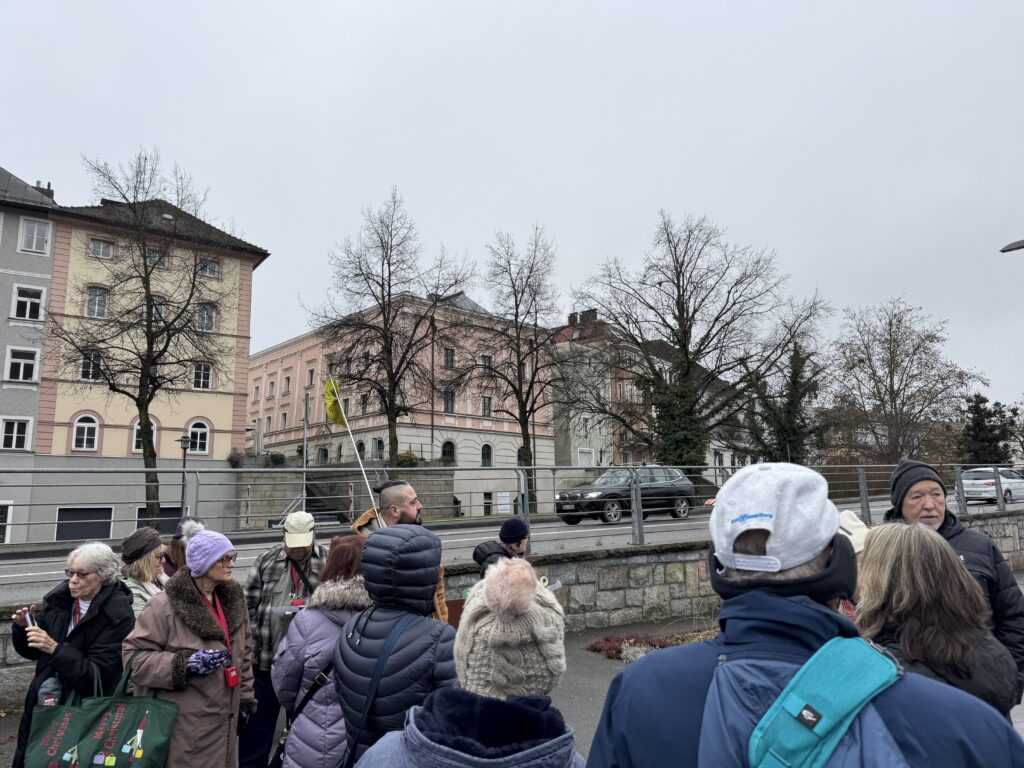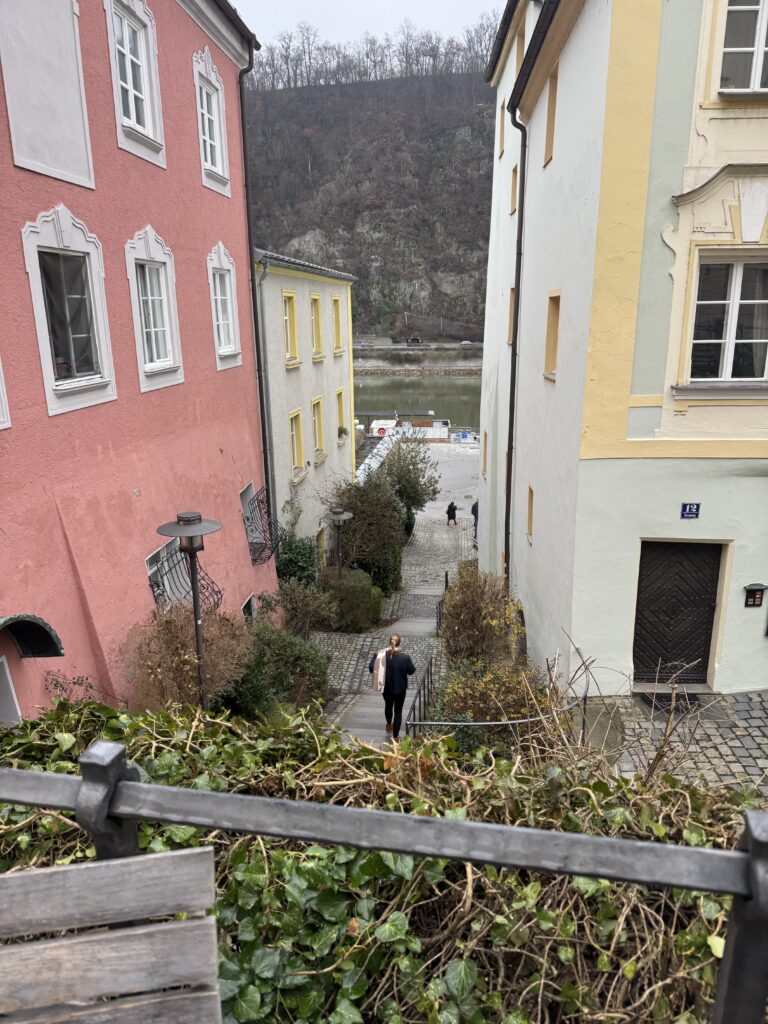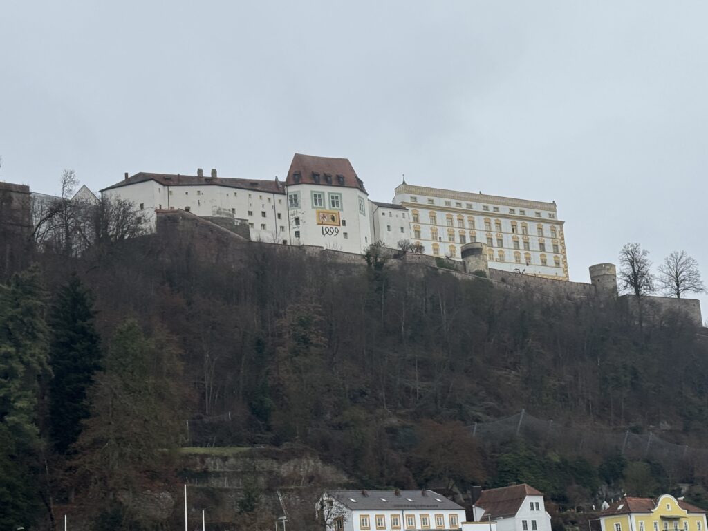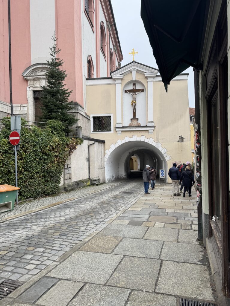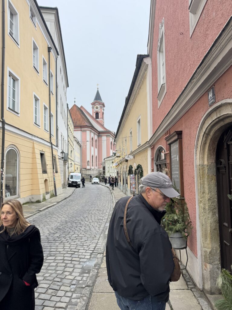 Today we arrived in Passau. Passau sits at the confluence of three rivers: the Danube, the Inn, and the Ilz. We started the morning with a presentation by a local guide on Christmas traditions in Germany and then a walking tour of Passau ending, of course, at the Weinachtsmarkt (Christmas Market). First we walked along the river where we could see the Feste Überhaus on the top of the mountain, castle of the Prince Bishop of Passau. We were surprised to see that most of the windows were painted on the castle. Our guide explained that was for defensive and privacy purposes since the Prince Bishops were not well liked due to their participation (and corruption) in collecting taxes. The date on the castle is 1499, not 1999. The second number is “one half of an eight”. The walls around the city center are not defensive walls, but flood control. The numbers on the side of the church show the various floods. The flood of 2013 was second only to 1501.