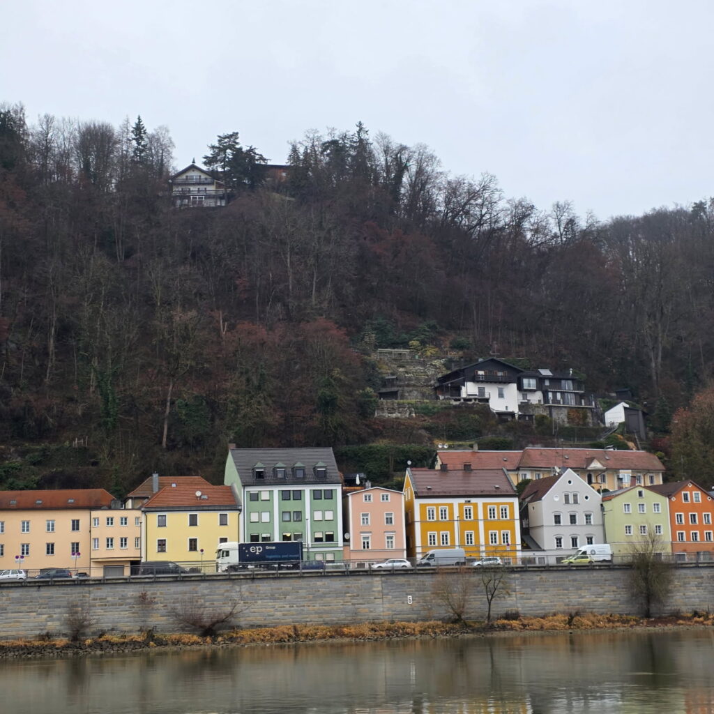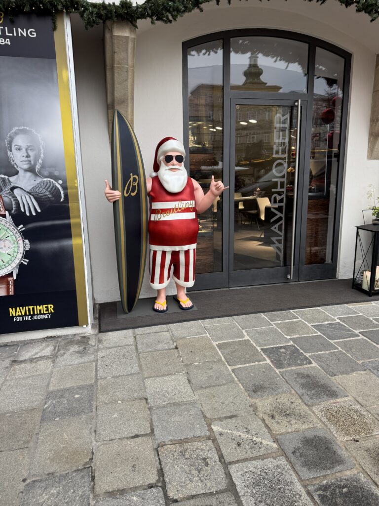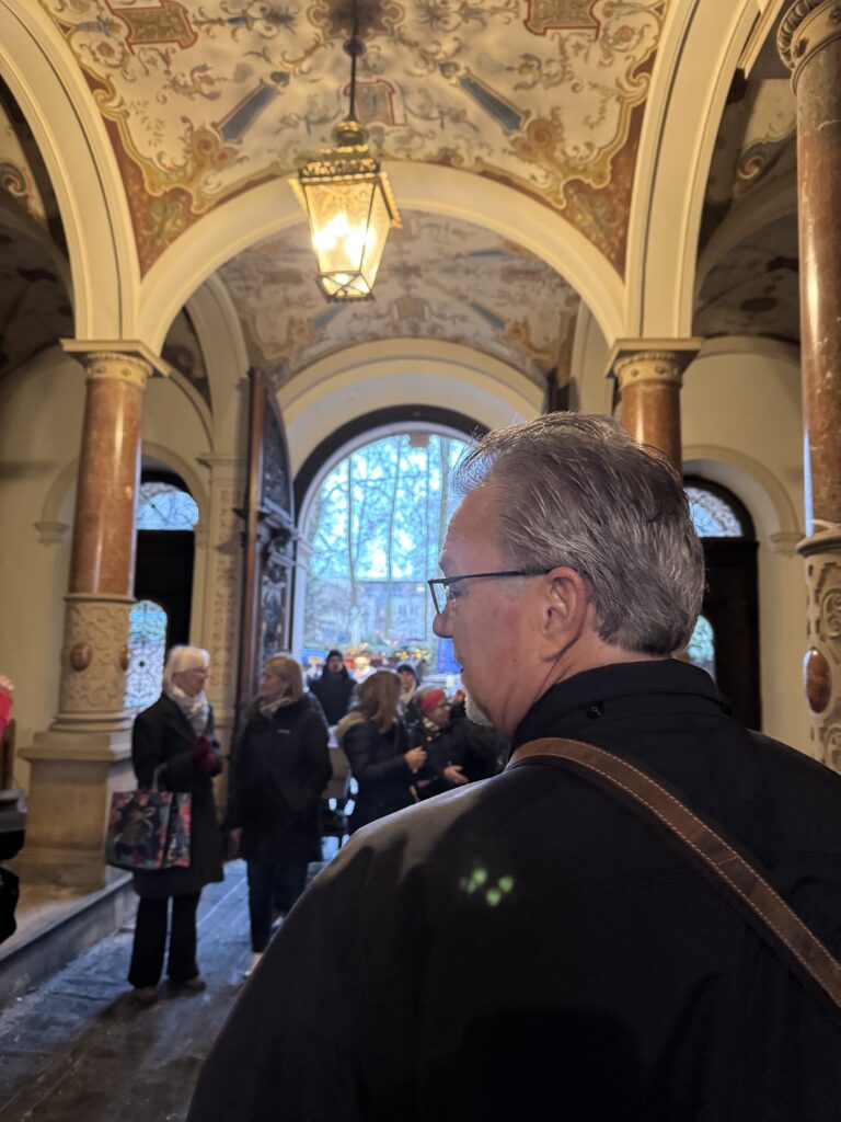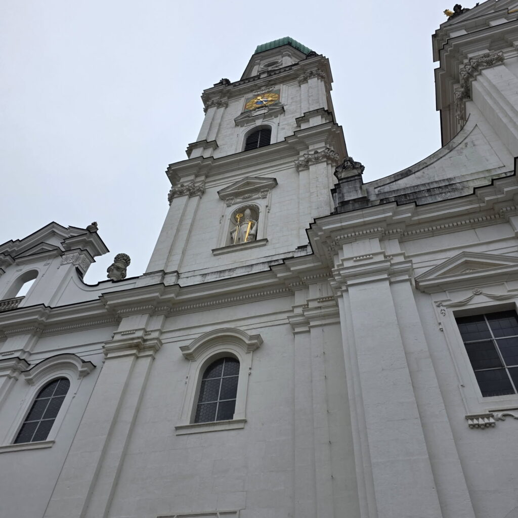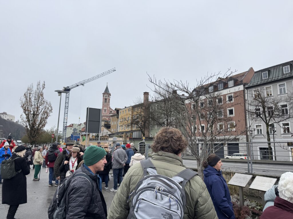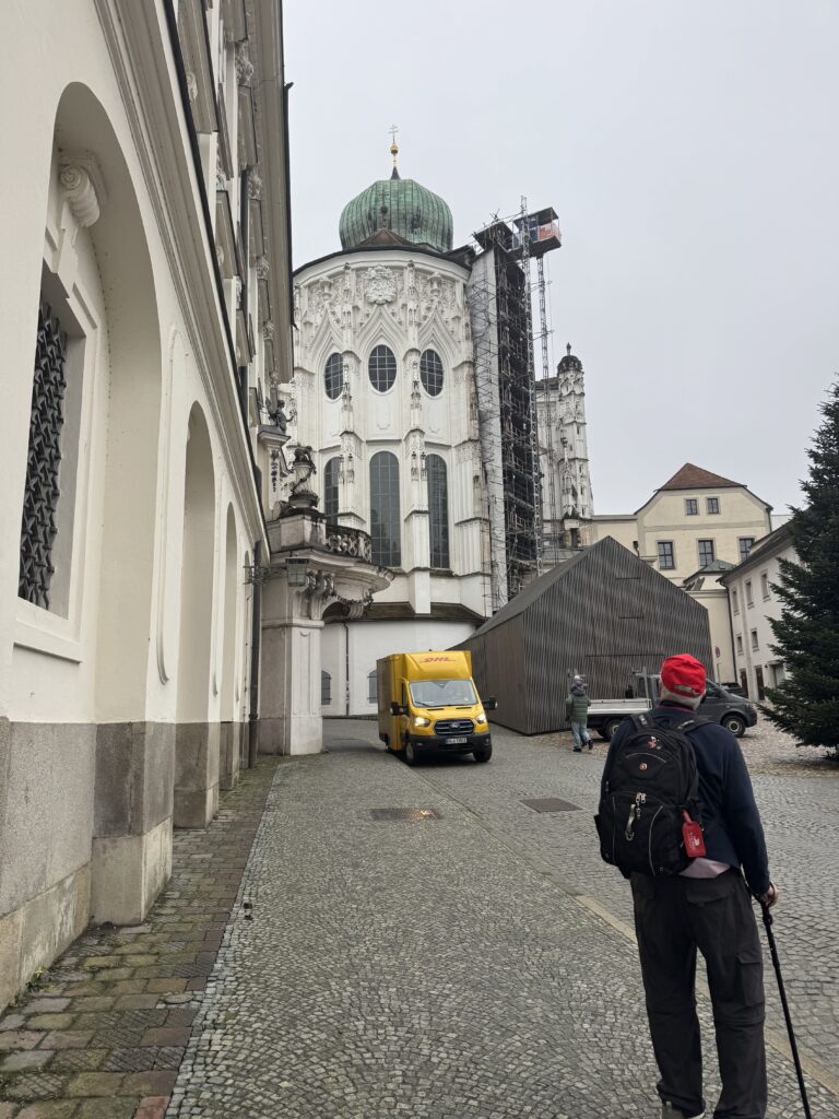 Today we arrived in Passau. Passau sits at the confluence of three rivers: the Danube, the Inn, and the Ilz. We started the morning with a presentation by a local guide on Christmas traditions in Germany and then a walking tour of Passau ending, of course, at the Weinachtsmarkt (Christmas Market). First we walked along the river where we could see the Feste Überhaus on the top of the mountain, castle of the Prince Bishop of Passau. We were surprised to see that most of the windows were painted on the castle. Our guide explained that was for defensive and privacy purposes since the Prince Bishops were not well liked due to their participation (and corruption) in collecting taxes. The date on the castle is 1499, not 1999. The second number is “one half of an eight”. The walls around the city center are not defensive walls, but flood control. The numbers on the side of the church show the various floods. The flood of 2013 was second only to 1501.
