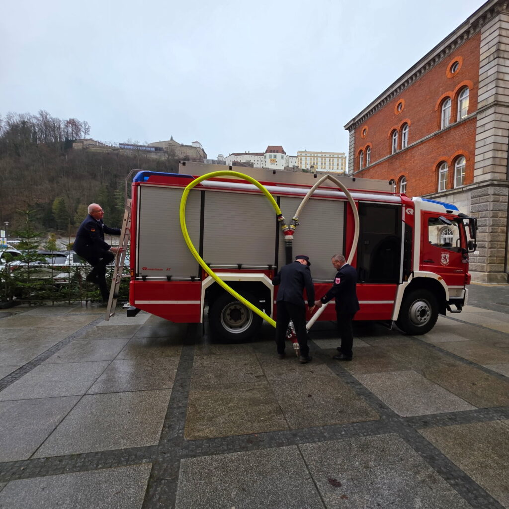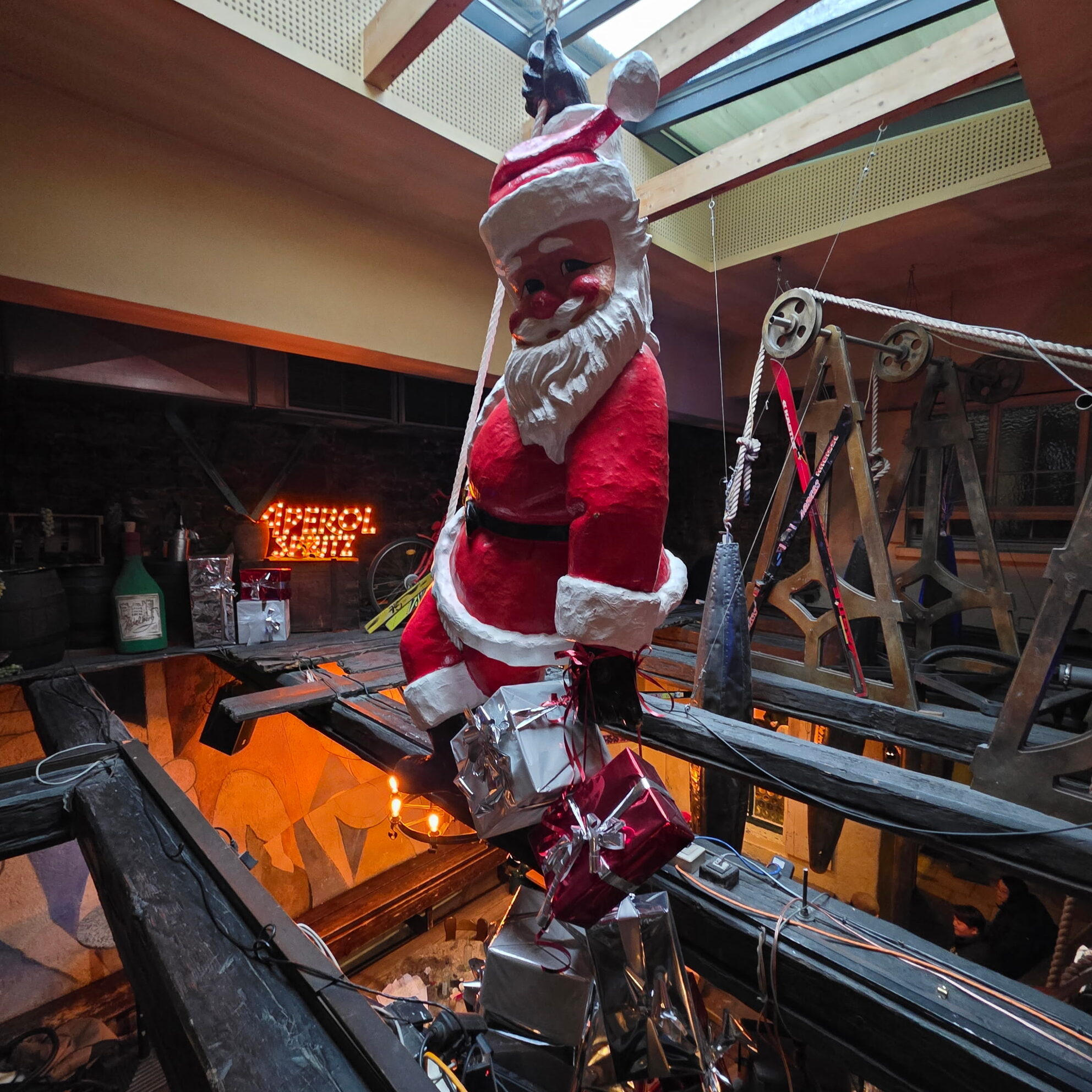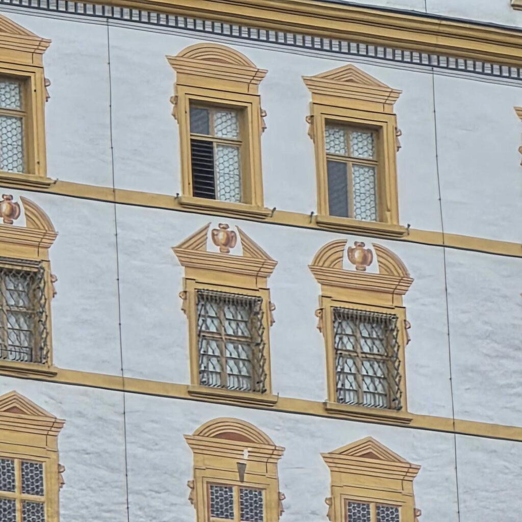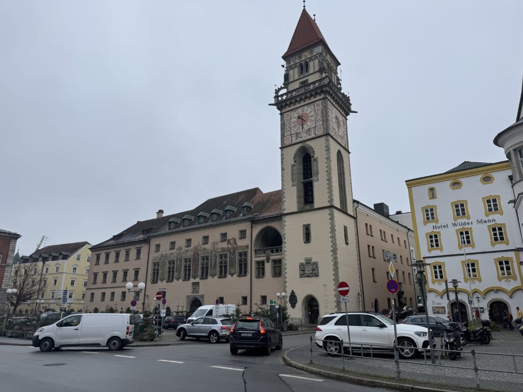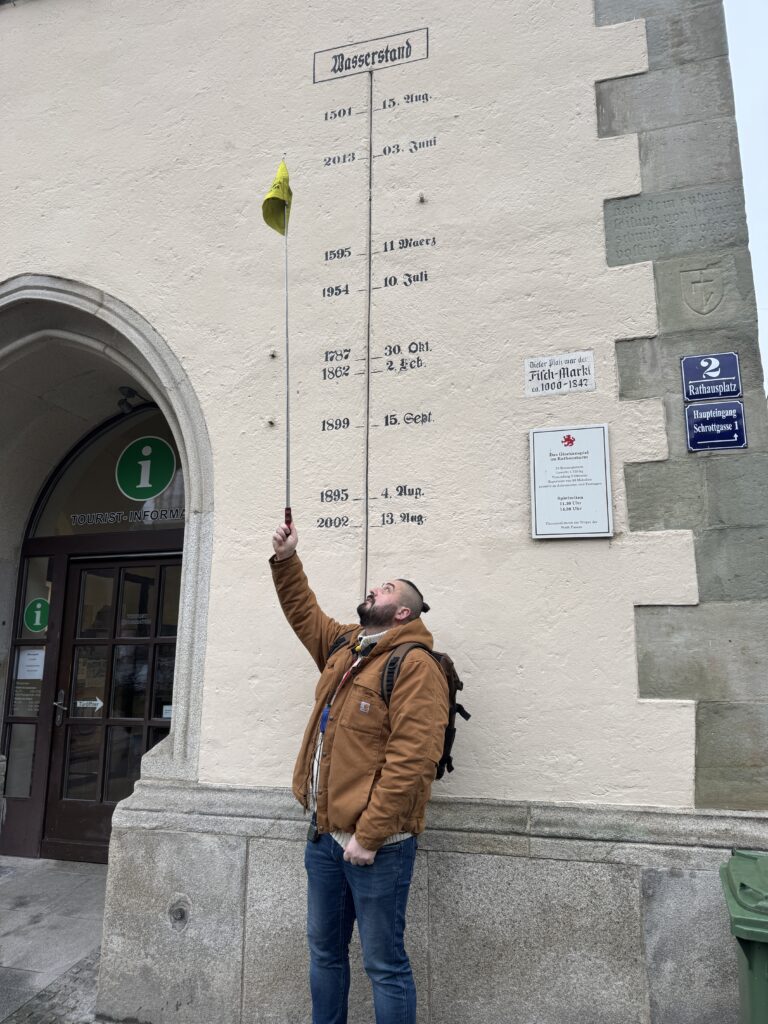 Today we arrived in Passau. Passau sits at the confluence of three rivers: the Danube, the Inn, and the Ilz. We started the morning with a presentation by a local guide on Christmas traditions in Germany and then a walking tour of Passau ending, of course, at the Weinachtsmarkt (Christmas Market). First we walked along the river where we could see the Feste Überhaus on the top of the mountain, castle of the Prince Bishop of Passau. We were surprised to see that most of the windows were painted on the castle. Our guide explained that was for defensive and privacy purposes since the Prince Bishops were not well liked due to their participation (and corruption) in collecting taxes. The date on the castle is 1499, not 1999. The second number is “one half of an eight”. The walls around the city center are not defensive walls, but flood control. The numbers on the side of the church show the various floods. The flood of 2013 was second only to 1501.