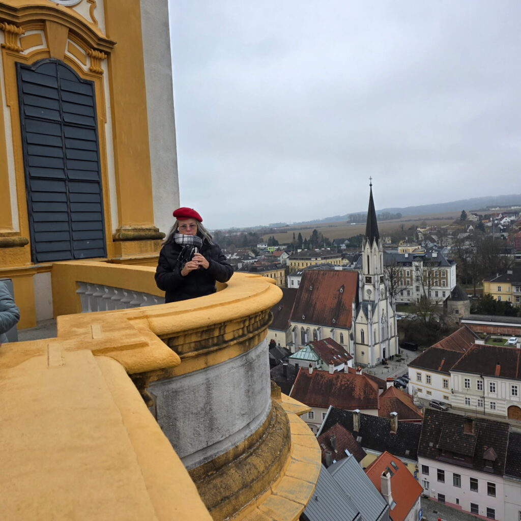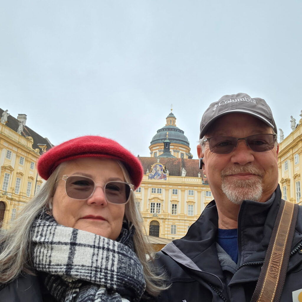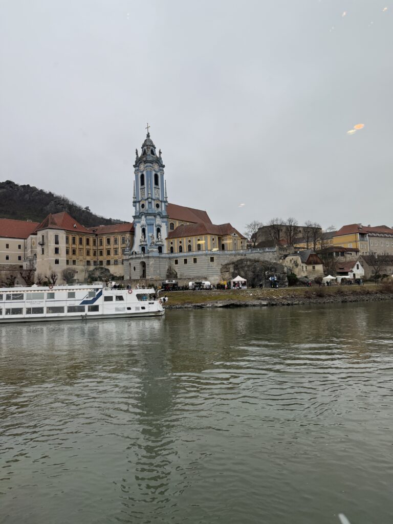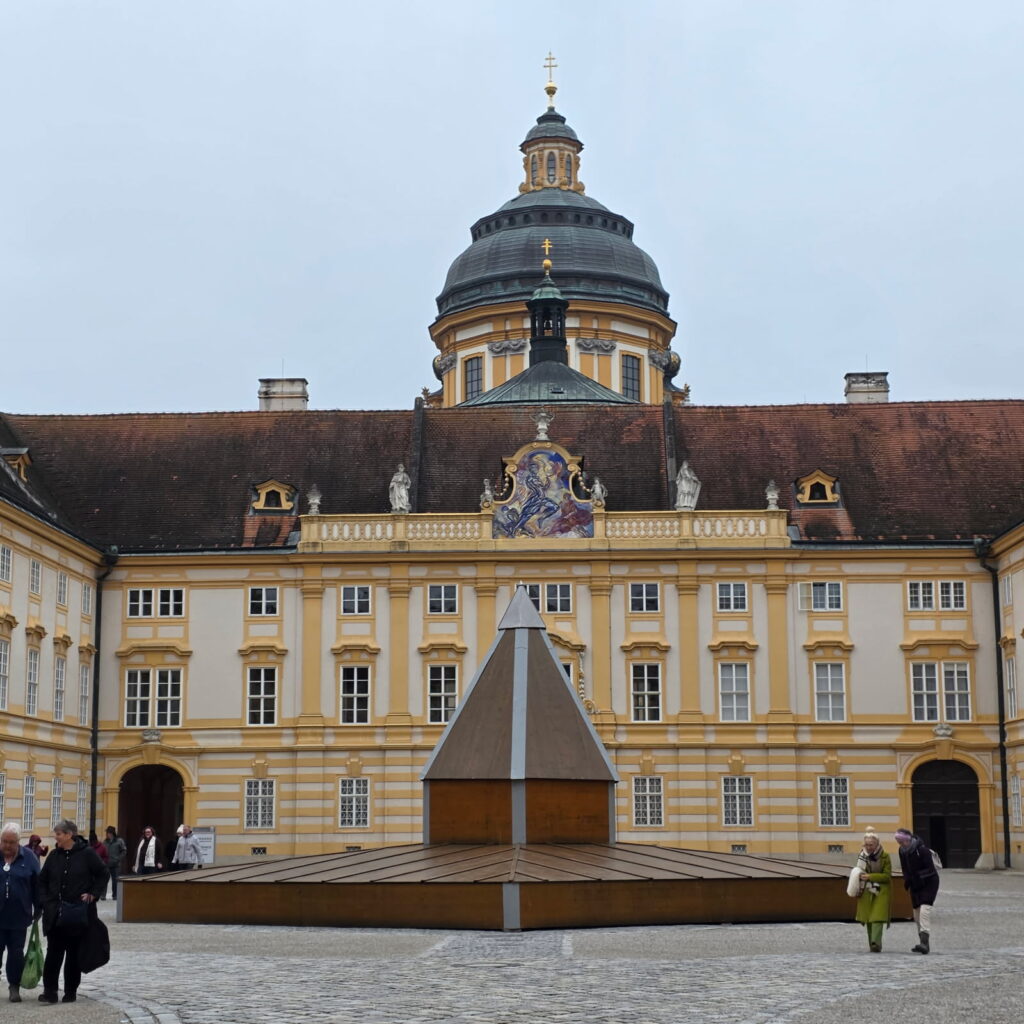Today we made a stop on our way to Vienna to see the Melk Abbey. We met our guide in the main courtyard. It was very large and our guide explained that each part of the abbey had its special purpose. The wing on the left was the Imperial Guest wing. This is where visiting dignitaries would stay when visiting the abbey. The right wing is where the monks lived and worked and ran a school. Directly in front of us was the abbey church and just to the right of the church was the library. We were not allowed to take pictures inside (which I found out after I took the two pictures – the Advent wreath and the guest hall.) I am not usually a museum person, but I would have liked a little more time here to read about some of the items on display. They had some beautiful reliquaries (vessels to hold church relics), chalices, books, and some beautiful vestments. We had a very short time to spend here, so went pretty quickly through the rooms. In the Marble Room, where the guests would have dined, the fresco on the ceiling was an optical illusion. If you stood in the center of the room, it appeared that the ceiling was curved and higher than it was. Instead, it was actually flat. If you moved to one end of the room, you could see the difference. On the other side of the abbey, in the library, the ceiling was similar except it wasn’t an illusion, the ceiling was actually curved.