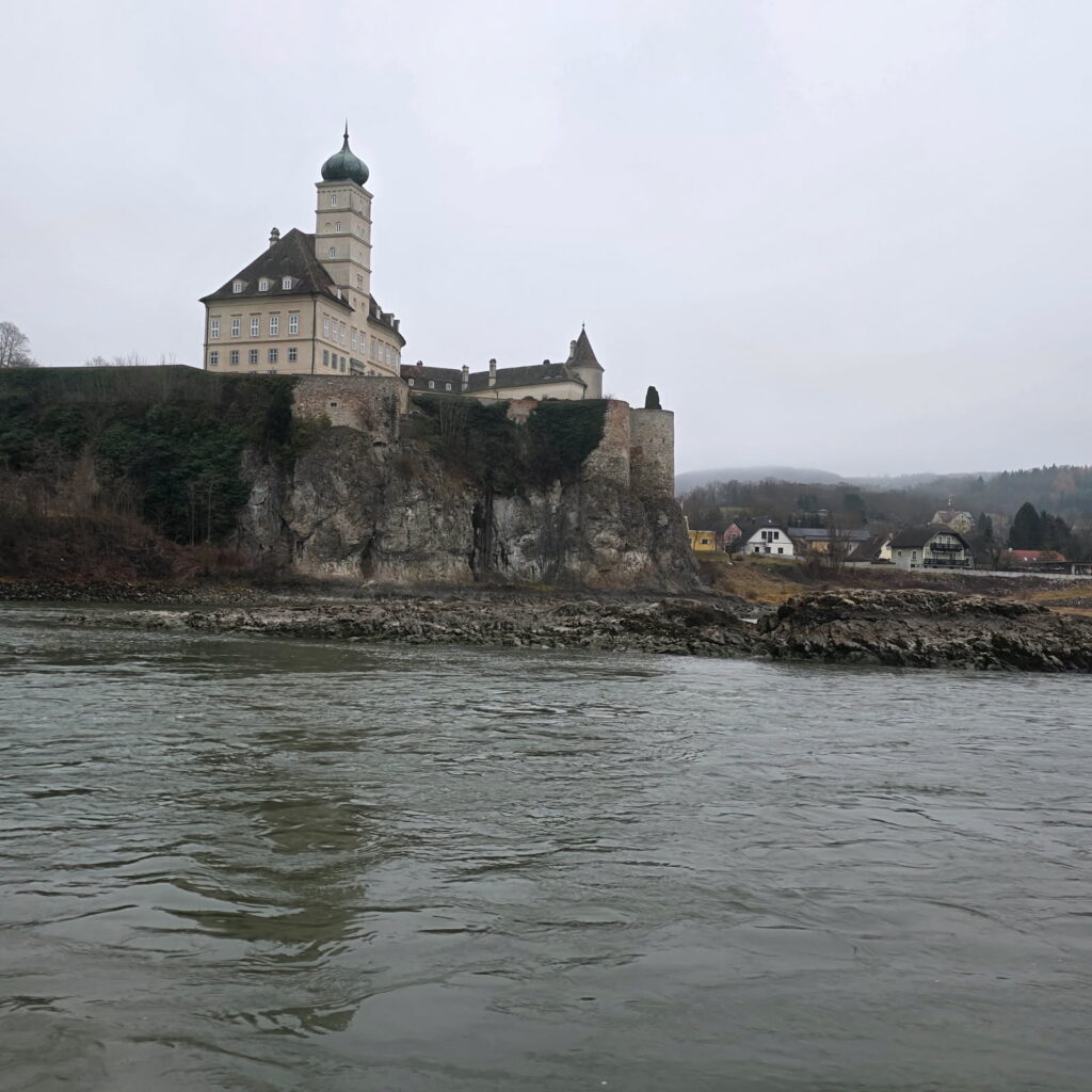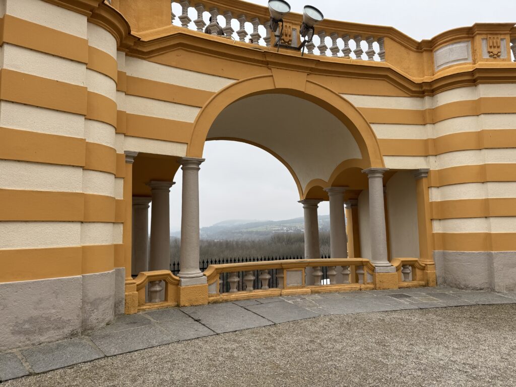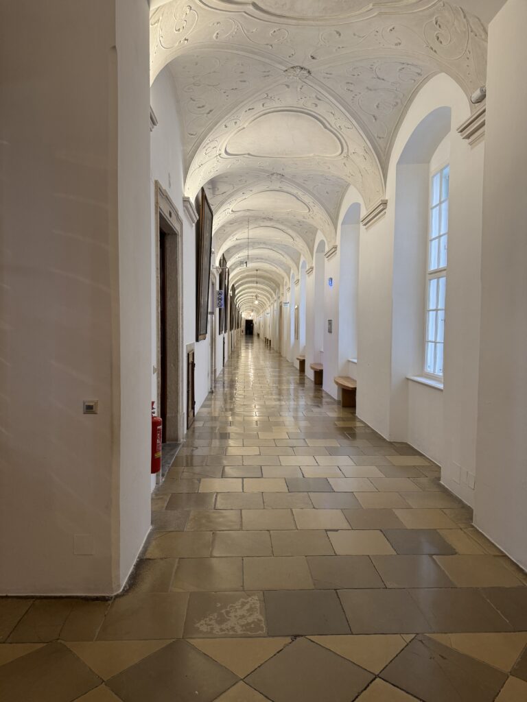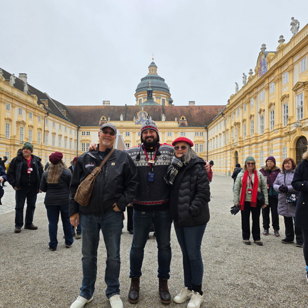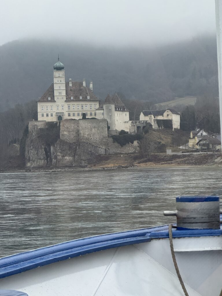 Today we made a stop on our way to Vienna to see the Melk Abbey. We met our guide in the main courtyard. It was very large and our guide explained that each part of the abbey had its special purpose. The wing on the left was the Imperial Guest wing. This is where visiting dignitaries would stay when visiting the abbey. The right wing is where the monks lived and worked and ran a school. Directly in front of us was the abbey church and just to the right of the church was the library. We were not allowed to take pictures inside (which I found out after I took the two pictures – the Advent wreath and the guest hall.) I am not usually a museum person, but I would have liked a little more time here to read about some of the items on display. They had some beautiful reliquaries (vessels to hold church relics), chalices, books, and some beautiful vestments. We had a very short time to spend here, so went pretty quickly through the rooms. In the Marble Room, where the guests would have dined, the fresco on the ceiling was an optical illusion. If you stood in the center of the room, it appeared that the ceiling was curved and higher than it was. Instead, it was actually flat. If you moved to one end of the room, you could see the difference. On the other side of the abbey, in the library, the ceiling was similar except it wasn’t an illusion, the ceiling was actually curved.