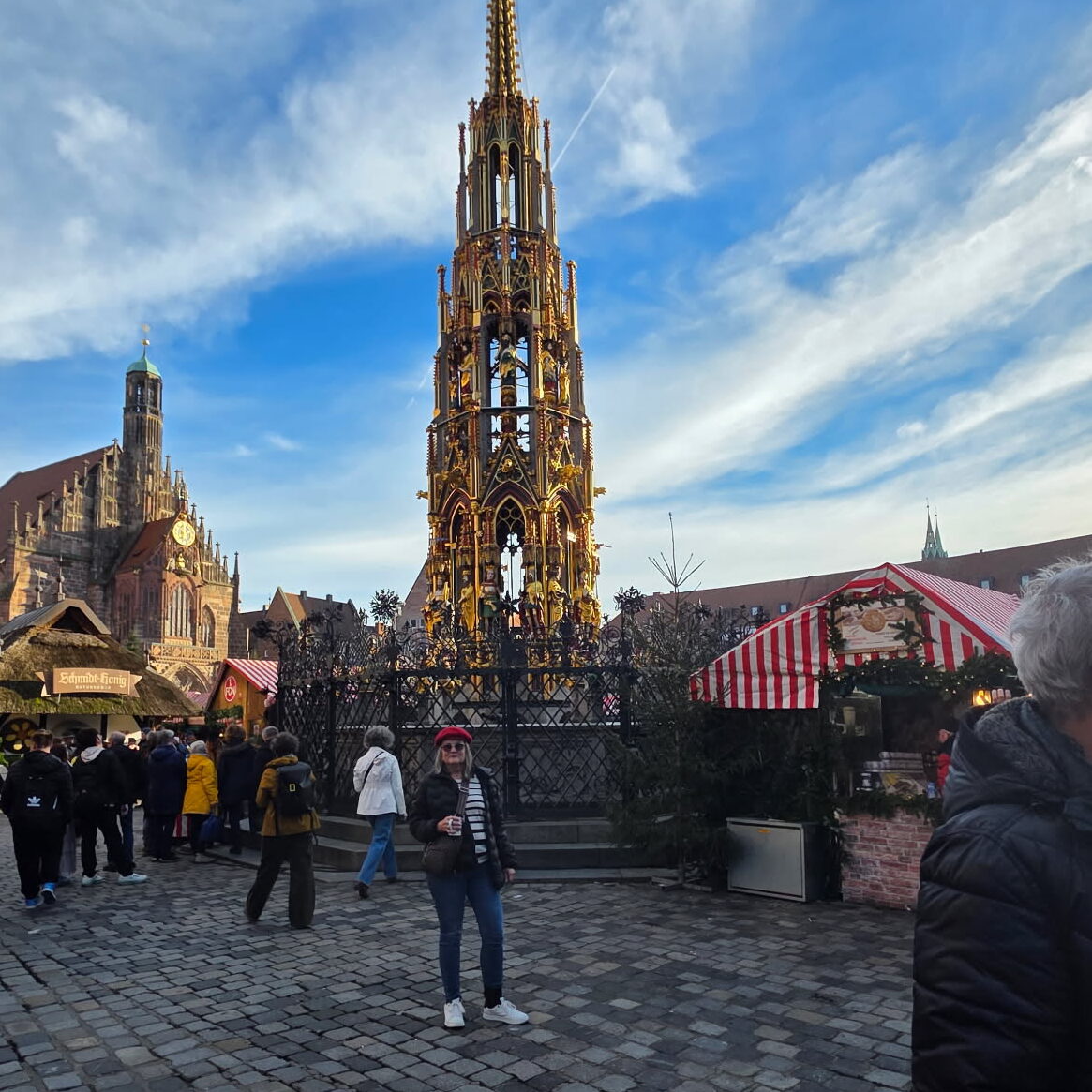 Near the main market was a smaller market where each stand was from a different country. We decided to check them out first and then head to the main market. It was interesting to see the products from all over the world. At the main market, we found several stands selling Lebkuchen, or gingerbread. Apparently Nuremberg is also known for its lebkuchen. Well, you know that meant we had to try some. It was not the same as what we are used to in the US. It was chewy and sweet, but not quite as spicy as I was expecting, still very tasty! The last sight before heading back to our shuttle was the Schöner Brunnen, the beautiful fountain. Our Program Director told us if we got lost just ask directions to the Schöner Brunnen and we would be at the place where he dropped us off and we could find our shuttle. We couldn’t figure out what the people were doing – they would climb up on the fence and then back down. After Googling it, I found out that there are rings you can spin for good luck.