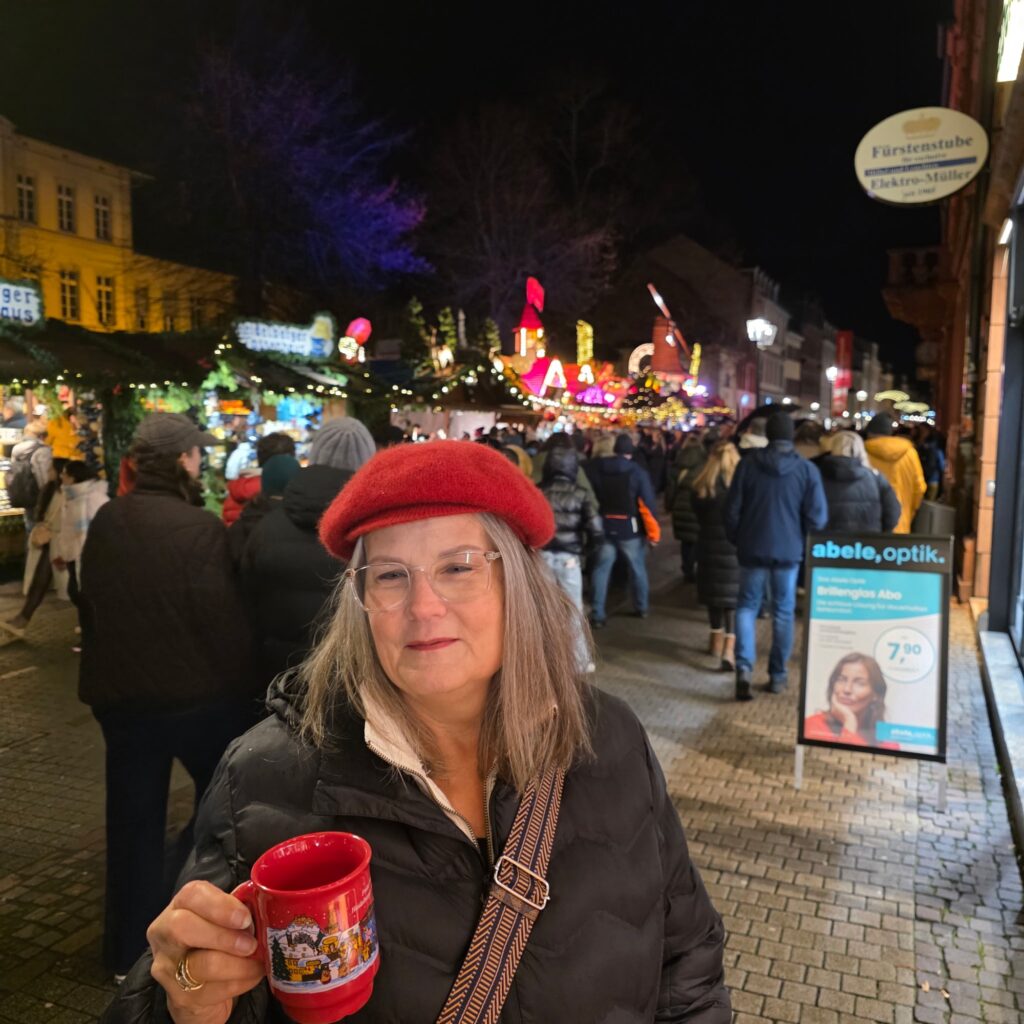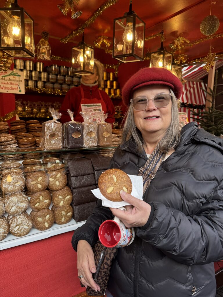 Our guide then left us at the Christmas Market to make our way back to the ship as we liked. So what do you think we did…..Of course, we found some more Glühwein!! Then we strolled down the Artist’s Lane to do a little window shopping. On the way back, we found a store that sold some very artistic sweaters and jackets from Italy. I went in to look around and ended up chatting with the store keeper. I explained to her that my German was not very good, but I liked to practice. So she helped me along with words I didn’t know and we had a very nice conversation about our children and grandchildren. It was the first real conversation I have ever had in German. Thankfully, she was very patient. We told her we would return after lunch so I could think about which pieces I wanted to buy.