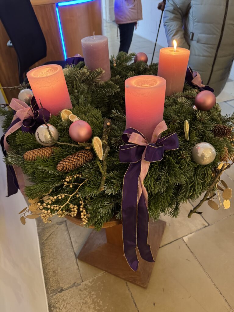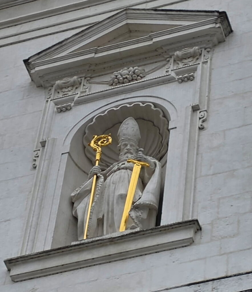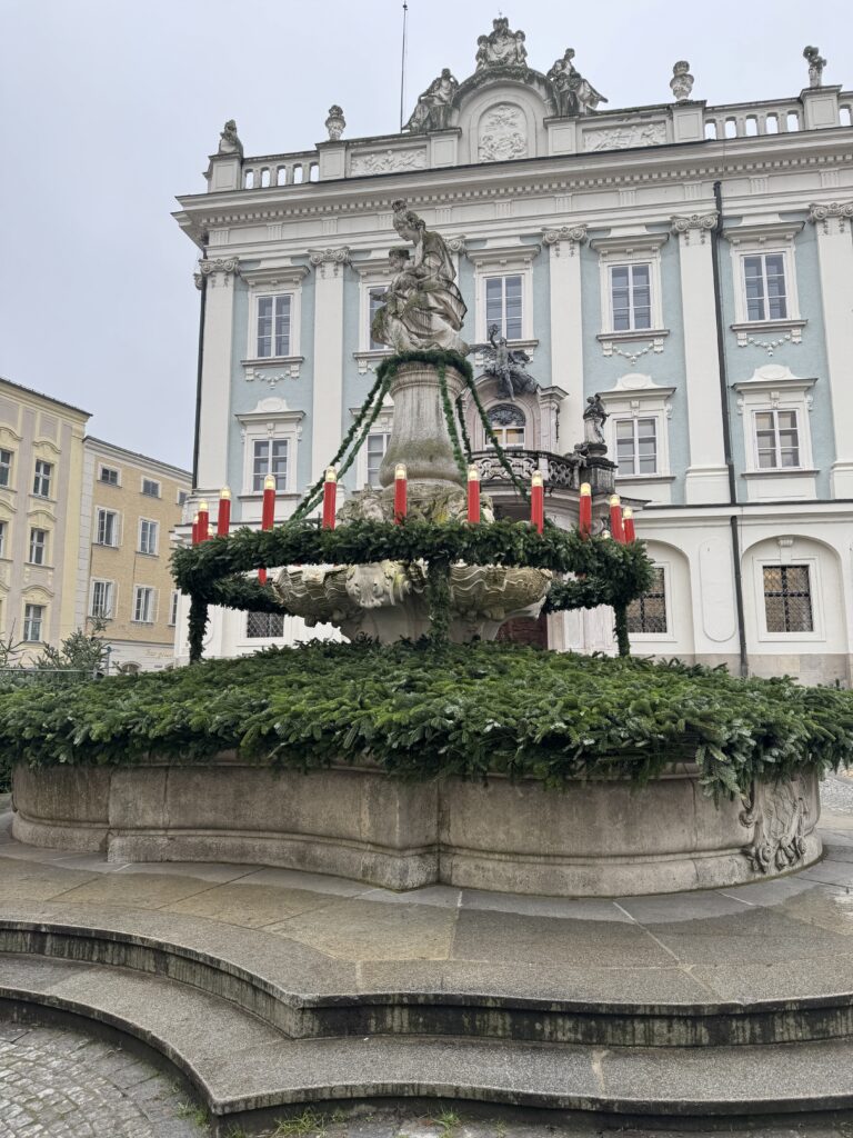 As we came to the Residenßplatz, or the residence plaza, we saw the largest Advent Wreath I have ever seen. Originally the Advent Wreath was a method of keeping time, daily, until Christmas. There were twenty-four candles on the wreath. Since candles were so expensive, the Advent Wreath was eventually cut down to four weekly candles. The wreath was in front of the “new” resident of the Prince Bishop. More than likely they got tired of living in the castle as they were very dark (remember the fake windows) and damp. However, the Prince Bishop was no less arrogant. The high threshold served two purposes. First, it was much easier access to the palace if you arrived by horse or carriage. Secondly, only rich people arrive by horse or carriage, so it was also a reminder to the people of their station in life.