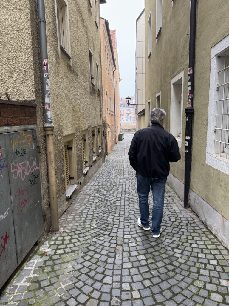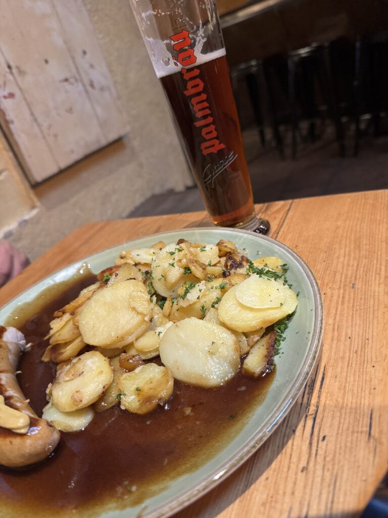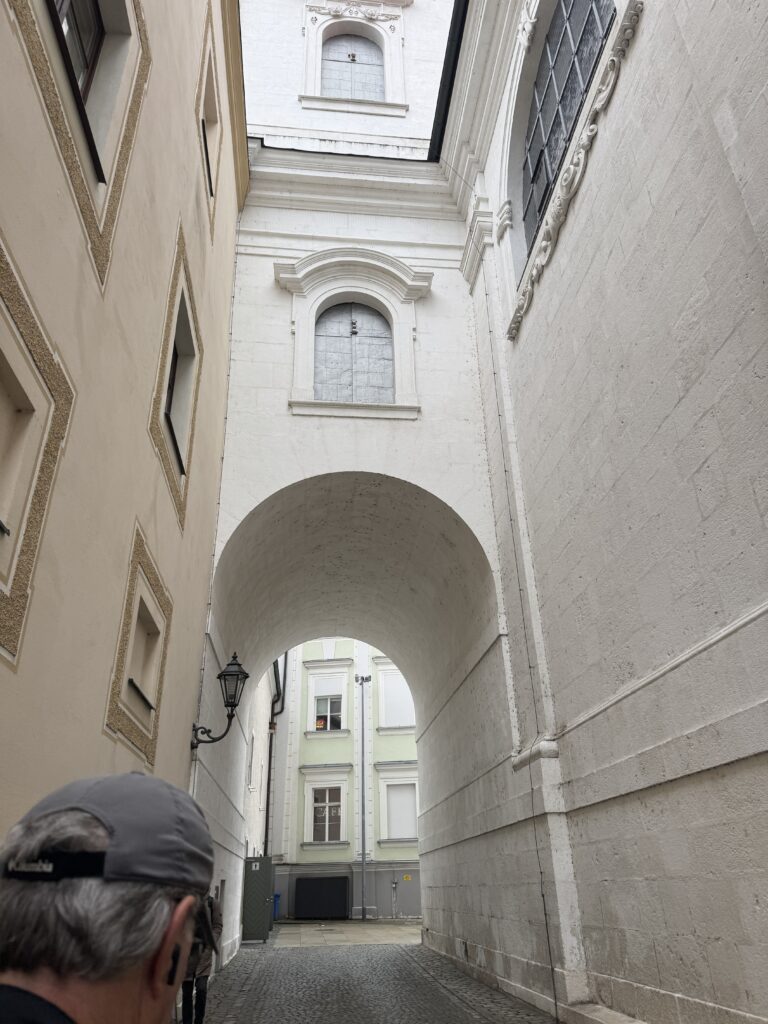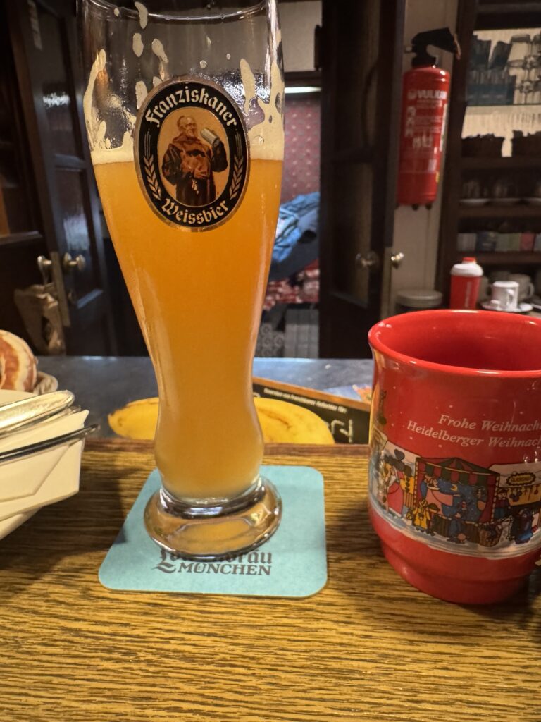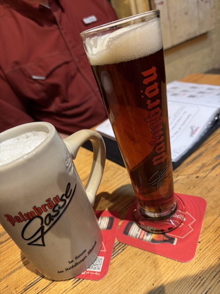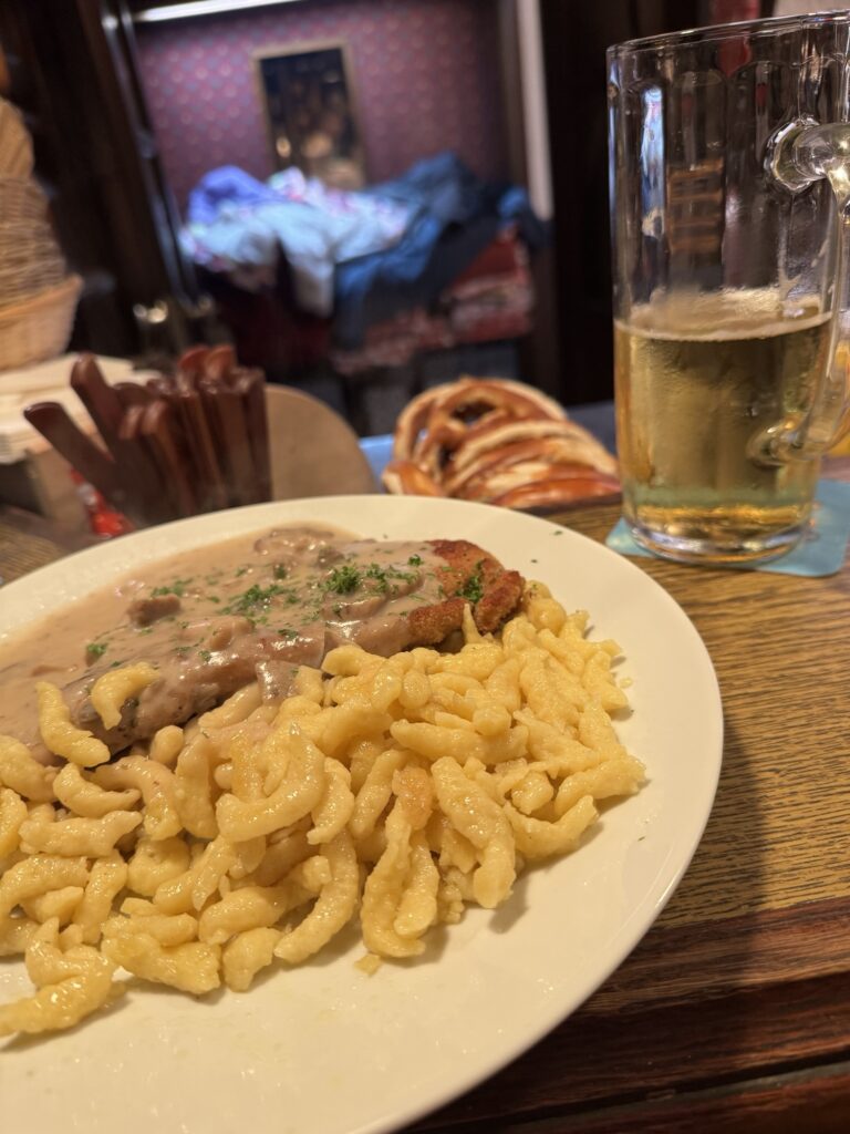 By now, we were starting to get hungry so we revisited a place I ate when I was there in 2022, the Palmbräu Gasse. This place is so cool! It was an old alley, but at some time in the past they added a roof between the buildings and enclosed the alley. It is now a great restaurant with authentic German food including a pork knuckle that could feed an army! We decided we weren’t quite that hungry and ordered bratwurst and fried potatoes. The gravy was delicious! Robert ordered an unfiltered beer and I tried the Dunket. Both were very tasty. Since we are in Germany we couldn’t resist trying the Apfel Strudel with vanilla ice cream and whipped cream It was not a mistake!