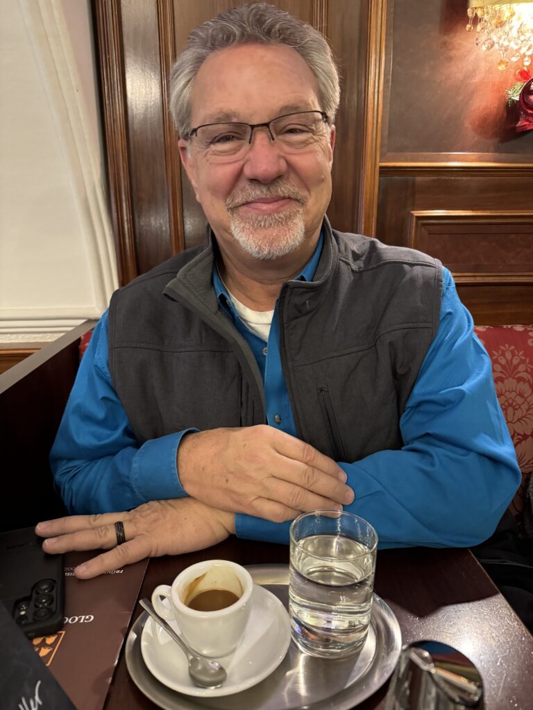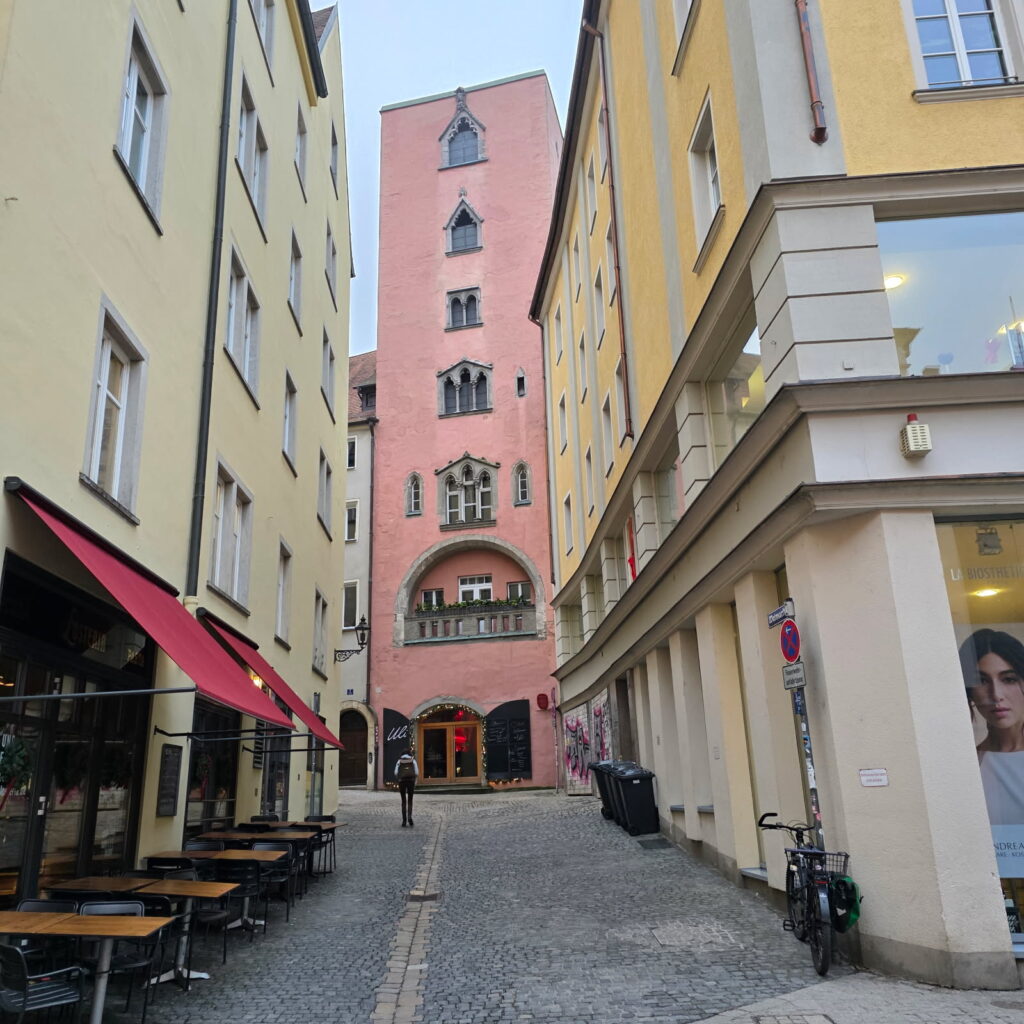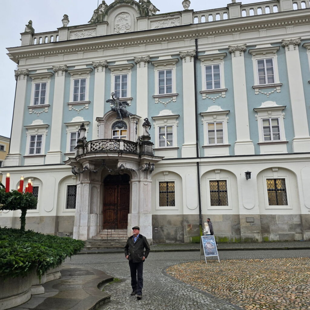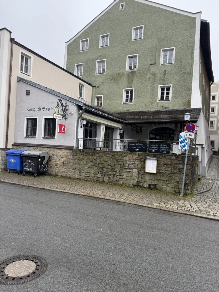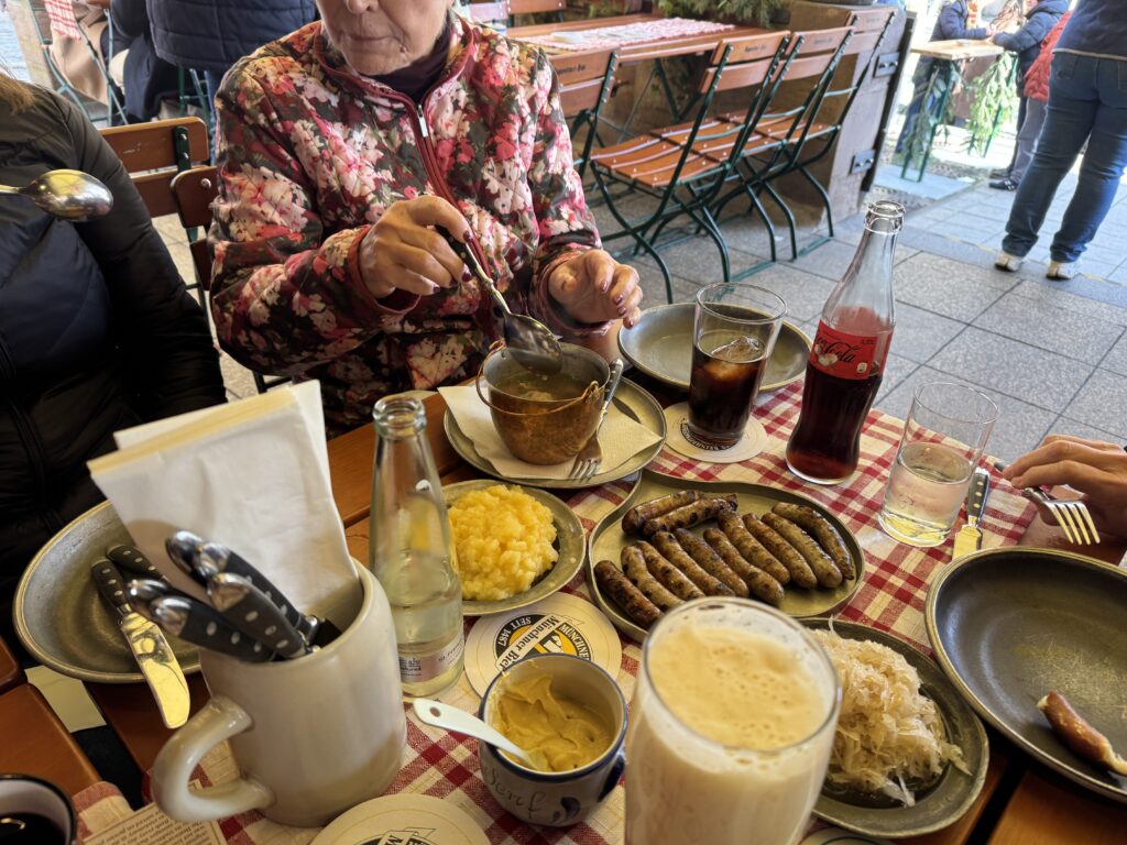 By now, we were starting to get hungry so we revisited a place I ate when I was there in 2022, the Palmbräu Gasse. This place is so cool! It was an old alley, but at some time in the past they added a roof between the buildings and enclosed the alley. It is now a great restaurant with authentic German food including a pork knuckle that could feed an army! We decided we weren’t quite that hungry and ordered bratwurst and fried potatoes. The gravy was delicious! Robert ordered an unfiltered beer and I tried the Dunket. Both were very tasty. Since we are in Germany we couldn’t resist trying the Apfel Strudel with vanilla ice cream and whipped cream It was not a mistake!