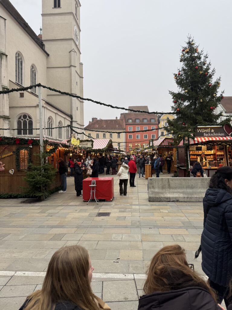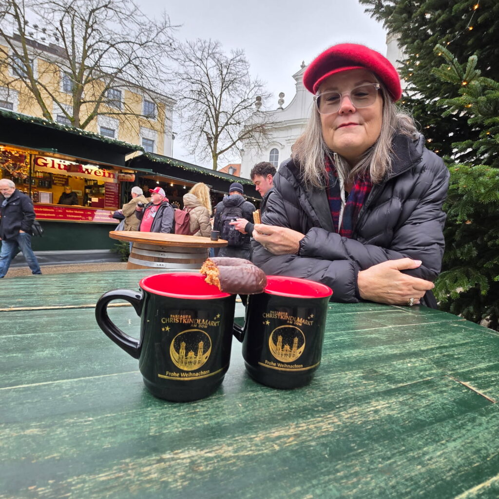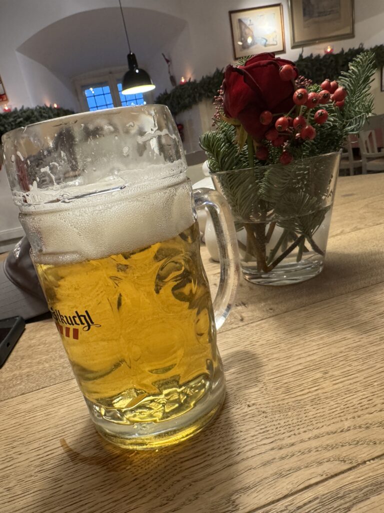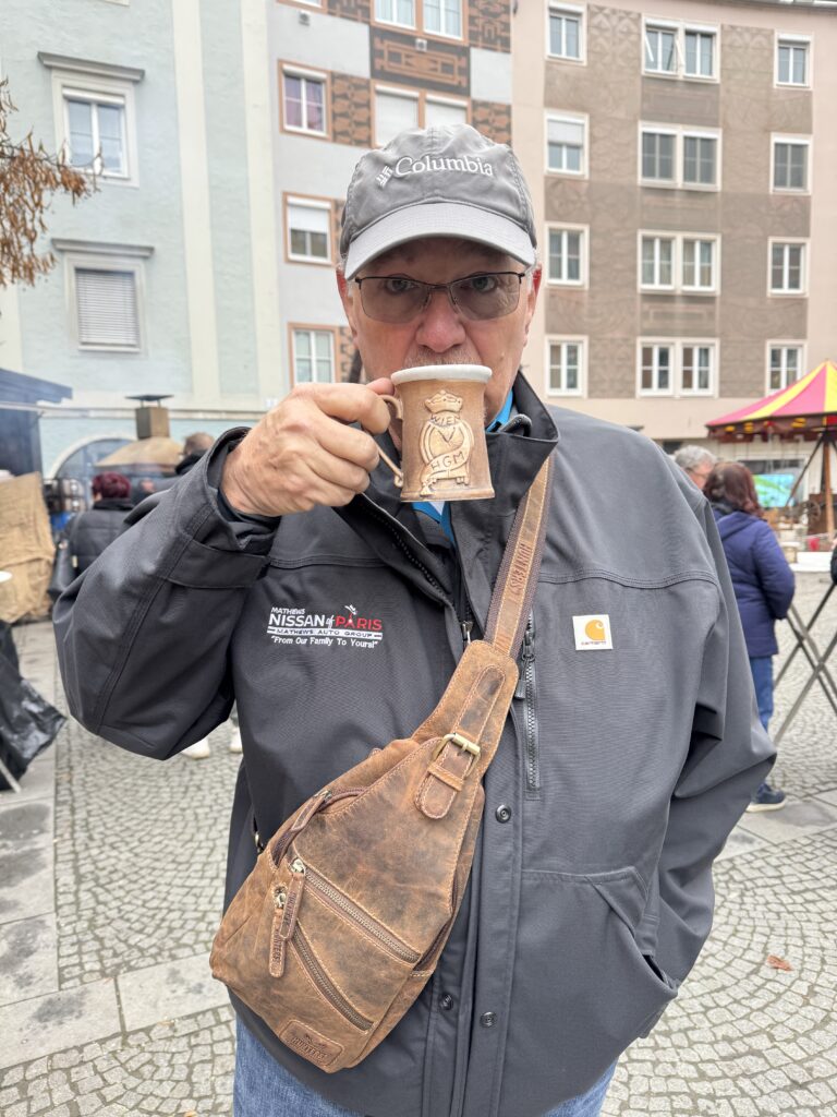 At the foot of the bridge is supposedly the oldest sausage kitchen in Germany, the Historische Wurstkuchl. It was built in 1616 and is still operating today. We continued on to see a few more sights including a small Christmas Market, the Goliath House, the Cathedral, and the main Christmas Market. Once we got to the main market, our guide left us to continue our tour on our own. We had our first mug of Glühwein in Regensburg and continued down more streets. We have a concert tonight by the Regensburg Girls’ Choir, so our dinner will be early. We decided to stroll back to our ship with a quick stop at the Wurstkuchl for a mug of Bavarian beer and then back to the ship.