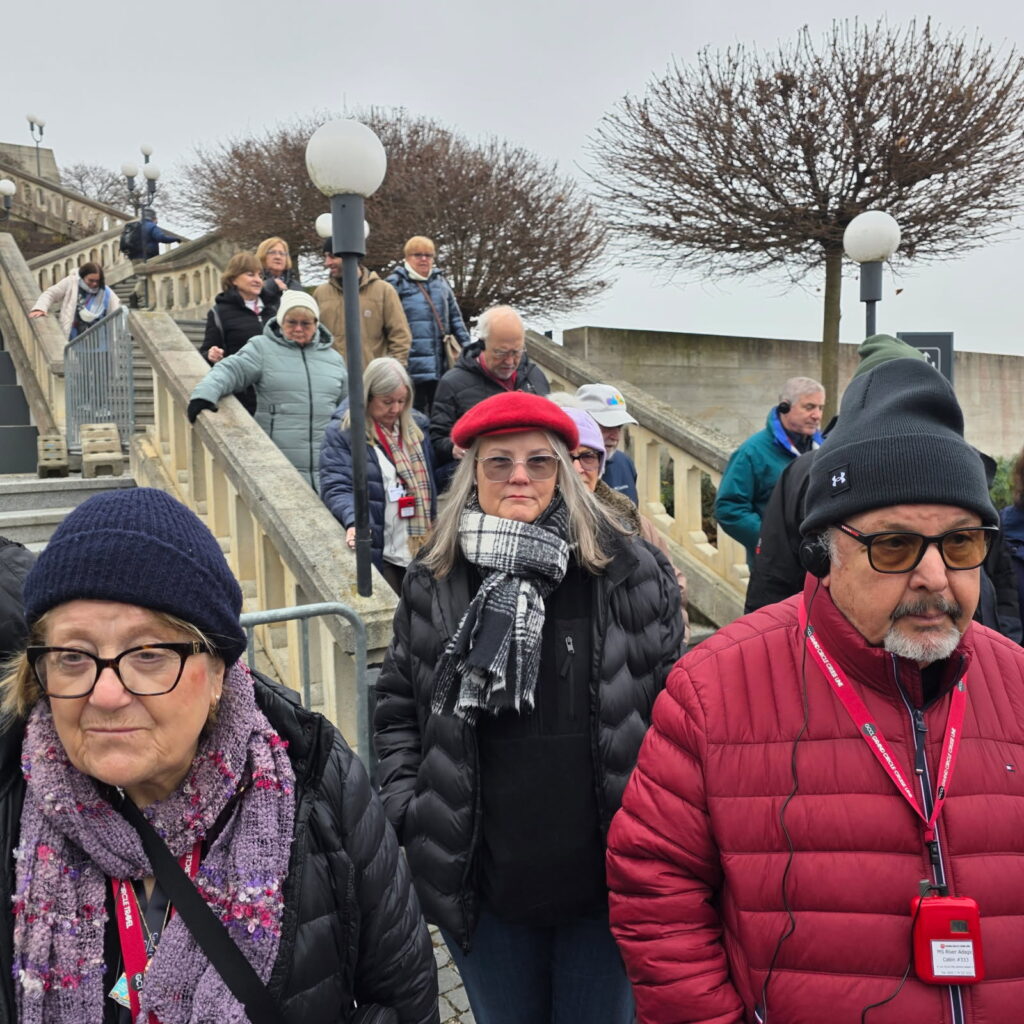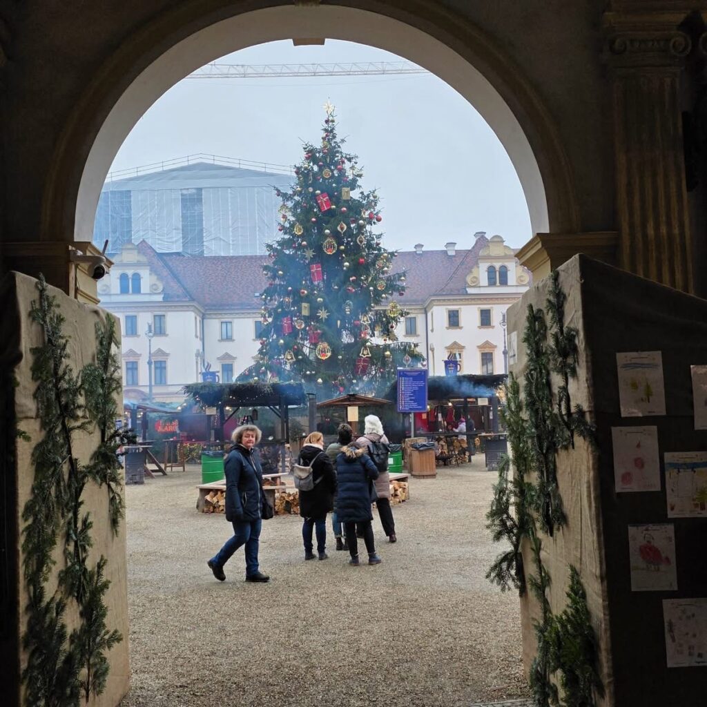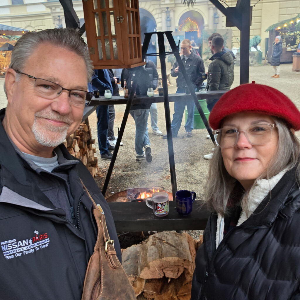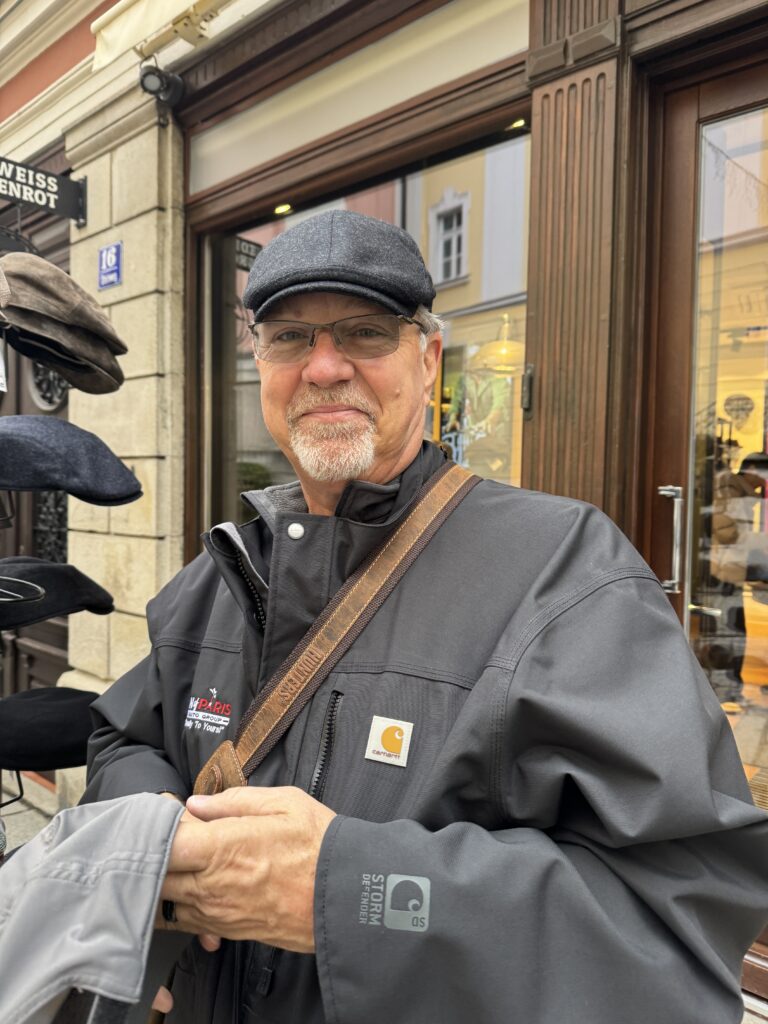 We had a pretty chill afternoon. After lunch we spent time in our cabin watching the scenery as we cruised, reading, and maybe a little nap. Tonight we had an early dinner as we wanted to have a little time in Vienna this evening. After dinner, we boarded a shuttle to the Wiener Christkindlmarkt. This was definitely one of the most beautiful markets we have visited. It is located in front of the Rathaus (city hall). The Rathaus was lit up, Christmas lights were everywhere, and they had the Tree of Love which was full of lighted red hearts. There was a children’s area with lots of things for children including a train. On the other side of the market, they even had a skating rink for adults and for children. We enjoyed our last mug of Glühwein and strolled the market. Robert decided it was time to spruce up his wardrobe and bought a driving hat. Then it was time to board the shuttle and return to the ship.