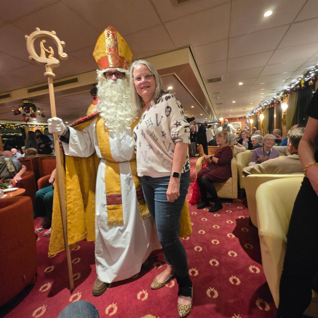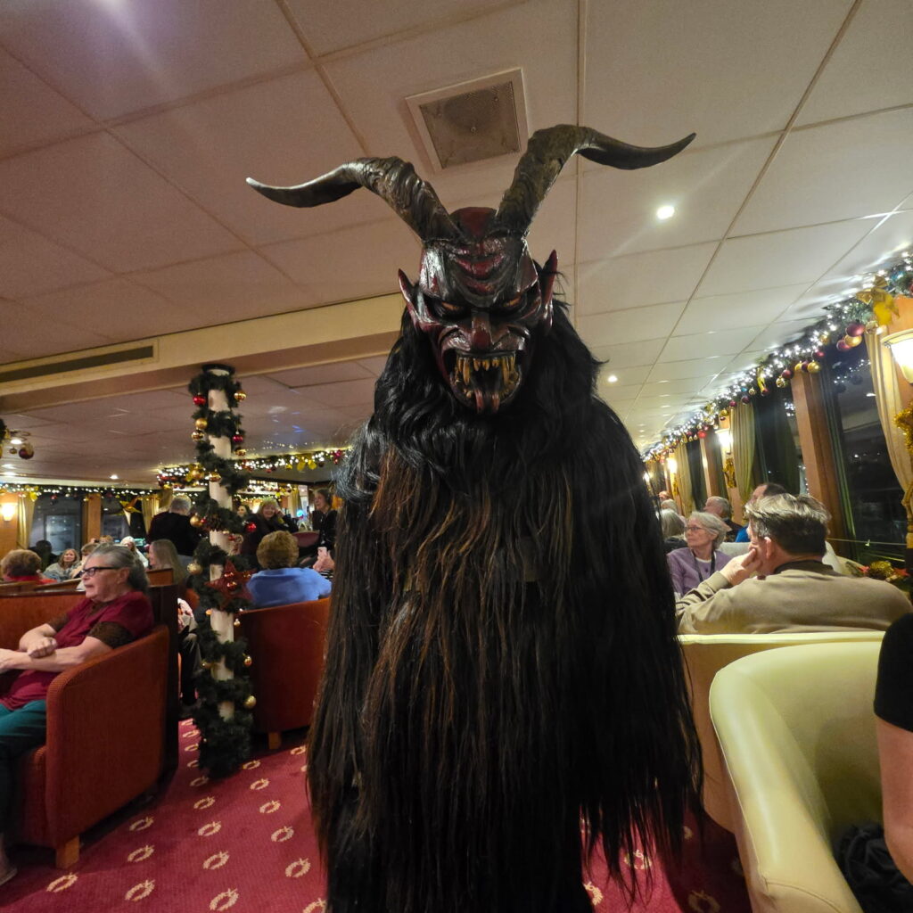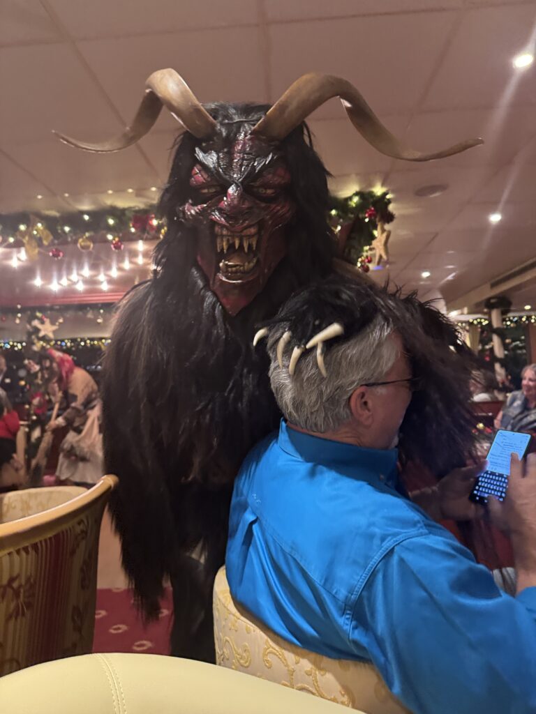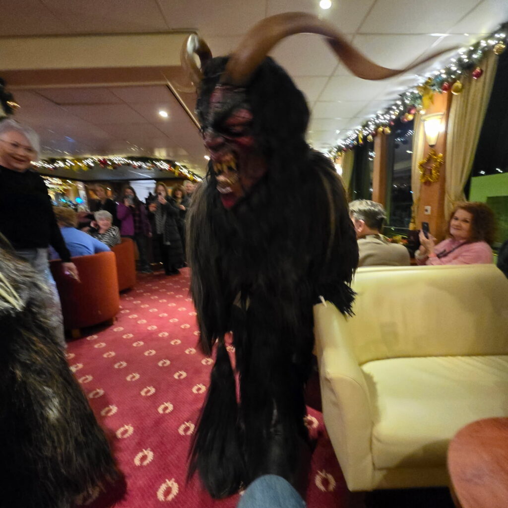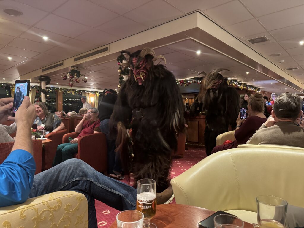 Before dinner we were in the lounge for cocktail hour when we were surprised by a visit from St. Nikolas and the Krampus (Krampi?) In Germany and Austria naughty boys and girls don’t get coal, they get a visit from the Krampus. The Krampus accompany St. Nikolas on his visits to all the boys and girls. They are horrendously ugly and have large bells on their back with make a terrible racket. Sometimes witches come as well. Parents open their doors and let the Krampus in to “scare the children straight.” St. Nikolas explained to us that beings “whipped” by a Krampus (with a horsetail) or by a witch with her broom is actually a good thing as it sweeps all the evil away. Robert was singled out by a Krampus, so he should be good for the new year. I was sitting closer to the window and thought I was safe. I was wrong! This Krampus not only whipped me with his whip, he jumped over Robert and tackled me on the couch I was sitting on. I can’t attest to exactly what happened (I was under the Krampus) but I’m pretty sure I was assaulted!! Hopefully that bears well for the new year for me as well. Finally St. Nikolas came by and assured me that all was well.