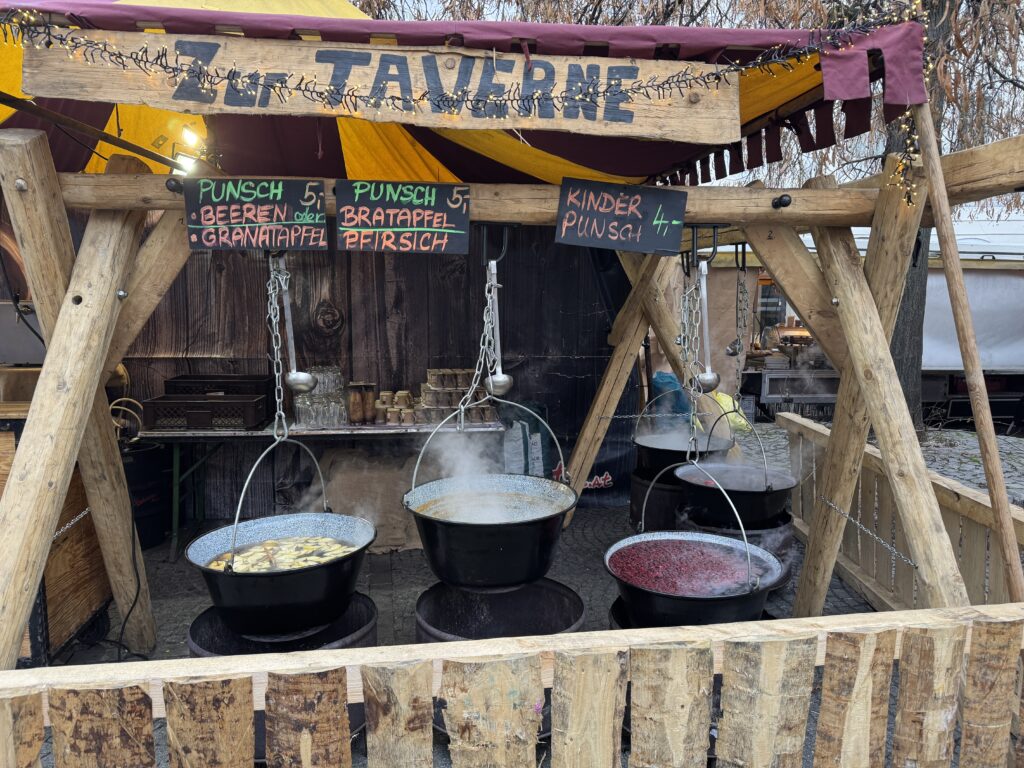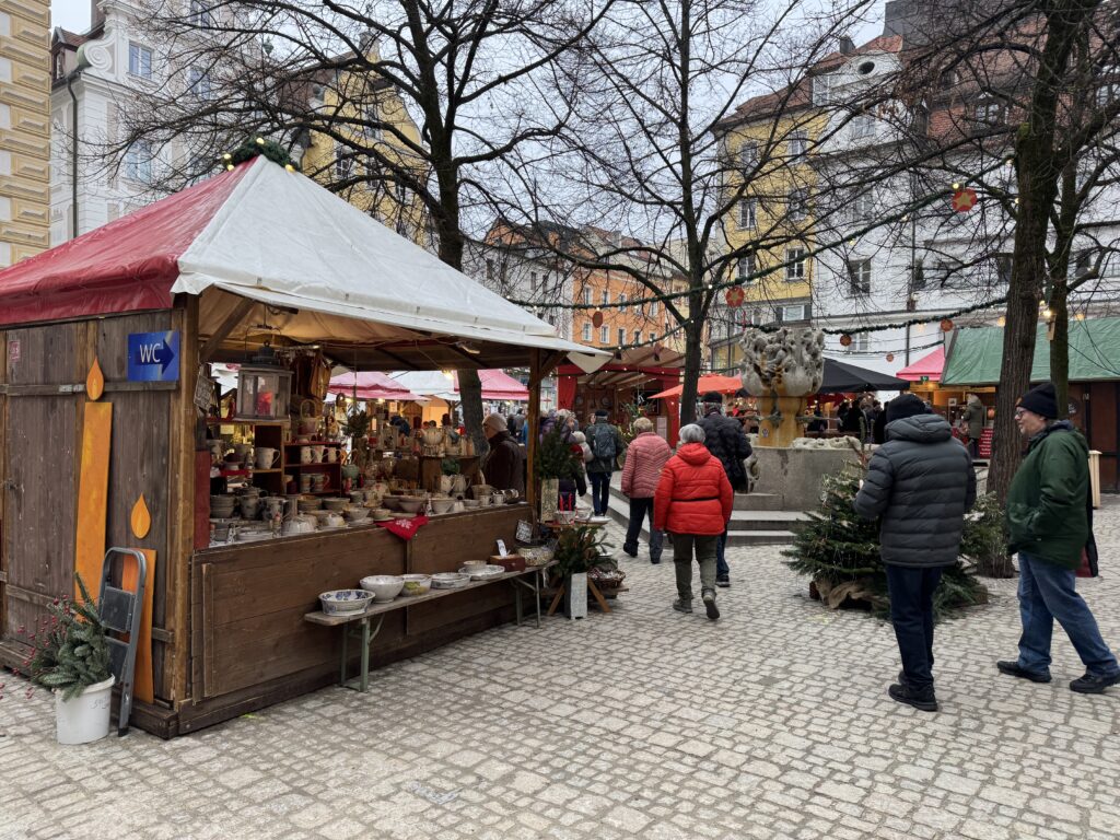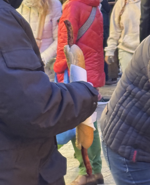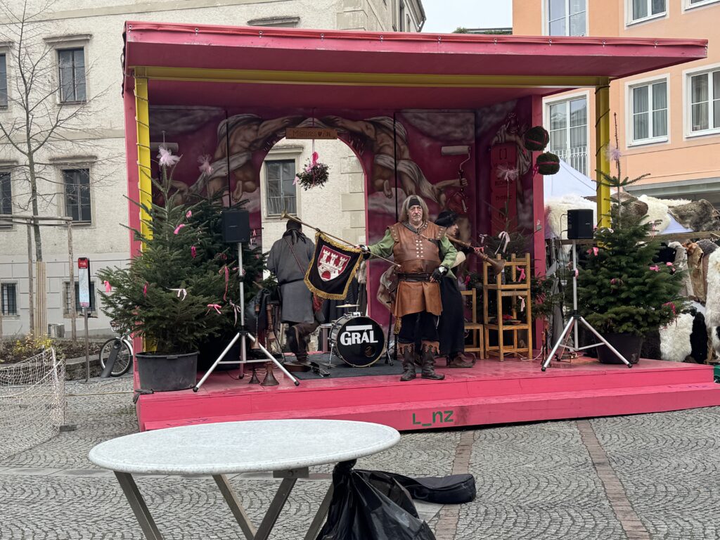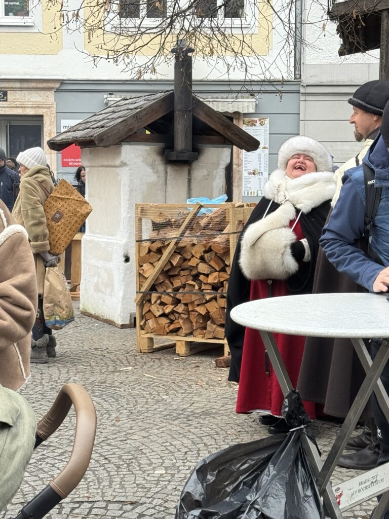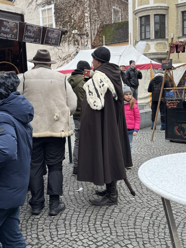 Properly energized, we set out to find some Christmas markets. We started with the main market and, you guessed it, went for our first mug of Glühwein today. It was a few minutes before 11 am, so we decided we could share one mug. We did a little shopping and then hit the back streets to find a small market we found on our walk. It was a medieval market. All the vendors were in medieval costume. The hot drinks were heated in kettles over open fires, there was a stand selling pelts of various animals, one woman was baking sourdough bread in a wood-fired oven, and there was a stage with some musicians ready to open the market.