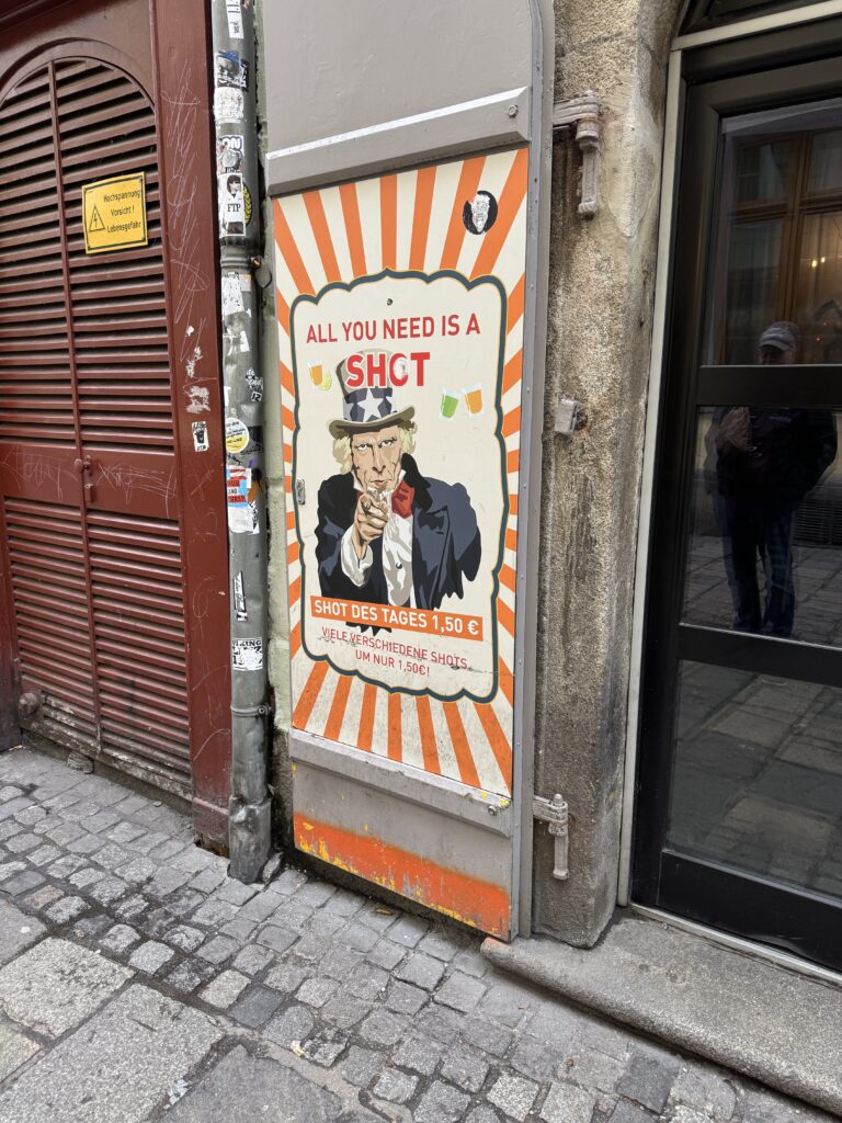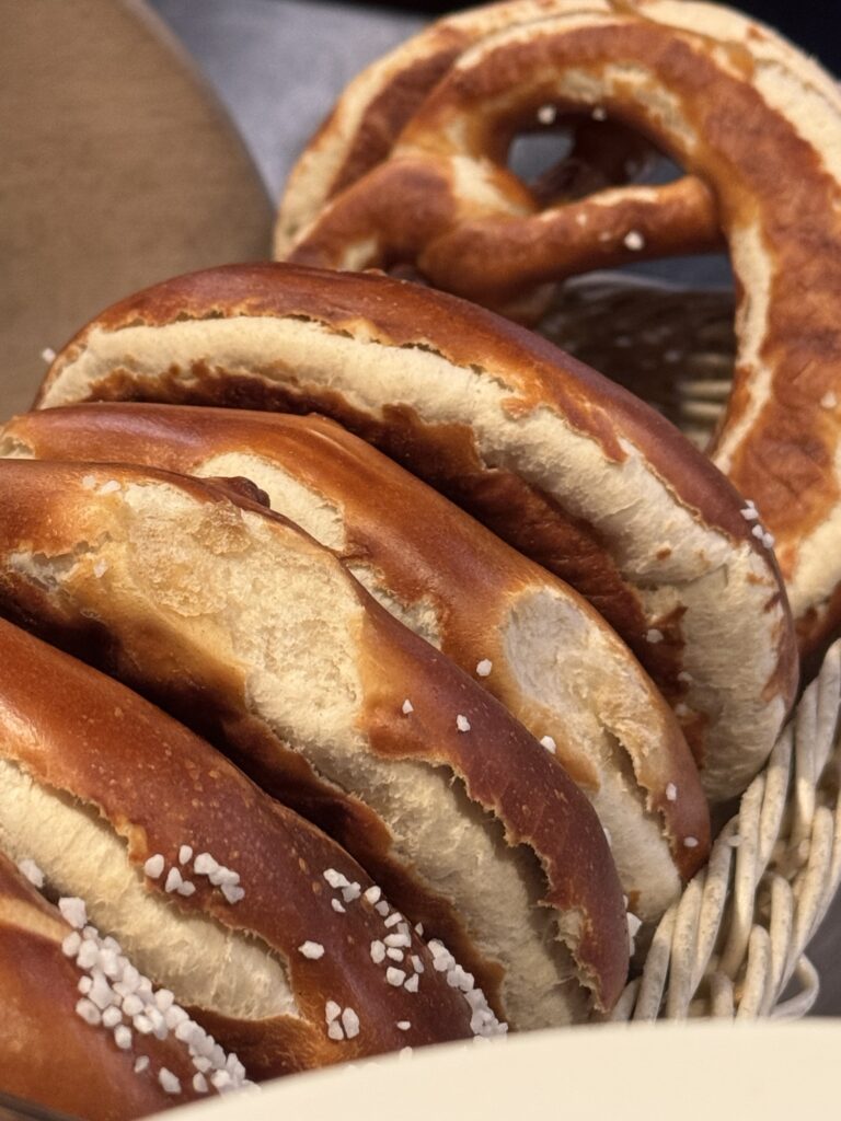 At about 7:30 pm, a woman came and asked the server to bring another bottle of sparkling wine. The young server does and this woman gets a wine glass (instead of a champagne flute) and empties half of the new bottle into her wine glass. As I get up to get a normal glass of sparking wine, another woman comes and empties the rest of the bottle into her wine glass before I can up there. Robert and I just looked at each other astonished. 😳 I ask the server if she can bring another bottle. She looks at me perplexed and I explain in my broken German that two women emptied the bottle so she brought me another one. She looks at me and asks “Zwei Leute?” (Two people?) to which I nod and she breaks out laughing. She then goes back into the employee area and I assume she tells her associate because I hear them both break out laughing….And this is why we like people watching!