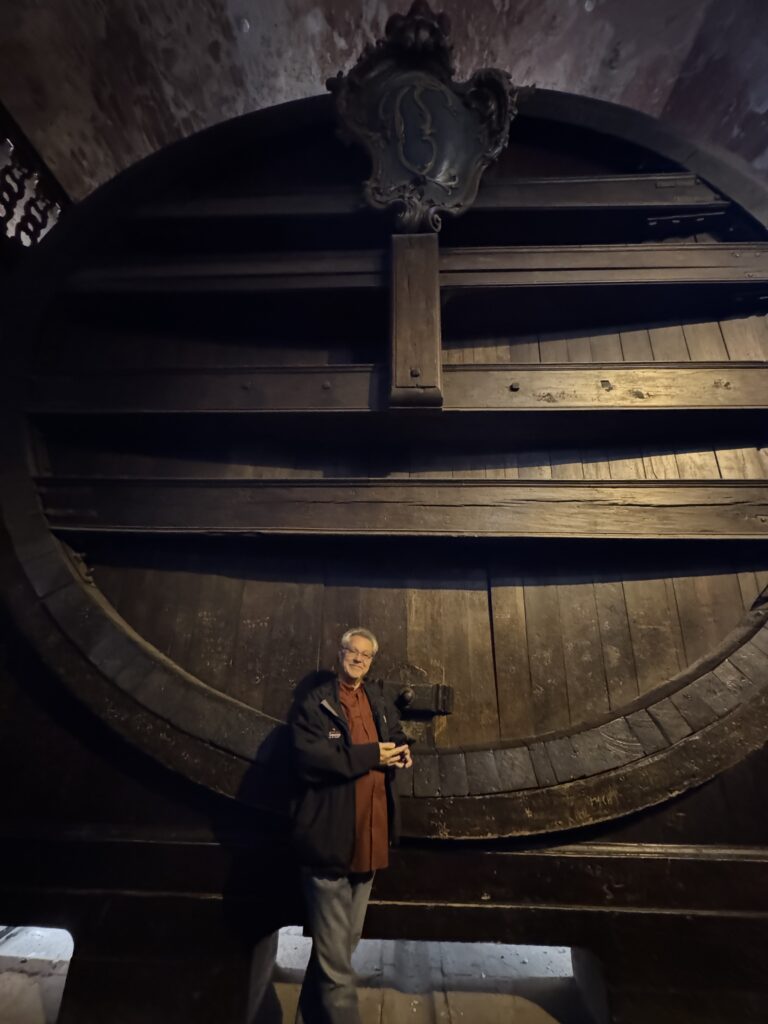 In the library, all of the books had been bound to look alike. Because there weren’t many windows in the library, and it would be dark, some windows were hidden behind false shelves and books. These doors could be opened to allow light into the library when someone was studying there. From the library we proceeded to the church. I have seen a number of churches around the world, and this was by far one of the most beautiful. Many of the surfaces and carvings were plated with gold. There was a beautiful organ with 3,500 pipes. While we were there, they were tuning the organ. Even being tuned, the organ sounded magnificent. After a short visit in the sanctuary, we were led out to the gift shop (some things are the same everywhere you go) and we purchased a couple of bottles of Benedictine wine and one cold bottle of Benedictine beer. We enjoyed the beer and found it to be very good. It was similar to an amber ale. Very tasty!