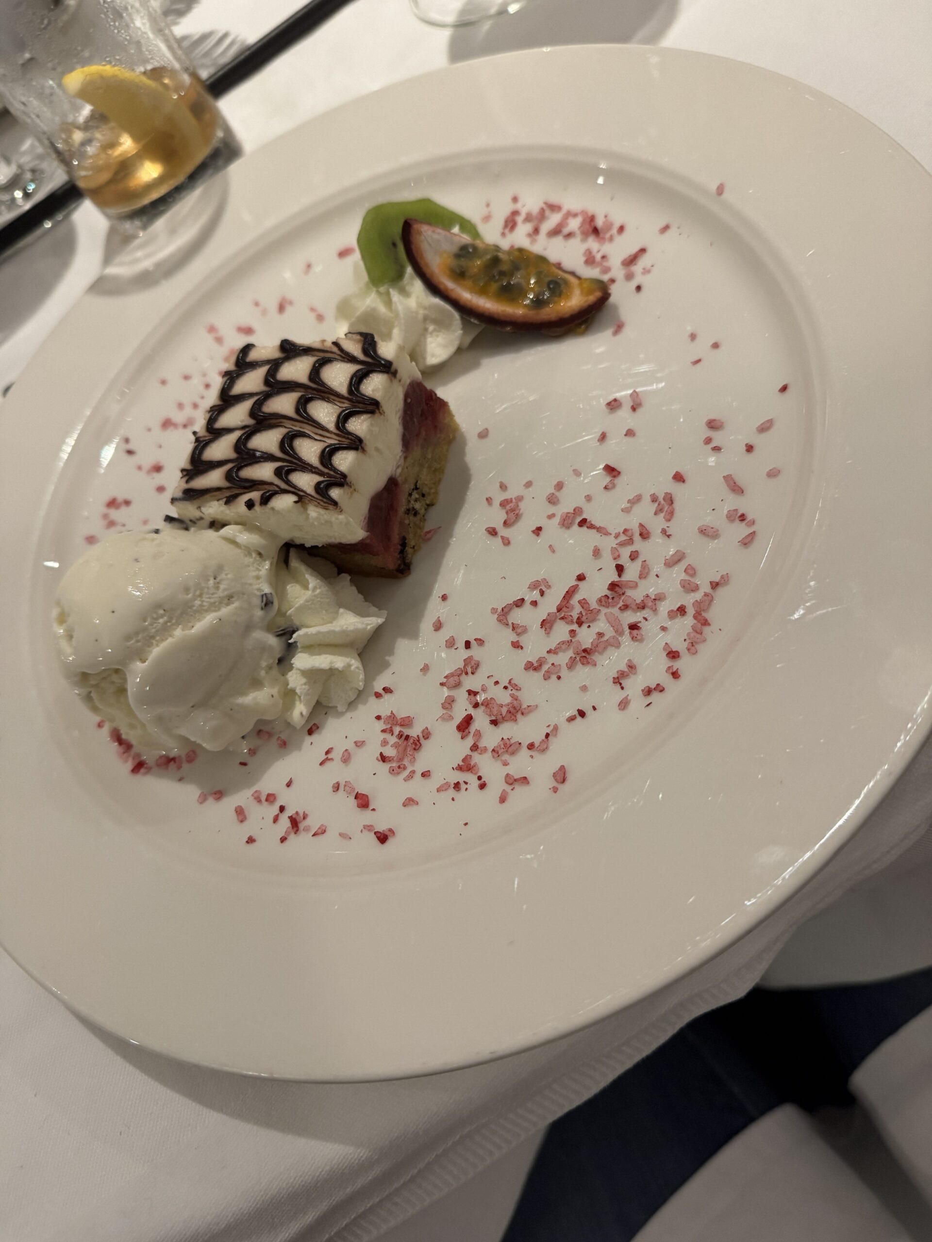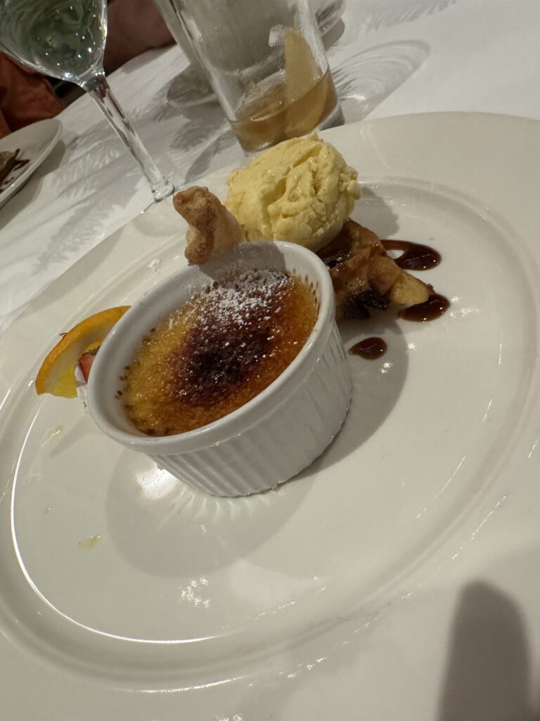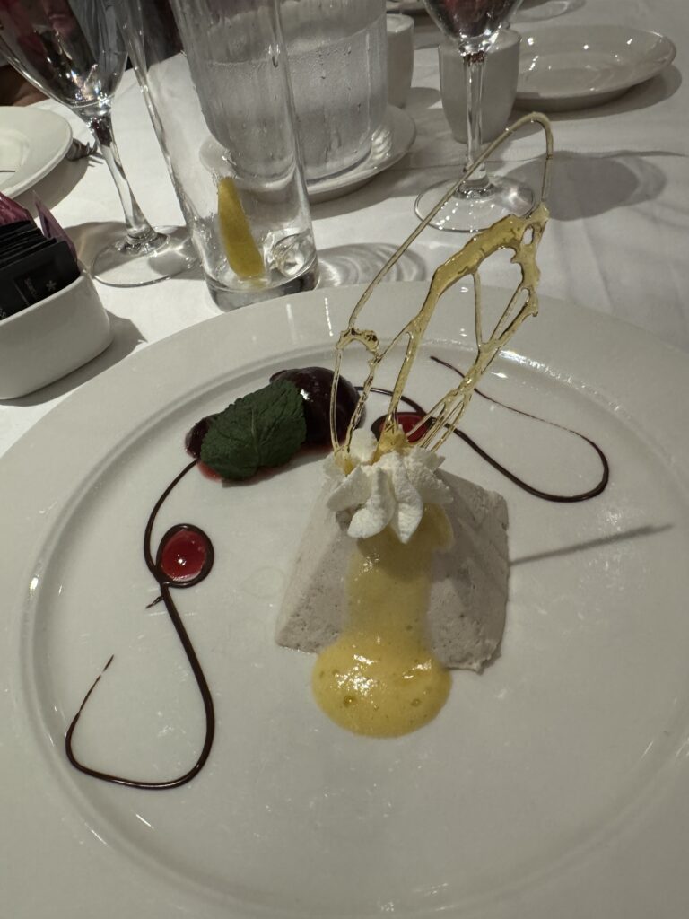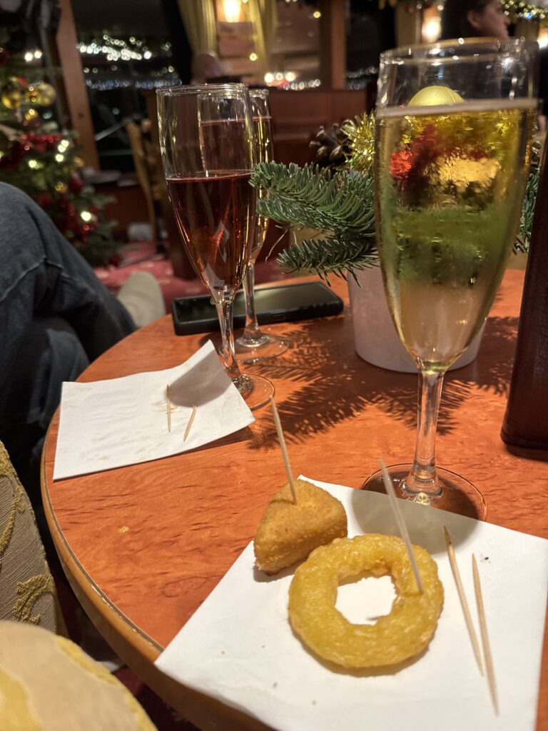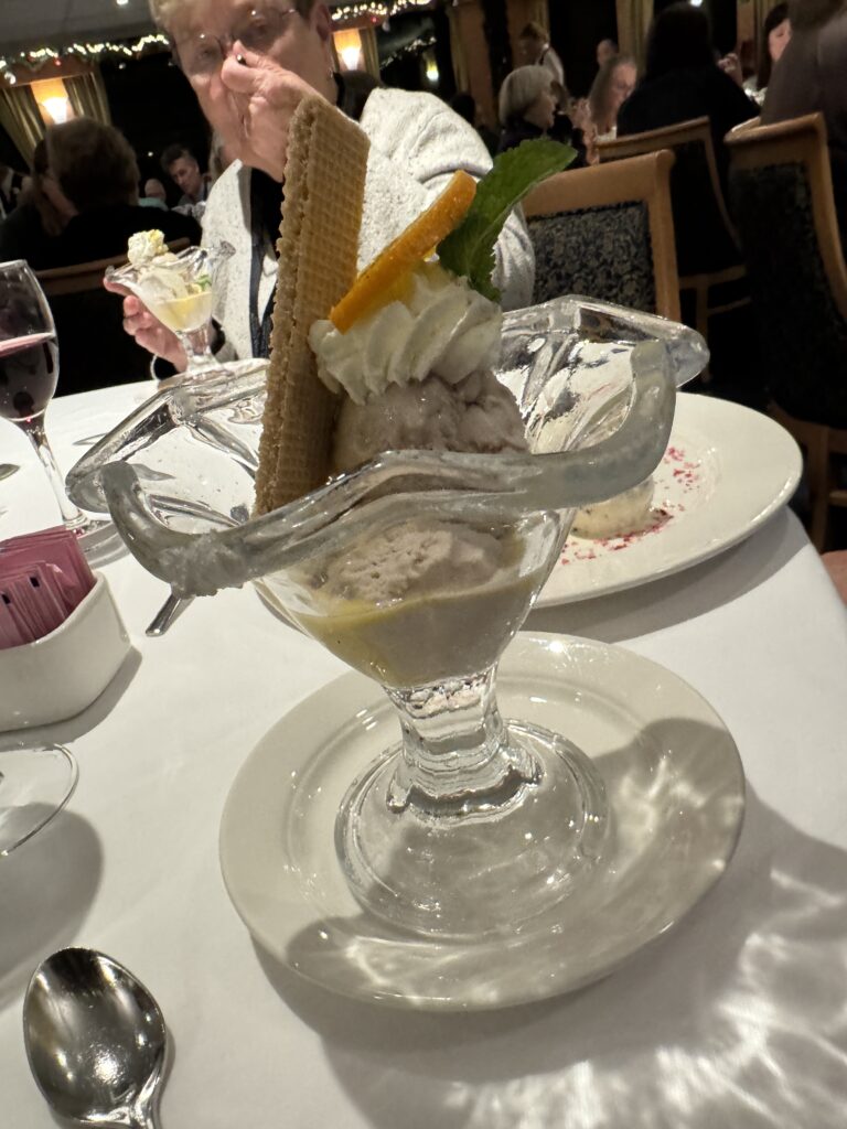 For dinner tonight we were served a Christmas dinner with a shellfish risotto and bell pepper risotto, an Aperol spritz palate cleanser, beef sirloin or pan-fried halibut and for dessert something they called “Caramel Parfait”. As you can see from the picture, I forgot to get a picture of my food again. 🤪