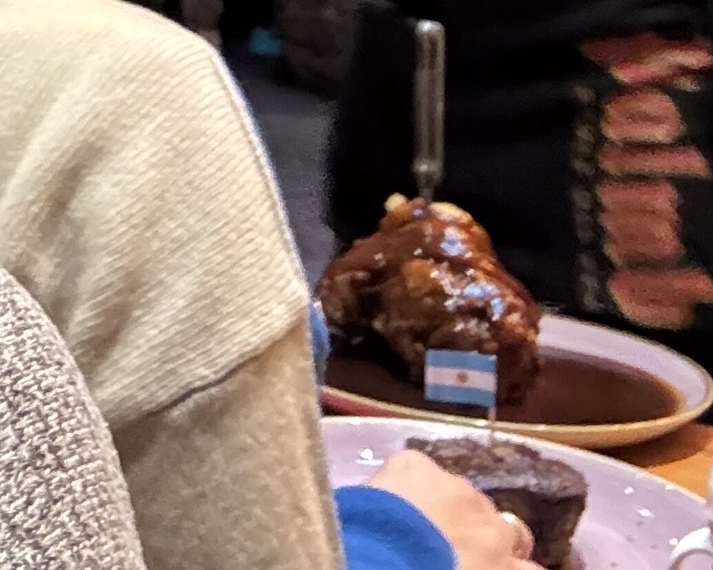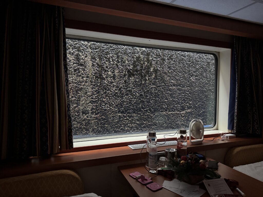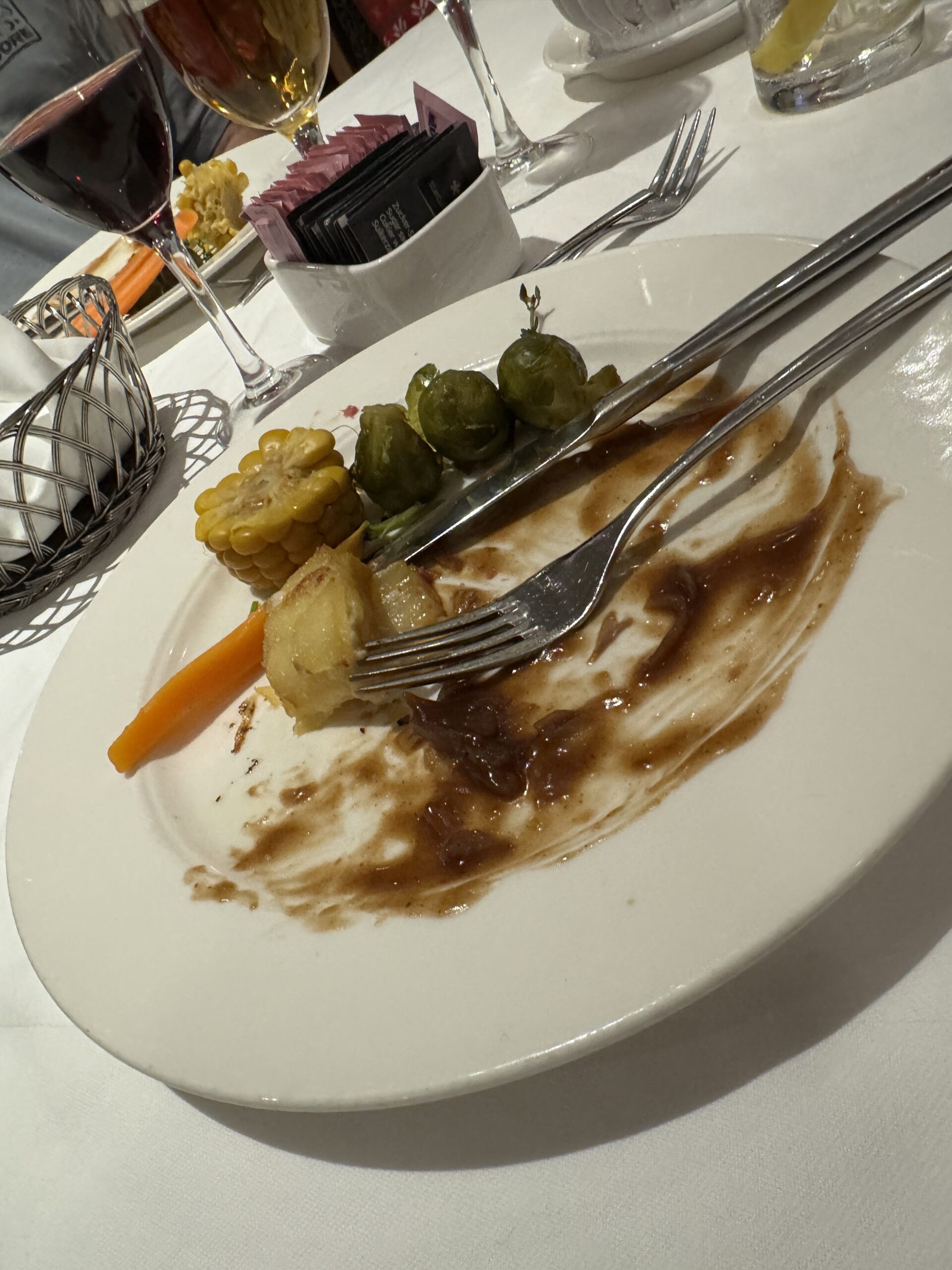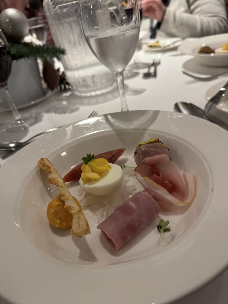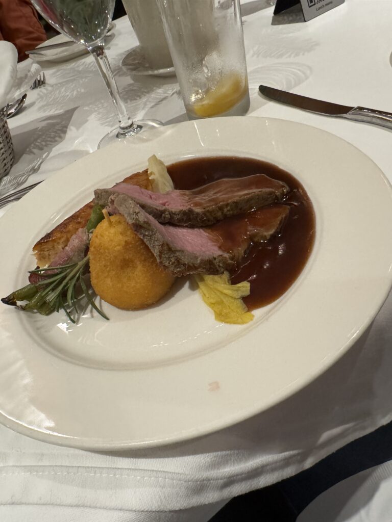 For dinner tonight we were served a Christmas dinner with a shellfish risotto and bell pepper risotto, an Aperol spritz palate cleanser, beef sirloin or pan-fried halibut and for dessert something they called “Caramel Parfait”. As you can see from the picture, I forgot to get a picture of my food again. 🤪