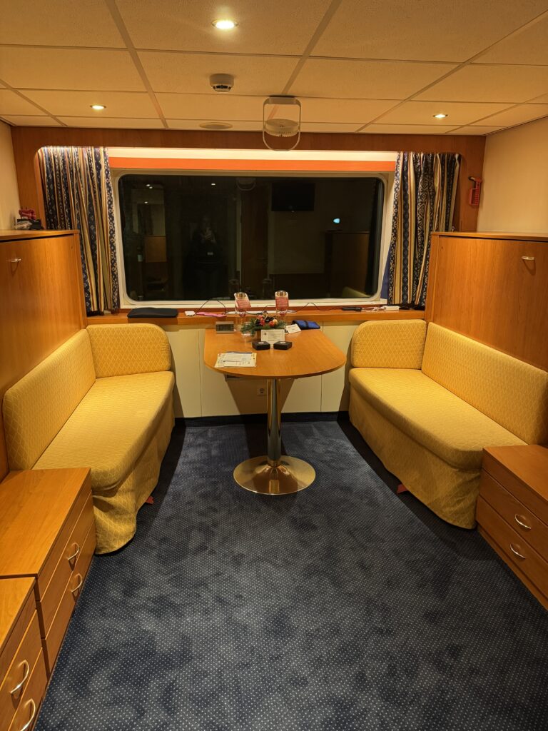 We arrived at our ship, checked in, and made it to our room. A lot of the guests got here this morning and were still in Nuremberg so we had plenty of time to unpack for the next week. Our cabin is small, but has lots of little spots to stash things, so we were able to completely unpack before the first events in the lounge. We are on a small 163 passenger ship, so it is very intimate. You might ask where our beds are and the answer is that we have Murphy beds that the cabin steward lowers while we are at dinner and then puts away during the day.