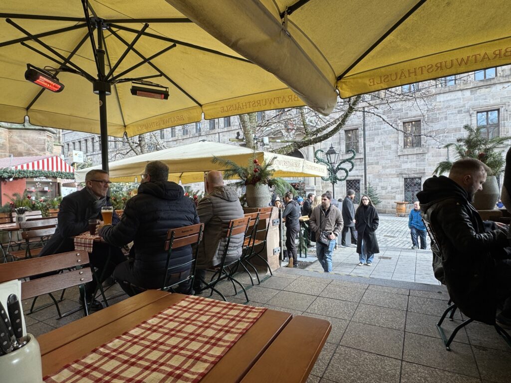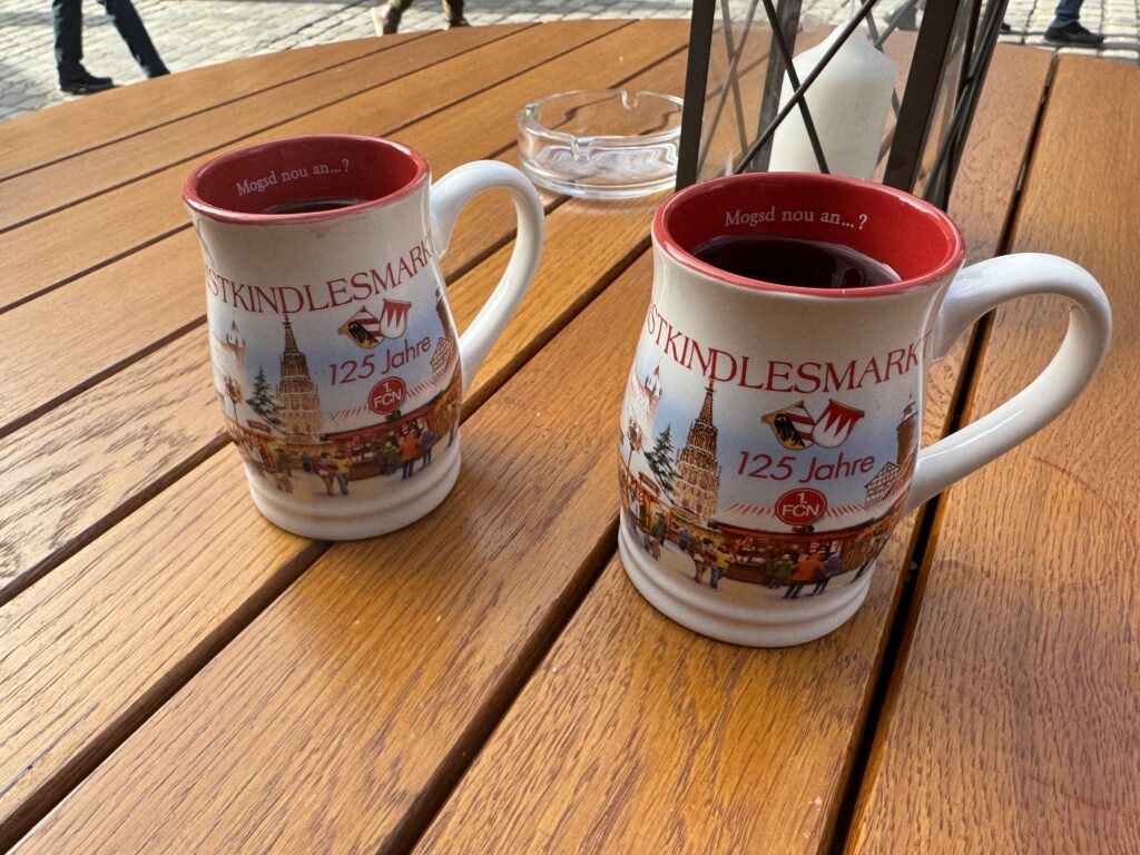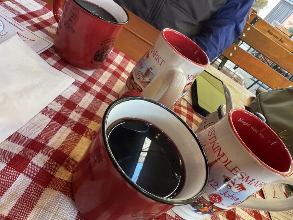 Apparently there is a conflict over who has the best sausages, Nuremberg or Regensburg. We visit Regensburg tomorrow so we decided to do a taste test. We ordered the sausages with sauerkraut and potato salad. It was also served with a spicy mustard. To accompany our sausages we, of course, had to have a mug of the house Glüwein.