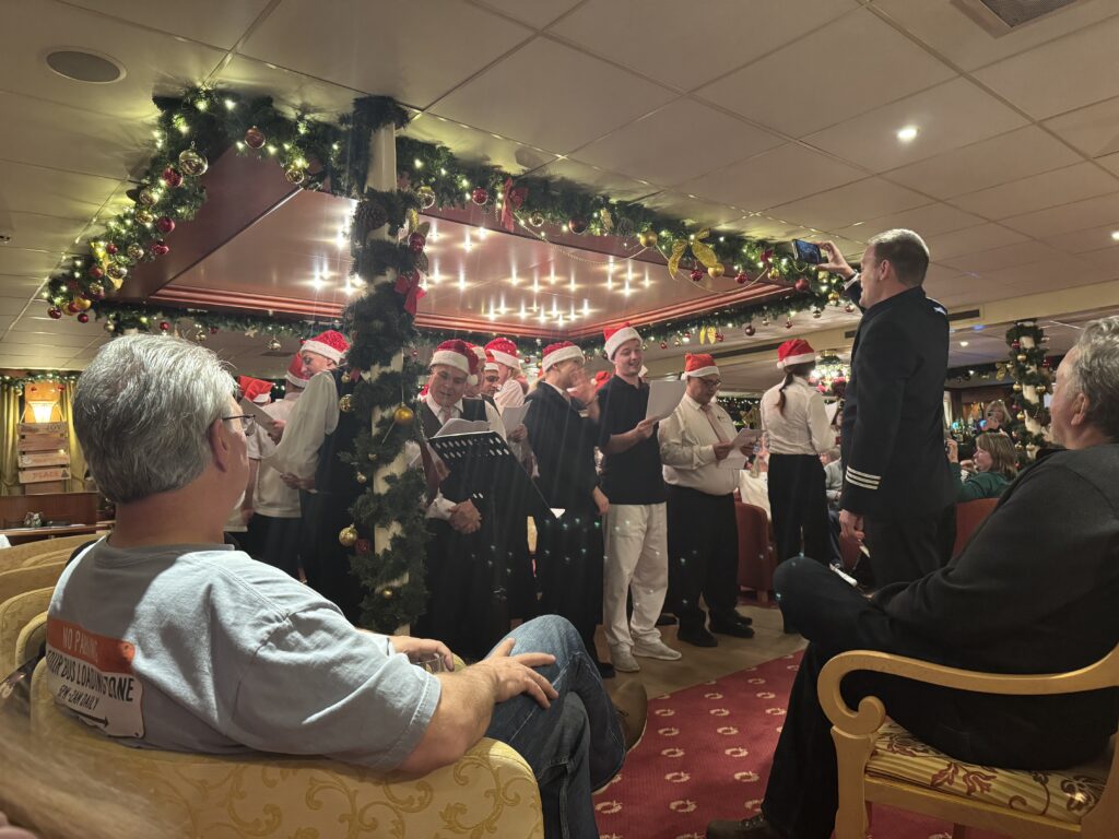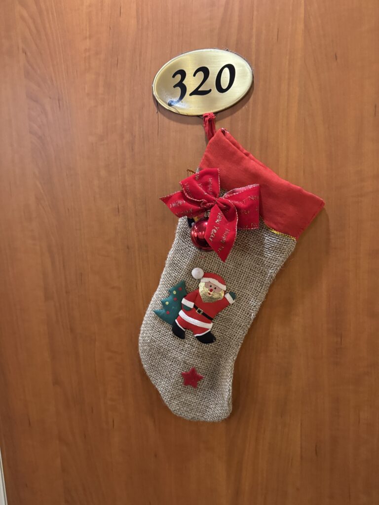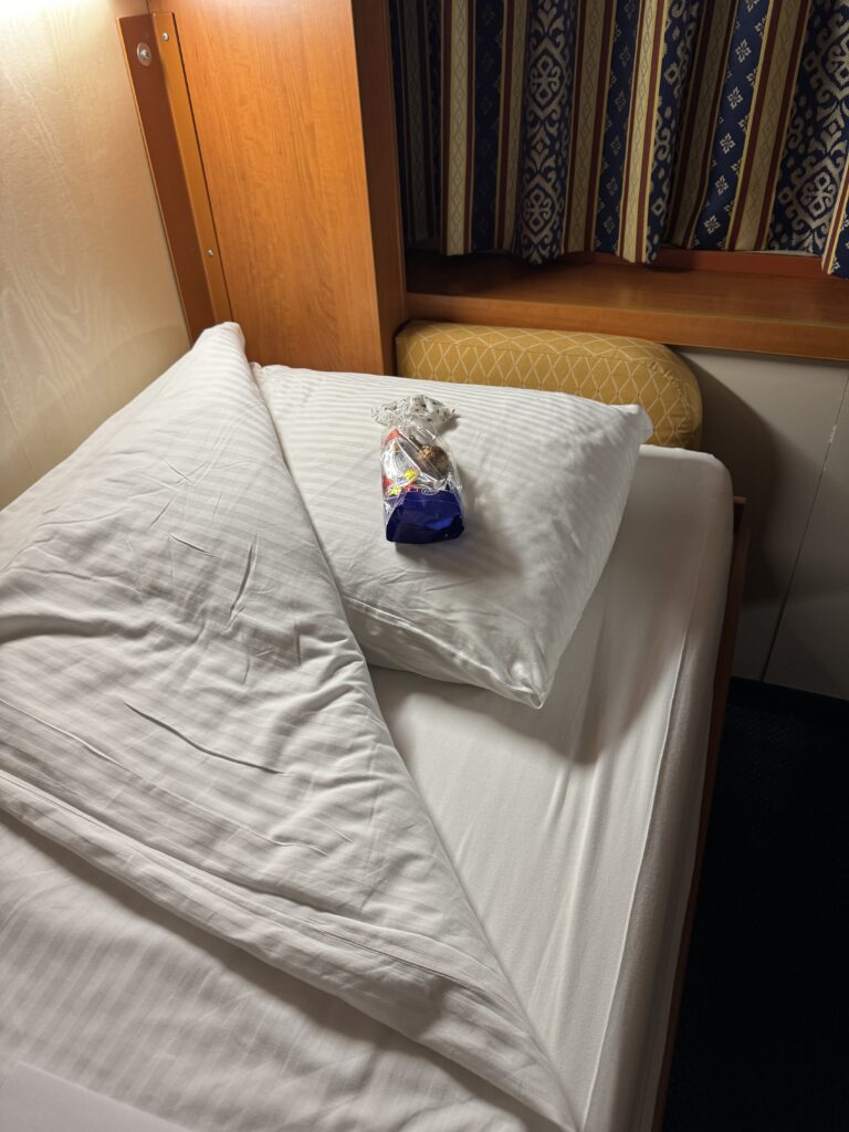 After unpacking and a short rest, we headed to the lounge to have a drink, hear the Captain’s safety talk, and meet our Program Directors. Then off to our first dinner on the ship. We were wiped out from our travel day, so after dinner we headed back to our cabin to unwind and found our first surprise. Our beds were ready for sleeping and we had a chocolate Santa on our pillows!