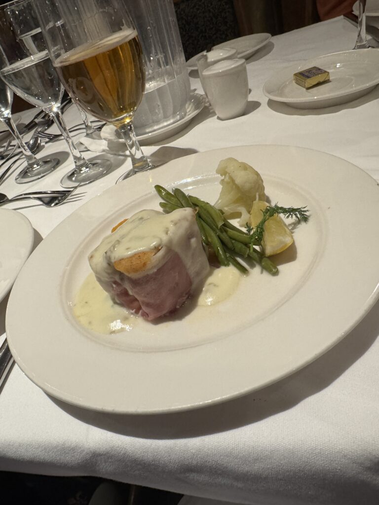 We caught our shuttle and made our way back to the ship in time to see a beautiful sunset from the sundeck. Thankfully, Robert is really good at these pictures because it was too cold for me. Then we headed for the lounge for the Captain’s Cocktail Reception and Welcome Dinner. Seven courses consisting of an array of appetizers, a choice of Whole Pink Grilled Veal Loin or Pan-Fried Cod wrapped in prosciutto. Dessert was a choice of Crème Brûlée with vanilla ice cream and a Belgium waffle or a raspberry sorbet. I ordered the brûlée as it is one of my all-time favorites.