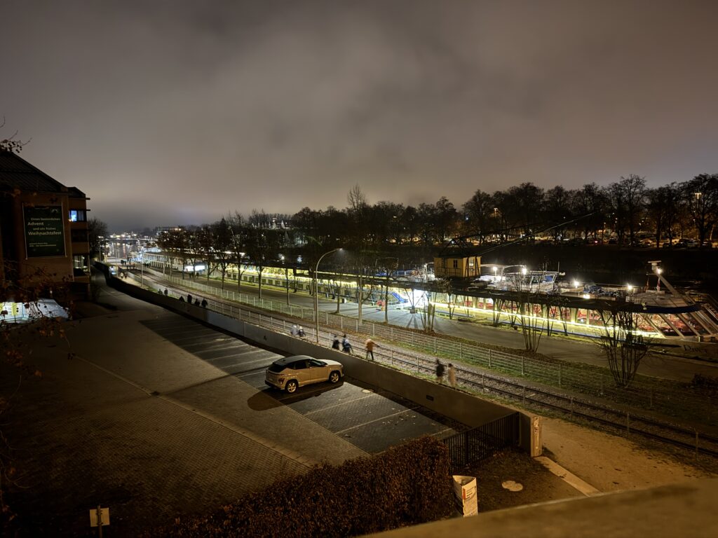 After the nap we headed out to find a Christmas market. So the only good thing about it getting dark at 5:30 is that the lights come on early. Of course our first task was to get some Glühwein. At 46 degrees it isn’t frigid, but nothing like a nice mug of Glühwein to warm you up from the inside. At the Christmas markets the Glühwein is about 4-5 euros. However the first time you order you pay a deposit on the mug. Each market has its own mug but refills are available no matter which mug you have. If you return the mug (to any stand) you get your deposit (4 euros) back or keep the mug and just count the 4 euros to a unique souvenir to take home (or use at the next market.)