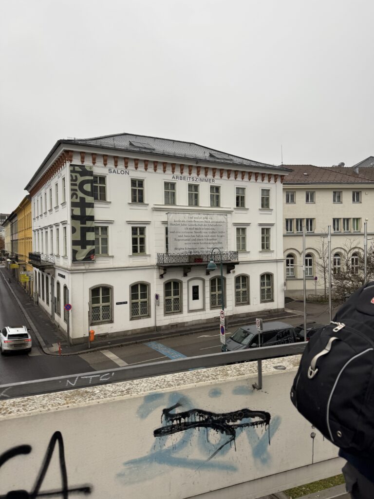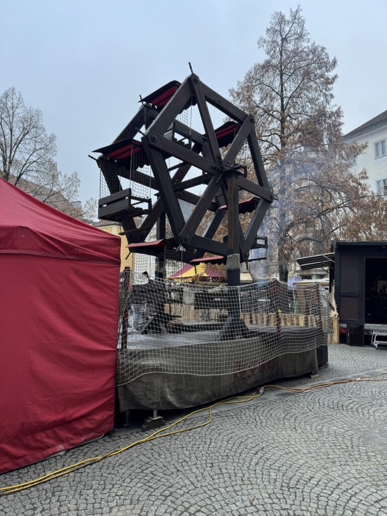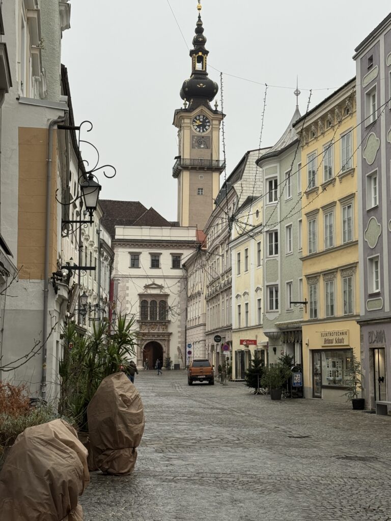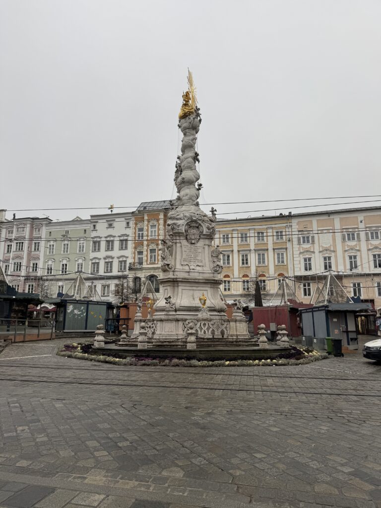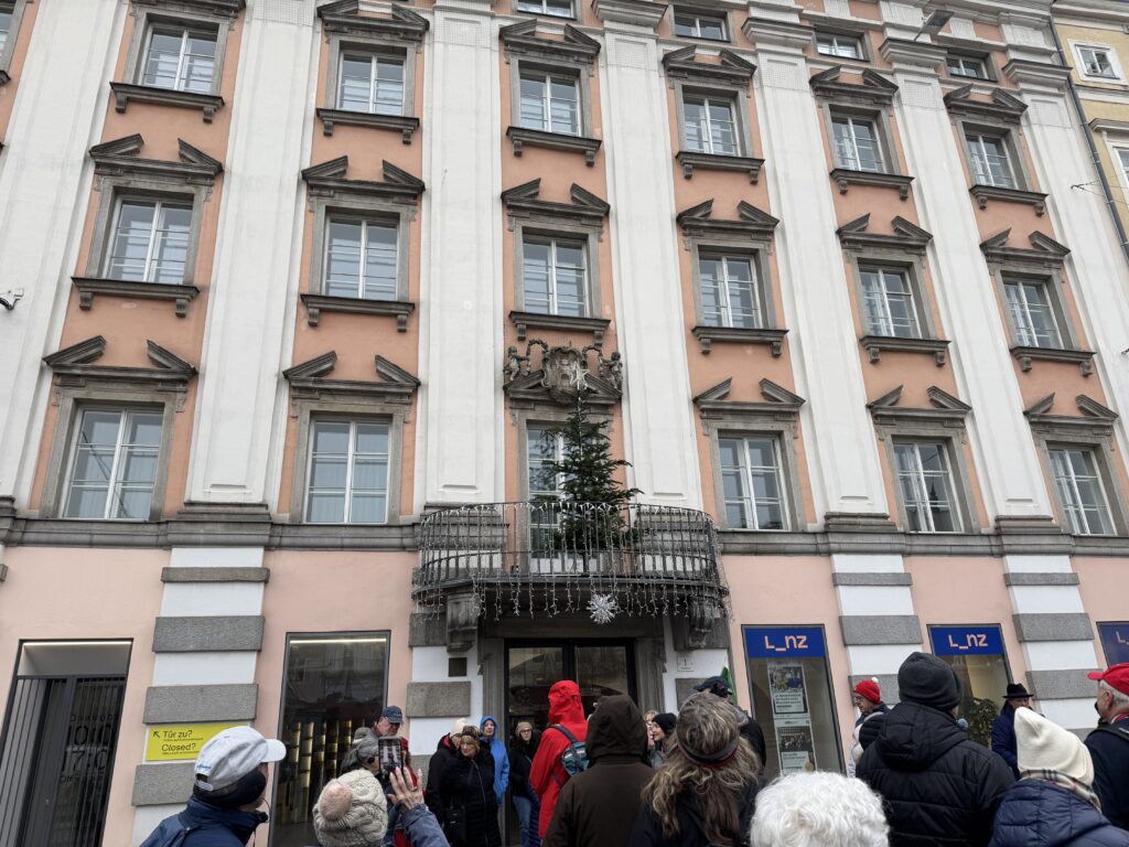 We are now in Austria!! Our day started out with a walking tour led by a local guide. We started out along the river where we saw the Lentos KunstMuseum (the Lentos Art Museum.) If you didn’t know what it was – look closely, it’s written all over it! Some of our fellow passengers took a day trip to Salzburg. When the guide asked us what Salzburg is famous for, most of our group said, “The Sound of Music.” However, in Austria that is not the case, most Austrians have never seen the movie. Our guide explained that when the movie came out, Austrians were still trying to put the war out of their minds, so very few people saw it and it was never in the theaters. Now, it’s just another old movie. We made our way to the Hauptplatz (the main plaza) where the vendors were just setting up for the Christmas Market. The monument with the gold on top is a monument giving thanks for those who survived the black plague in the 18th century. Then we moved on to a beautifully decorated balcony. This particular balcony has historic significance as it is where Adolph Hitler announced the Anschluss to the citizens of Linz, Austria. Our guide explained that Austrians are now interested, as are the Germans, in talking about and teaching about the war since they want to make sure that it is never repeated.