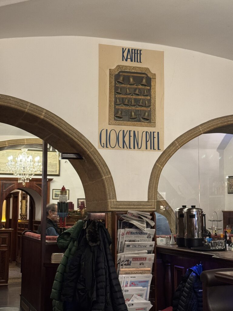 Our first order of business was to find some Austrian coffee. We heard that the Austrians take their coffee very seriously. Our Program Director, Bob, told us to order ein brauner. He directed us to a coffee shop across the Christmas Market which was called Kaffee Glockenspiel. The name was quite appropriate as the building had a glockenspiel on the top.