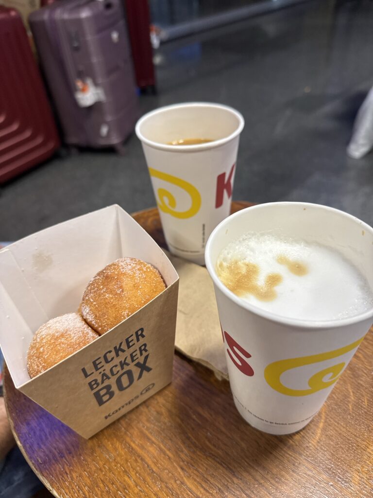 Our flight was relatively uneventful and even with a delay in taking off we arrived in Frankfurt on time. Unfortunately the line for immigration was horrendous and we missed our shuttle to Heidelberg by minutes. According to the website if you miss your shuttle you are to wait for the next shuttle and will hopefully get a seat. So now we wait…3 hours on a hard wooden seat in the Frankfurt airport. *sigh* At least there is a German bakery close to where we are waiting so a latte and a pastry and we settle in for a few hours.