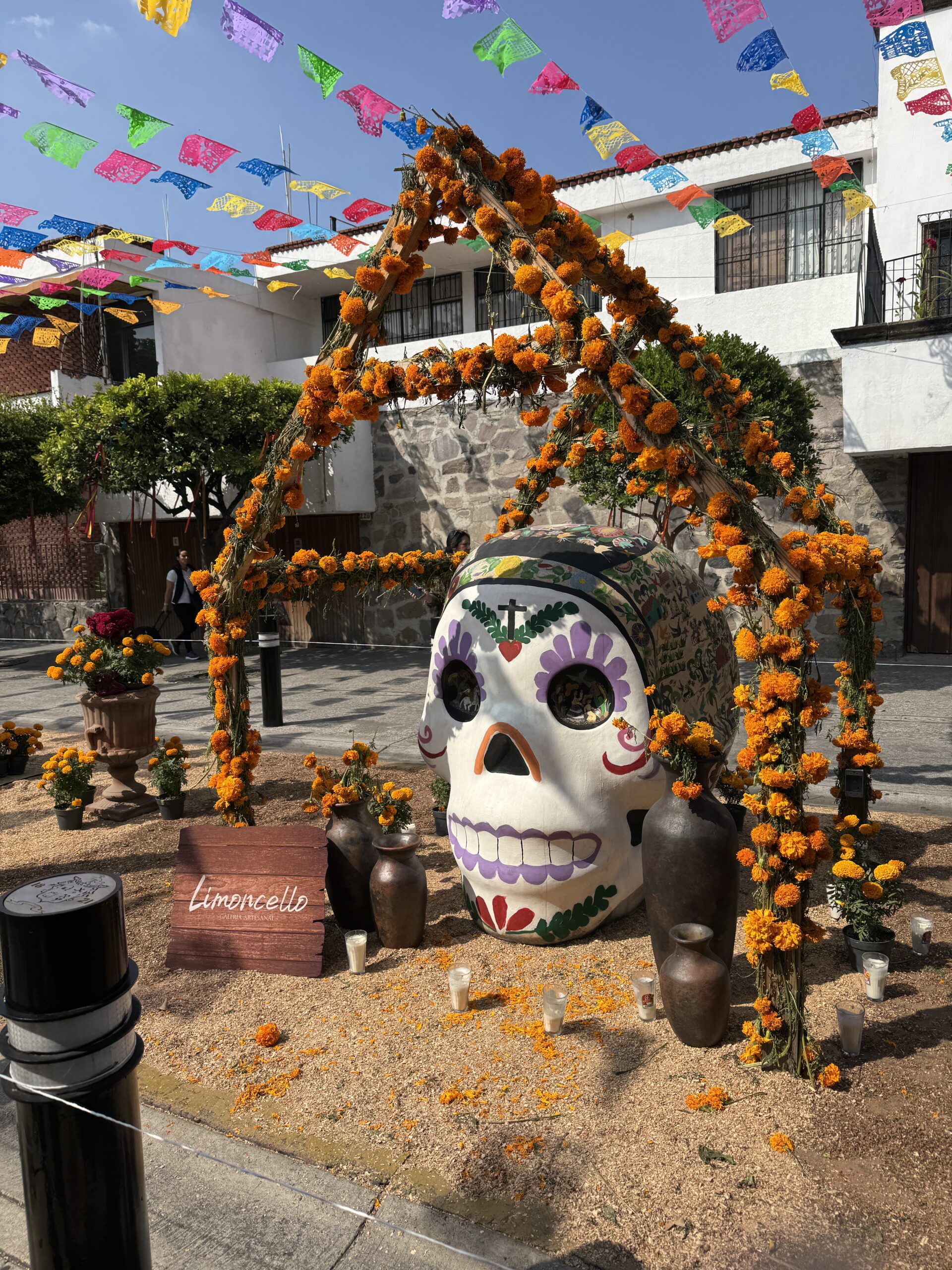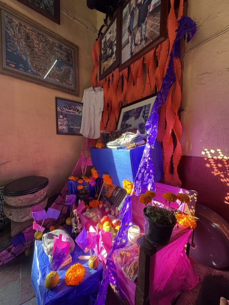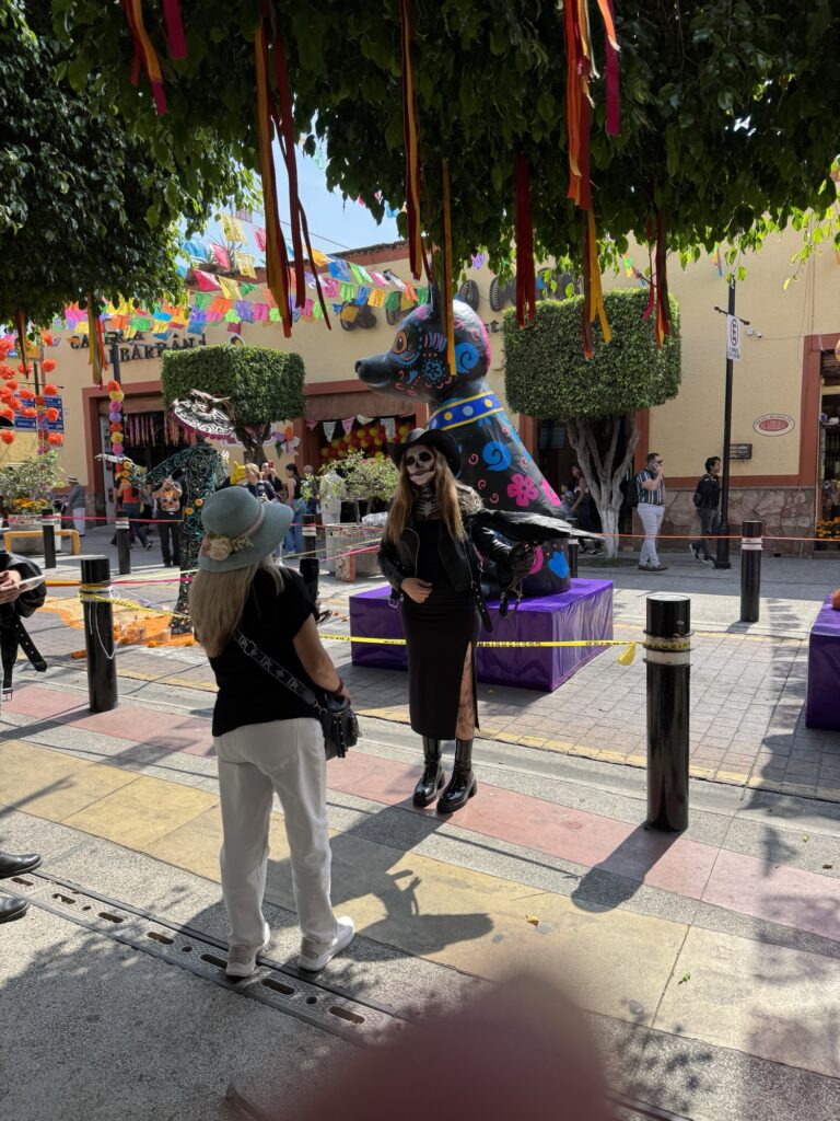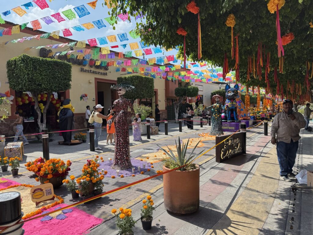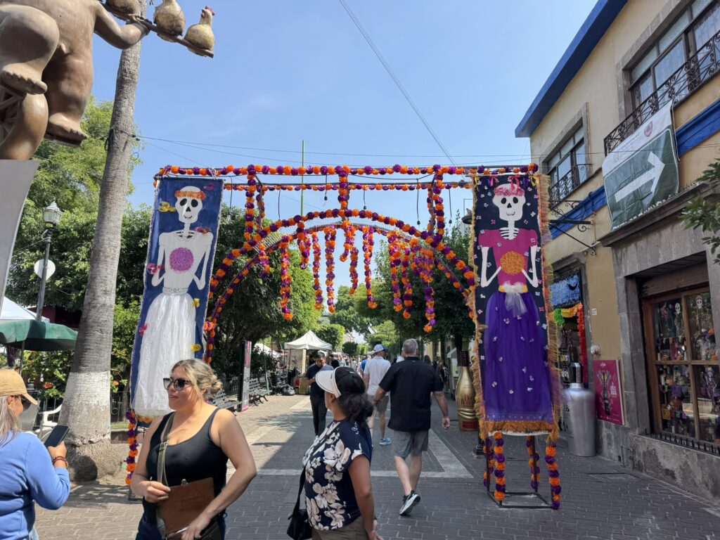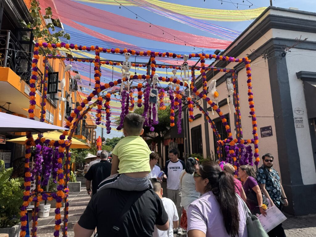 Once we dropped off our luggage, it was time to explore Tlaquepaque! The decorations were phenomenal. Ofrendas (memorial altars) for those passed on occupied the middle of the pedestrian streets. Marigolds were everywhere to be seen. Many of the pedestrians were decked out for the holiday with coronas (floral crowns) and painted faces.