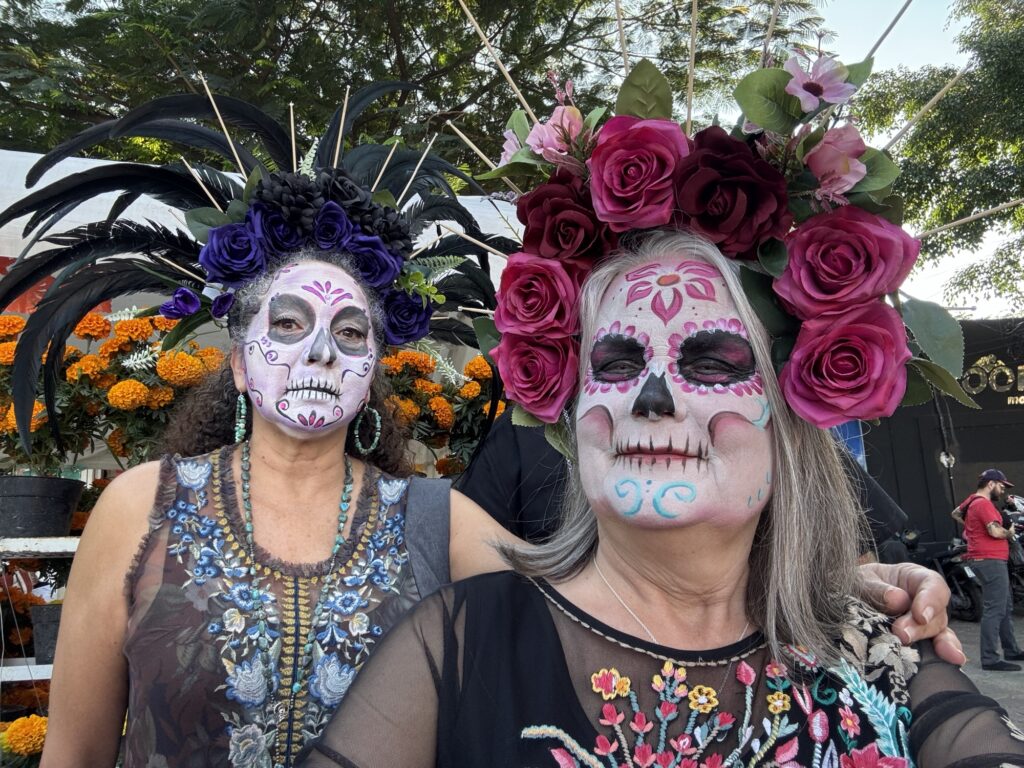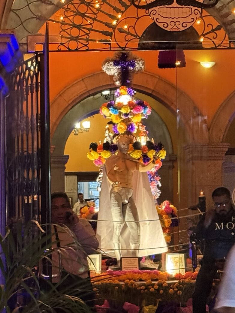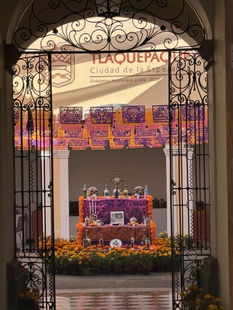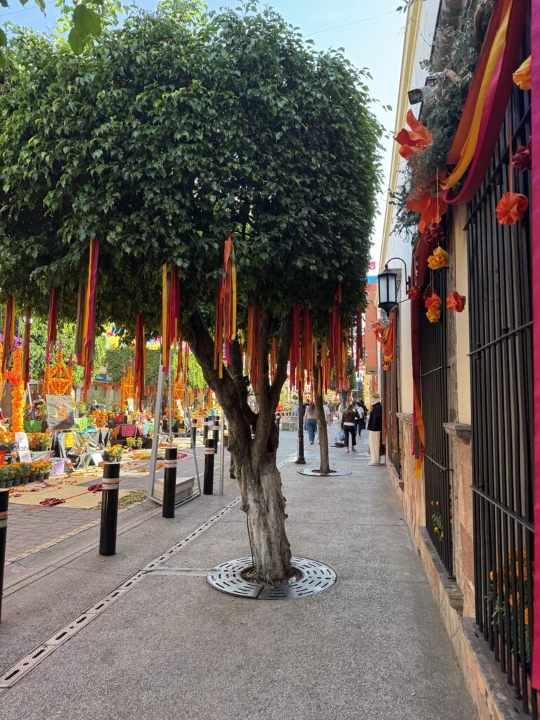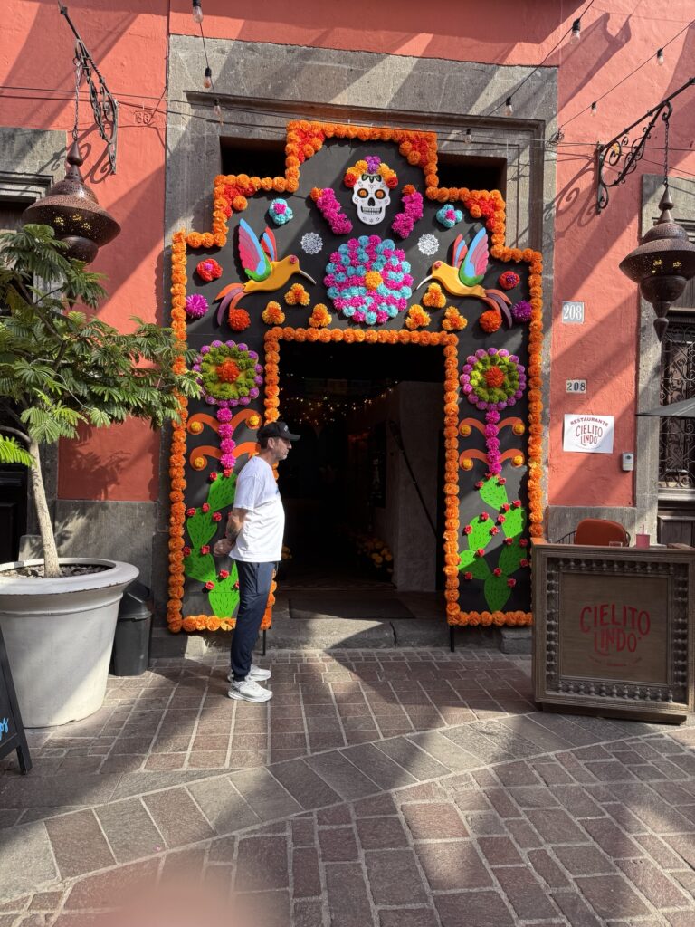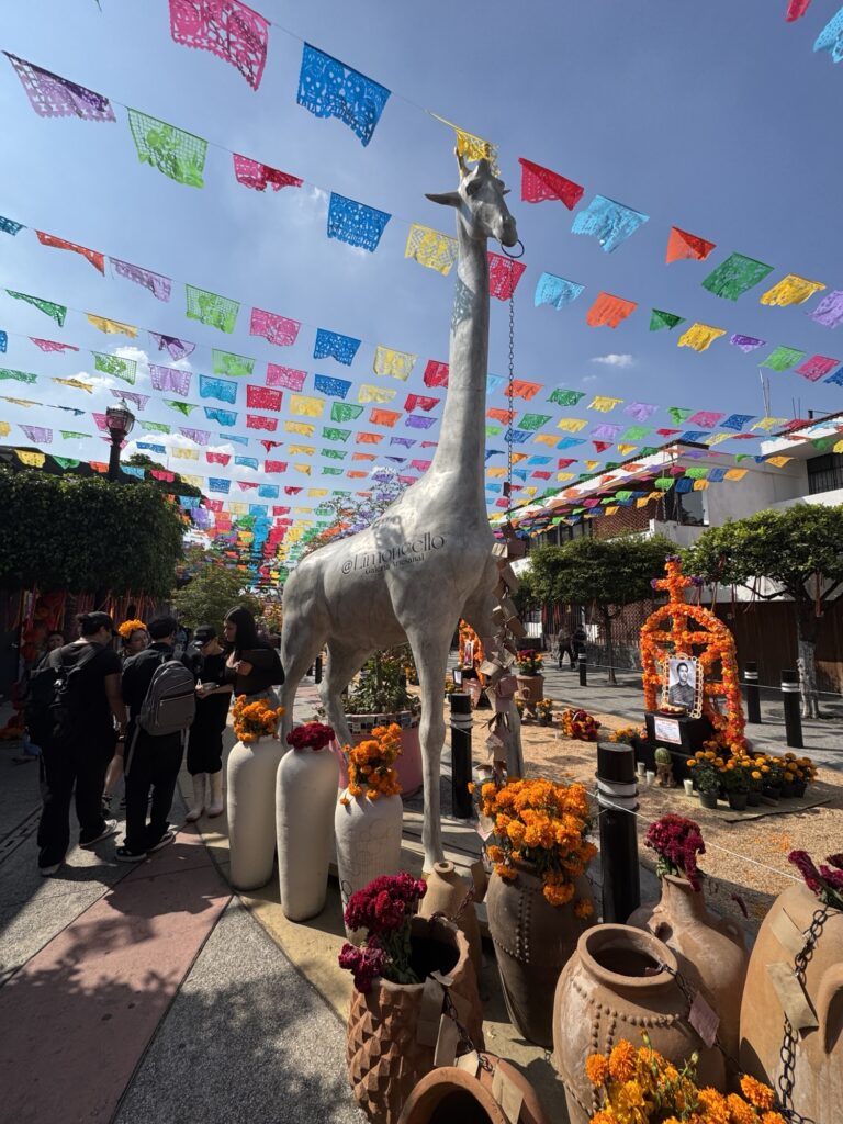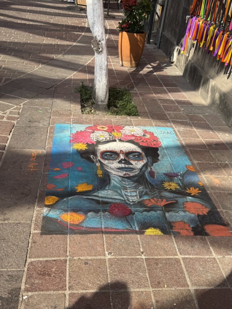 Once we dropped off our luggage, it was time to explore Tlaquepaque! The decorations were phenomenal. Ofrendas (memorial altars) for those passed on occupied the middle of the pedestrian streets. Marigolds were everywhere to be seen. Many of the pedestrians were decked out for the holiday with coronas (floral crowns) and painted faces.