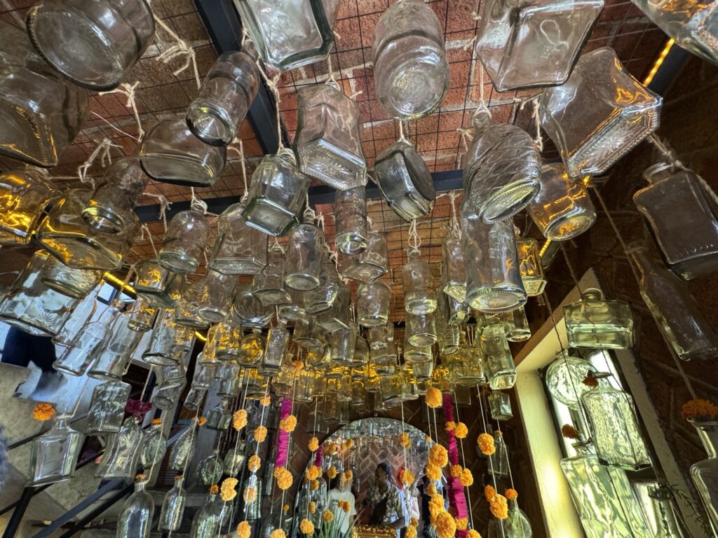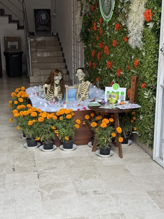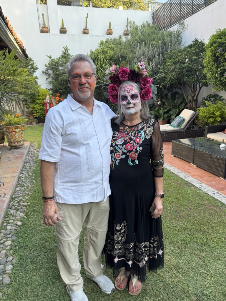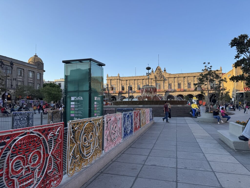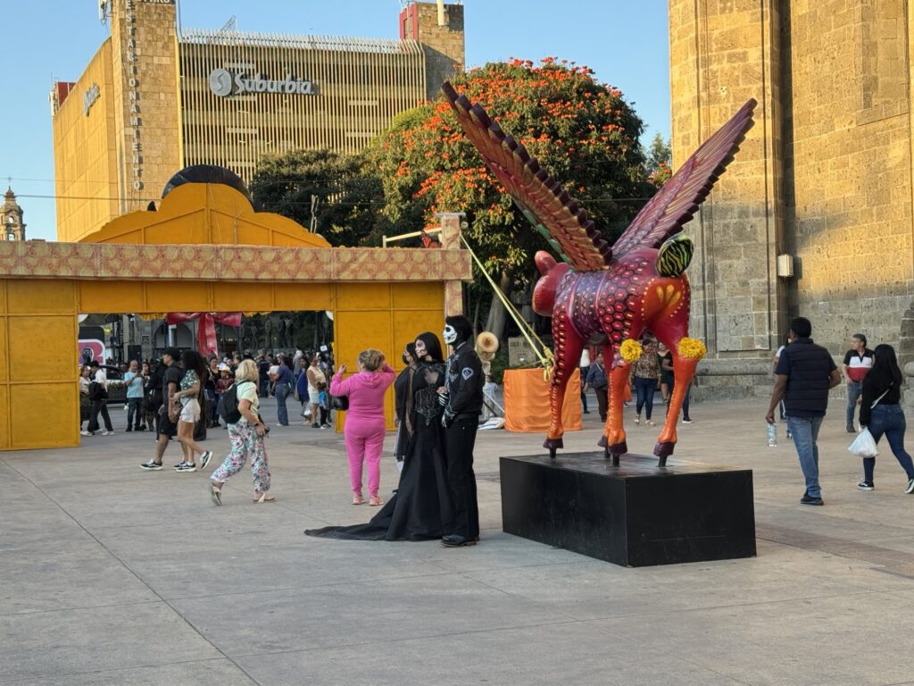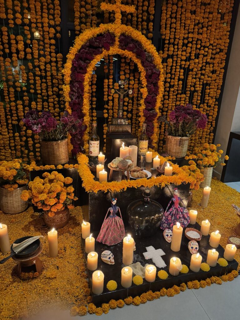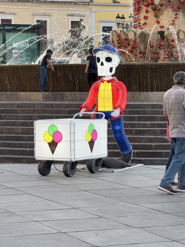 Once we dropped off our luggage, it was time to explore Tlaquepaque! The decorations were phenomenal. Ofrendas (memorial altars) for those passed on occupied the middle of the pedestrian streets. Marigolds were everywhere to be seen. Many of the pedestrians were decked out for the holiday with coronas (floral crowns) and painted faces.