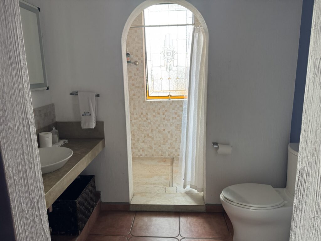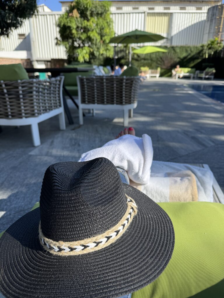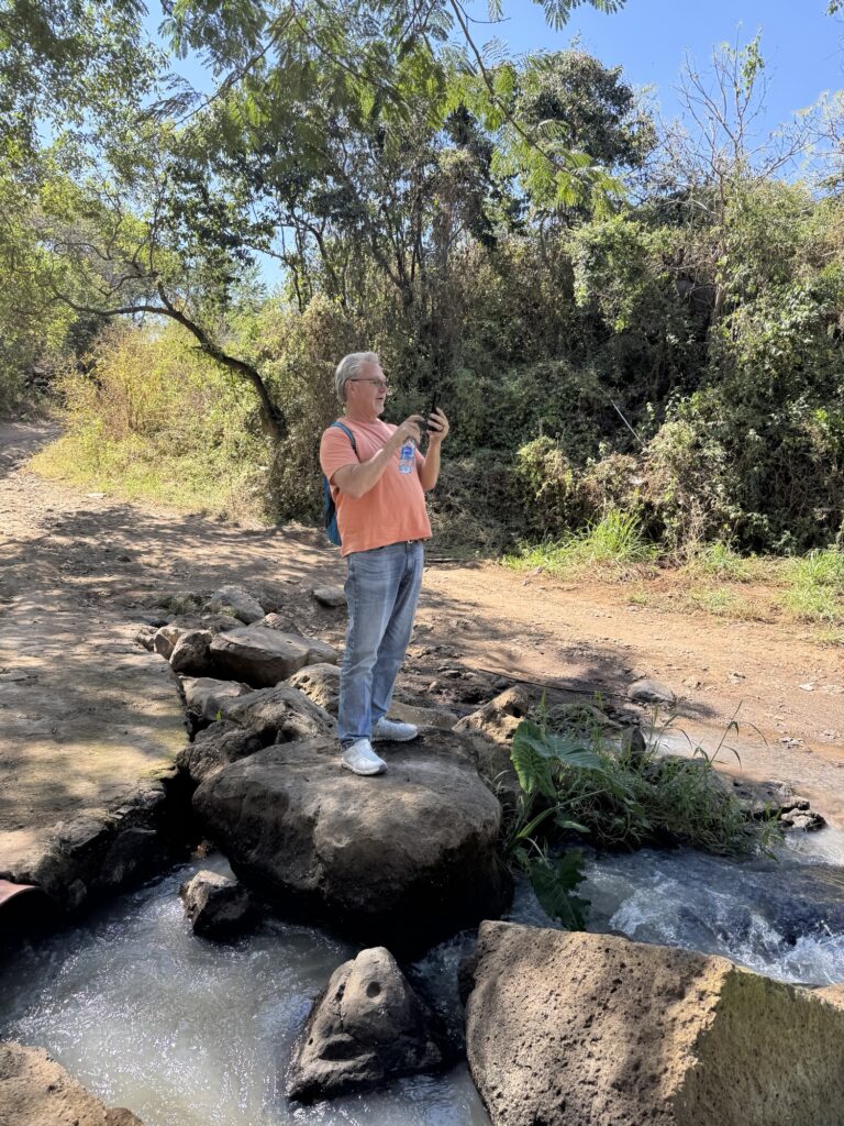 We were treated to a taste of the “jungle juice” as it came off the still. (Robert was even allowed to put a little bit in his water bottle for later. 😉) Then we bade a fond farewell to our new friend, Humberto, and headed back down the mountain to our bus. Trekking through the mountain jungle is not without its dangers and, within sight of our bus, I slipped on some rocks and twisted my ankle. However, once we arrived back at Casa Salles, I found a lovely chaise by the pool and enjoyed a paloma or two for anesthesia. Fortunately tonight, dinner was at the hotel. While some of our group went into town to visit Ixtete and El Beso, I opted to stay at the hotel and nurse my ankle, saving it for tomorrow’s adventures.