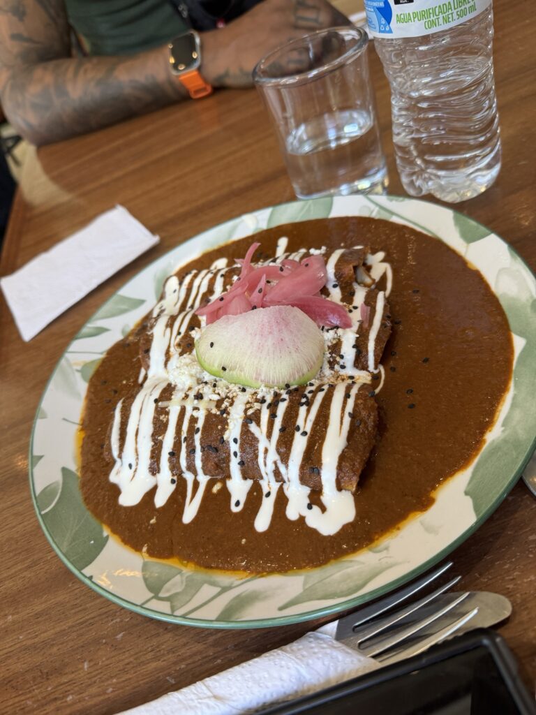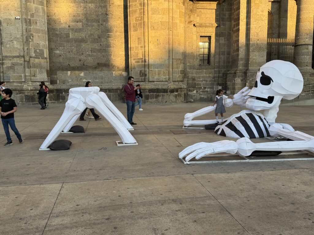 With a few more bottles and a few less pesos, we headed into Guadalajara for our last night in Mexico. For lunch we stopped at a restaurant around 2:30 pm to find that we could only order breakfast until 3:00 pm. So, enmoladas (basically enchiladas but with mole sauce) and a chai latte it was. From there we made our way to our hotel, a Doubletree in Guadalajara. We had a few hours to walk around and enjoy the sights which still sported decorations for Dia de los Muertos before leaving for our special treat this evening.