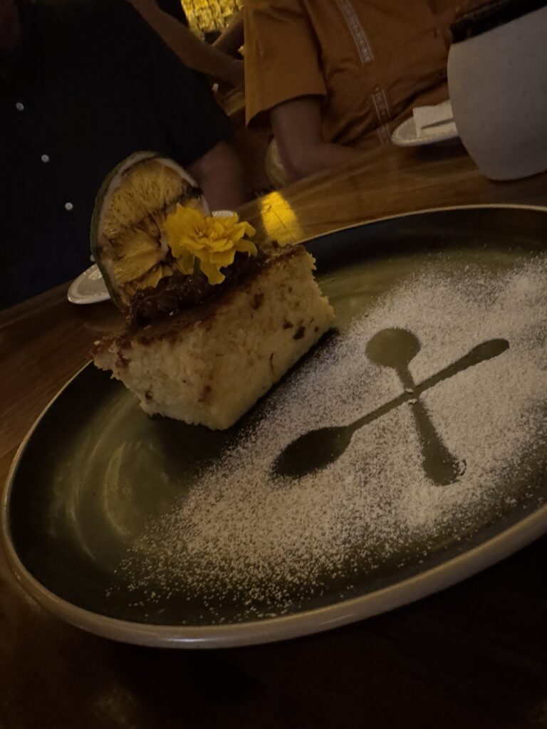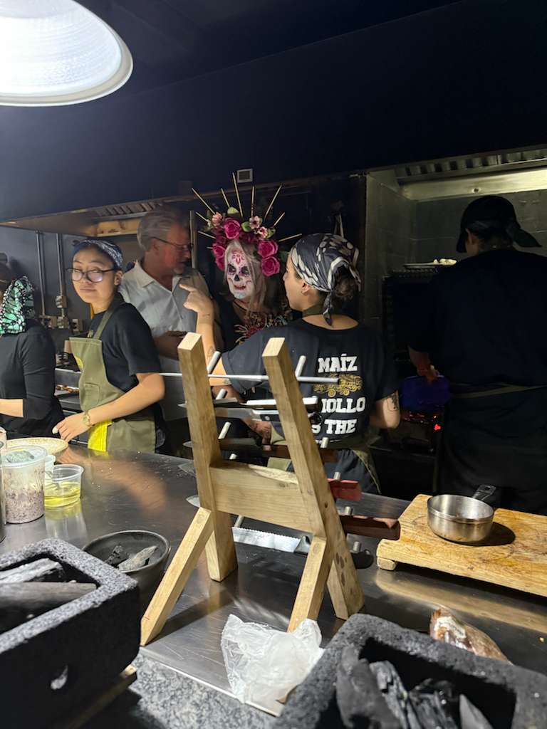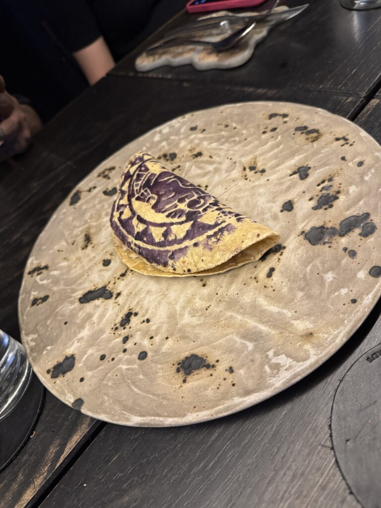 This was among the top five meals I have ever had in my life. If the meal wasn’t awesome enough, Robert was talking with the server and mentioned that he had spent time working in a kitchen. She offered to give him a tour of the kitchen. Did he ask if I could tag along? No! When he got up to to to the kitchen, I glared at him over the counter until the server asked if I would like to join to which I answered with a resounding, “Yes!” It was a very small kitchen, but we were introduced to every chef in the kitchen and were shown how they “stamp” the design on their corn tortillas. Hint: they brush an edible purple tincture on an iron stamp then they set the tortilla on top. From there they place the tortilla on the comal to cook. We were also shown the molcajete where they crush the ingredients for the salsa and, finally, we met the bartender, who I commended for his creative cocktails and we returned to our seat for dessert.