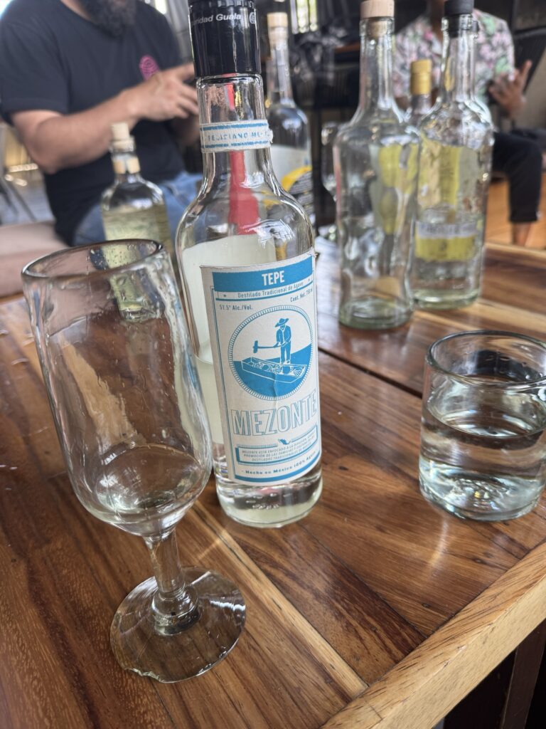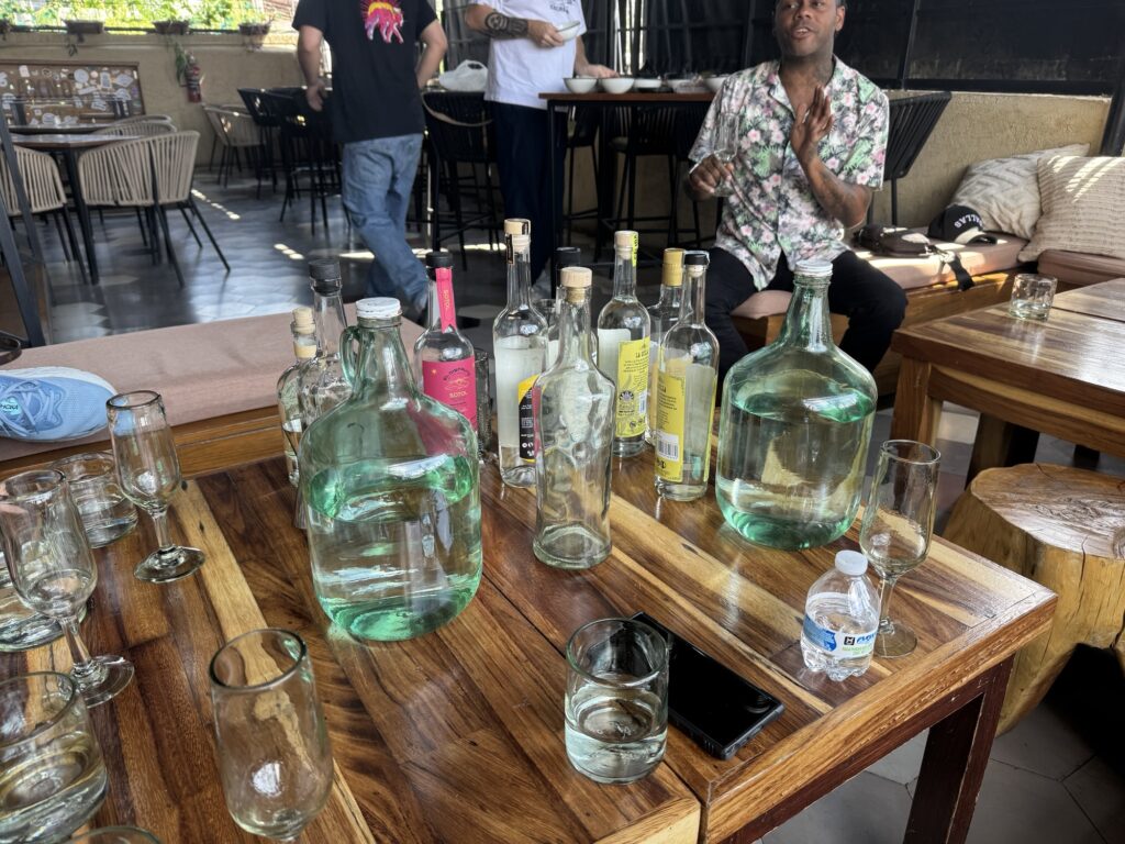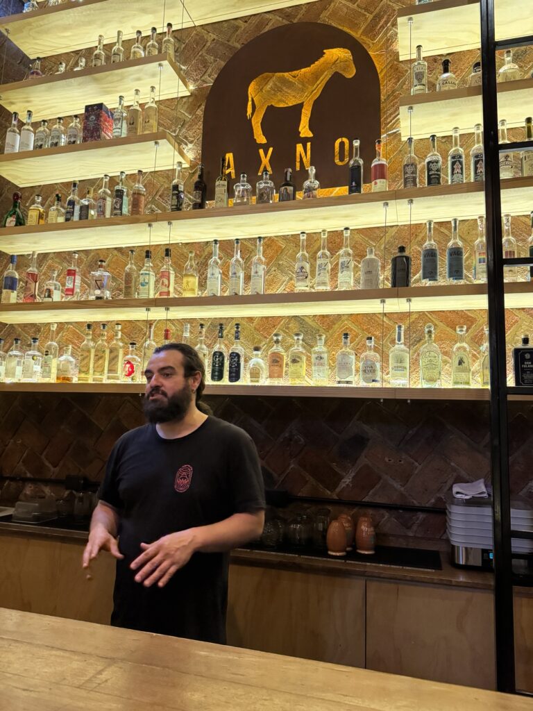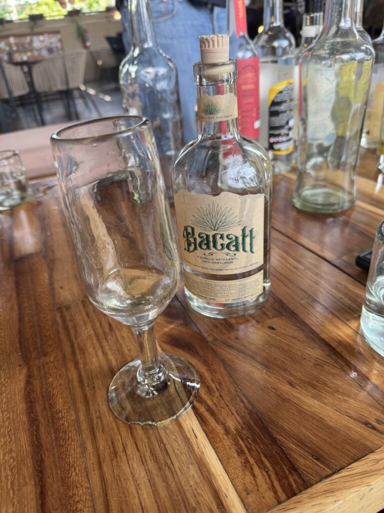 Today we head for our first tequila tasting! Our original venue for the tequila tasting cancelled on us so, a quick call to Pancho and, Blaine had another tasting set up at Axno with Espiritu. At Axno, Espiritu explained that he had many tequilas with which we were acquainted, but today we would be tasting other agave distillates that are produced in much smaller batches. We were introduced to raicillas, sotols, and palmillas as well as a couple mezcals. These are all made from agave but are not considered tequila.