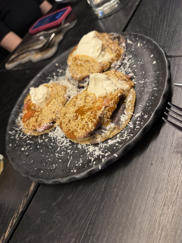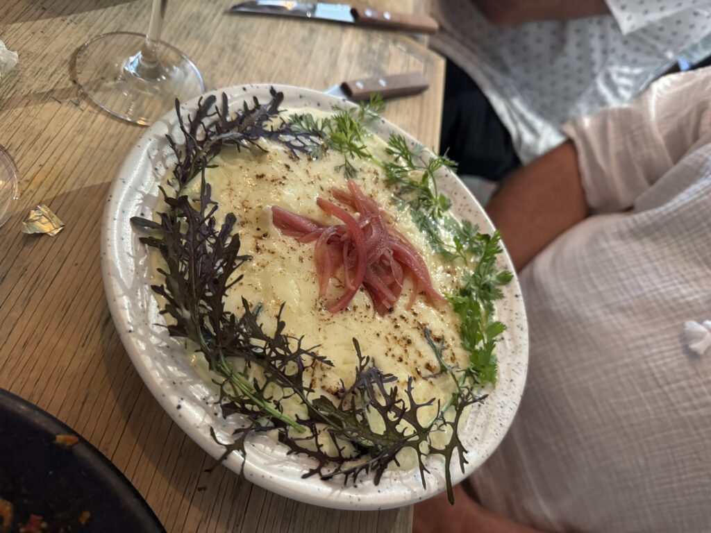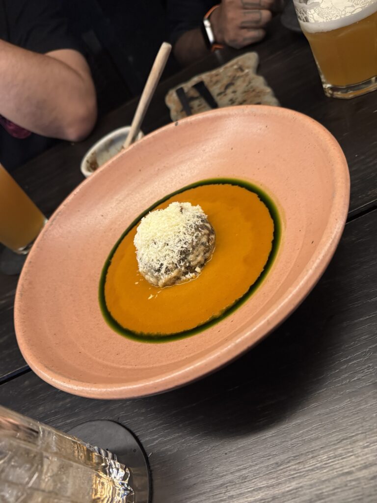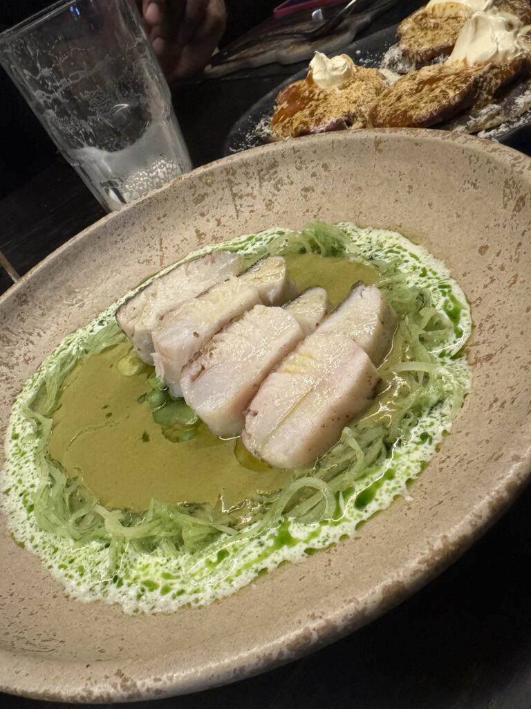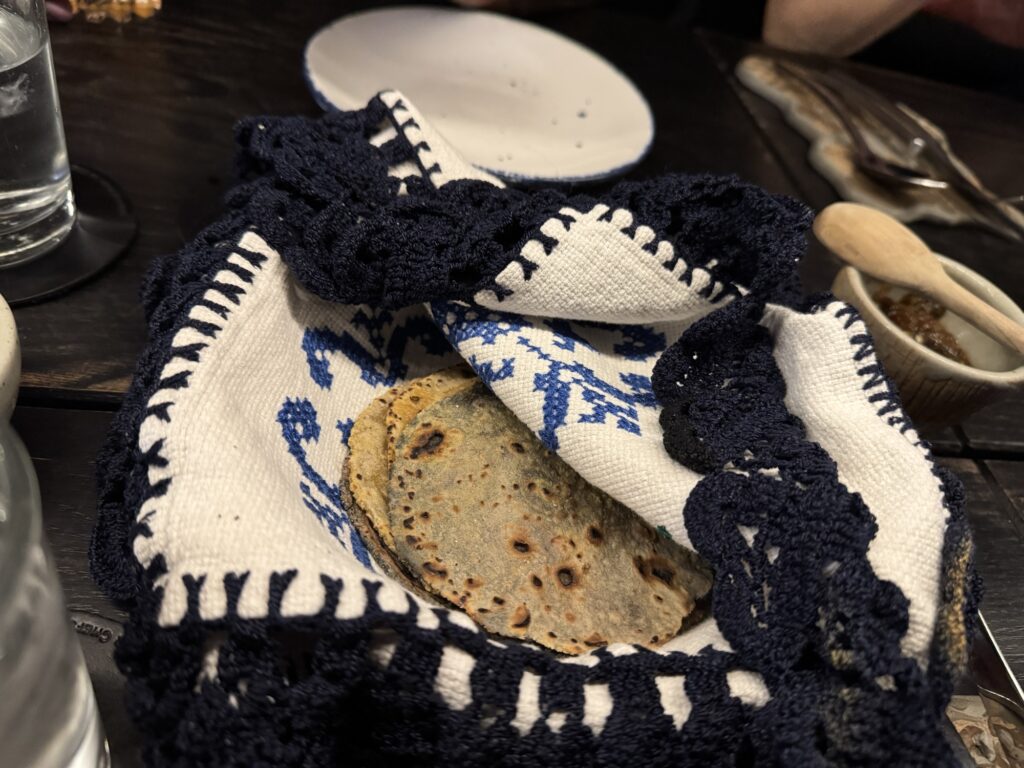 First, we all ordered drinks. Robert ordered a paloma and I ordered something called, a Pulque-Tiki. I don’t remember everything in the drink but it had pineapple juice, lime juice, and pulque (an ancient alcohol made from the fermented sap of the agave plant.) It was served in a clay cup topped with a crisp that crumbled in my hand and a quenelle (football shape) of mango sorbet. It was so good I ordered another one with dessert.