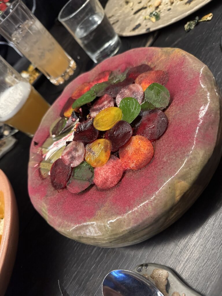 The second course had a tortilla stuffed with pork, a salad of thinly sliced beets and radishes with creamy and tart goat cheese, and a fresh tamale in a spicy broth.