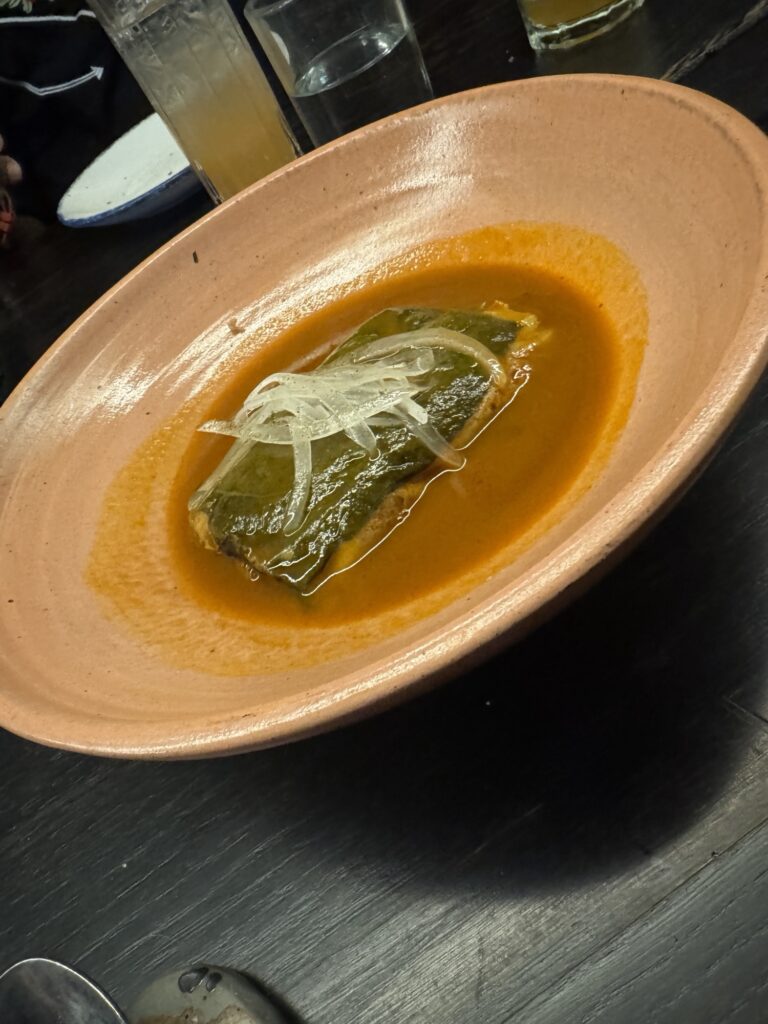 The main course consisted of bean and cheese tostadas, short ribs in an amazing mole sauce, and freshly grilled fish in an herbal broth with peas and lima beans. I’m not normally one to fawn over fish, but this fish was amazing even if there were peas and lima beans in the sauce!