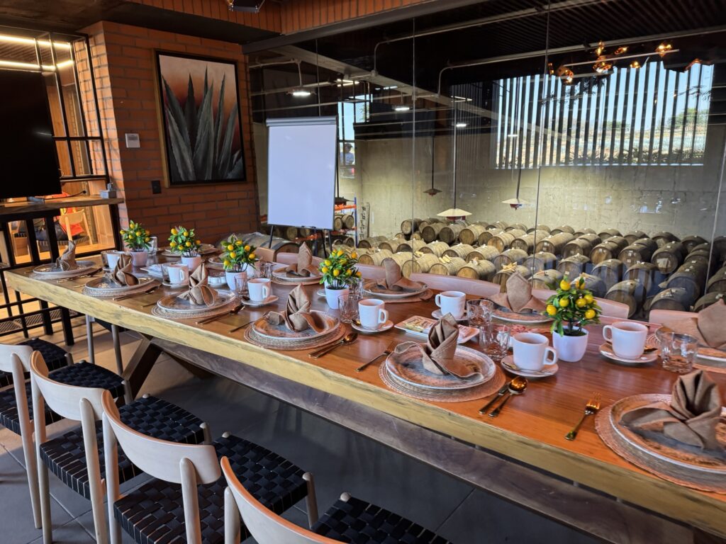 Cazcanes welcomed us with a large Mexican breakfast of chilaquiles and roast pork as well as Mexican pastries. This was a good start to the day since we would be tasting a lot of tequila. Our breakfast table overlooked the barrel room where the tequila was being aged.